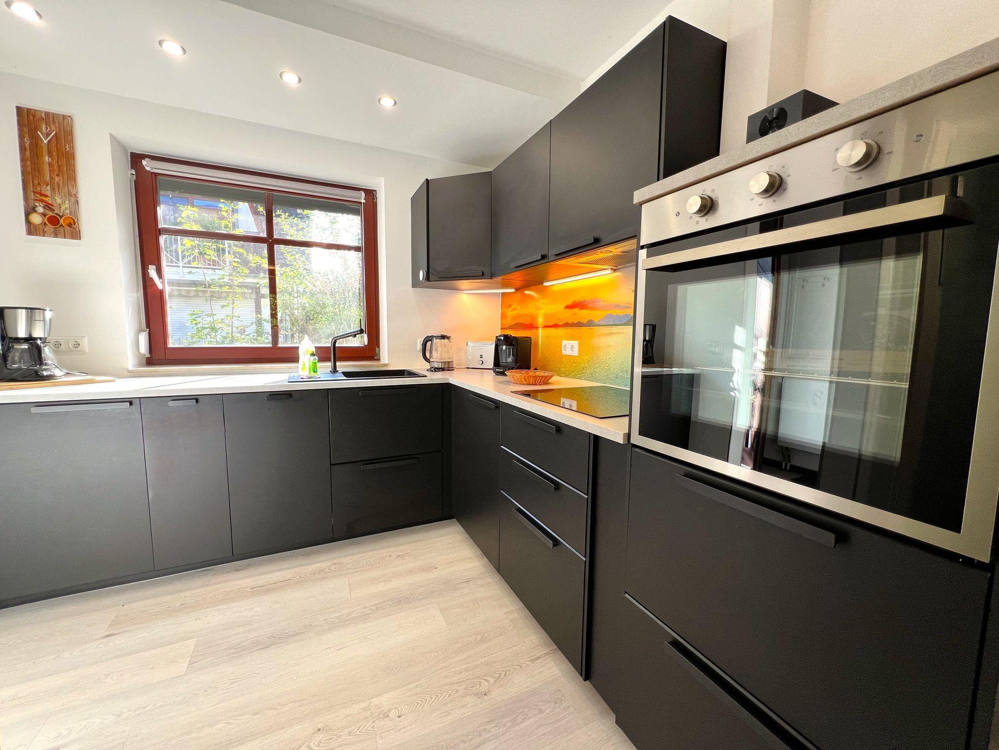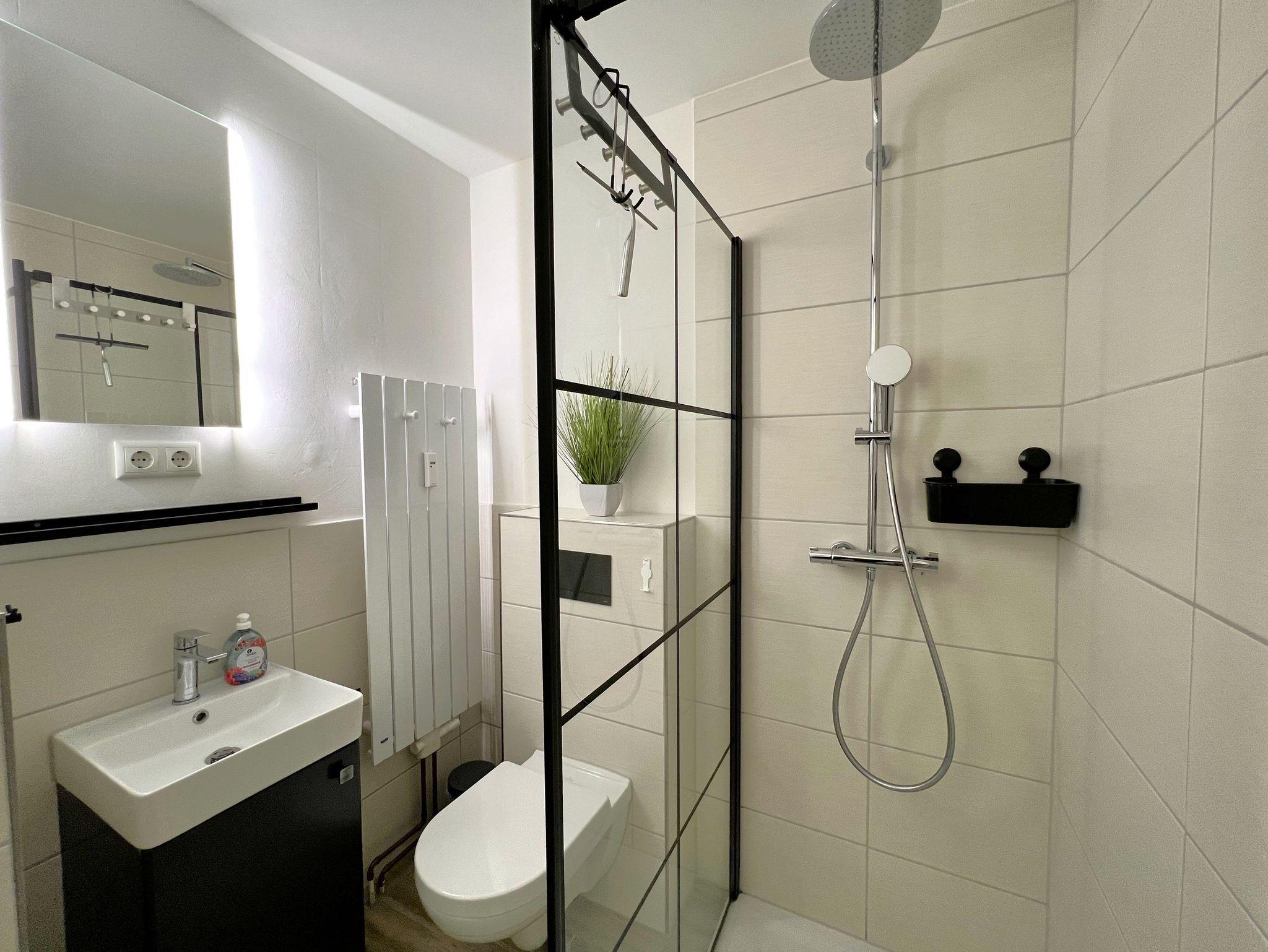 Diese moderne 1-Zimmer-Wohnung besticht durch ein lichtdurchflutetes Wohnzimmer mit direktem Zugang zur Terrasse und einem gepflegten Garten. Die offene Küche ist in elegantem Schwarz gehalten und bietet hochwertige Elektrogeräte sowie ausreichend Stauraum. Das stilvolle Badezimmer überzeugt mit einer großzügigen Regendusche und modernen Details. Der Außenbereich mit Sitzgelegenheiten lädt zum Entspannen ein und bietet viel Privatsphäre durch die dichte Bepflanzung. Diese Wohnung vereint Komfort und Stil in einer ruhigen Lage und ist ideal für Singles oder Paare.