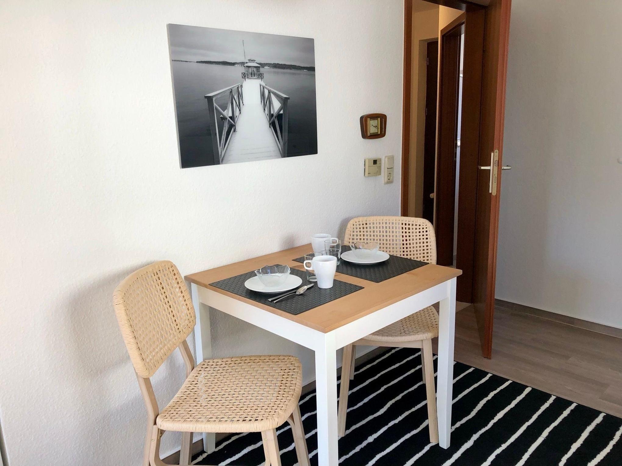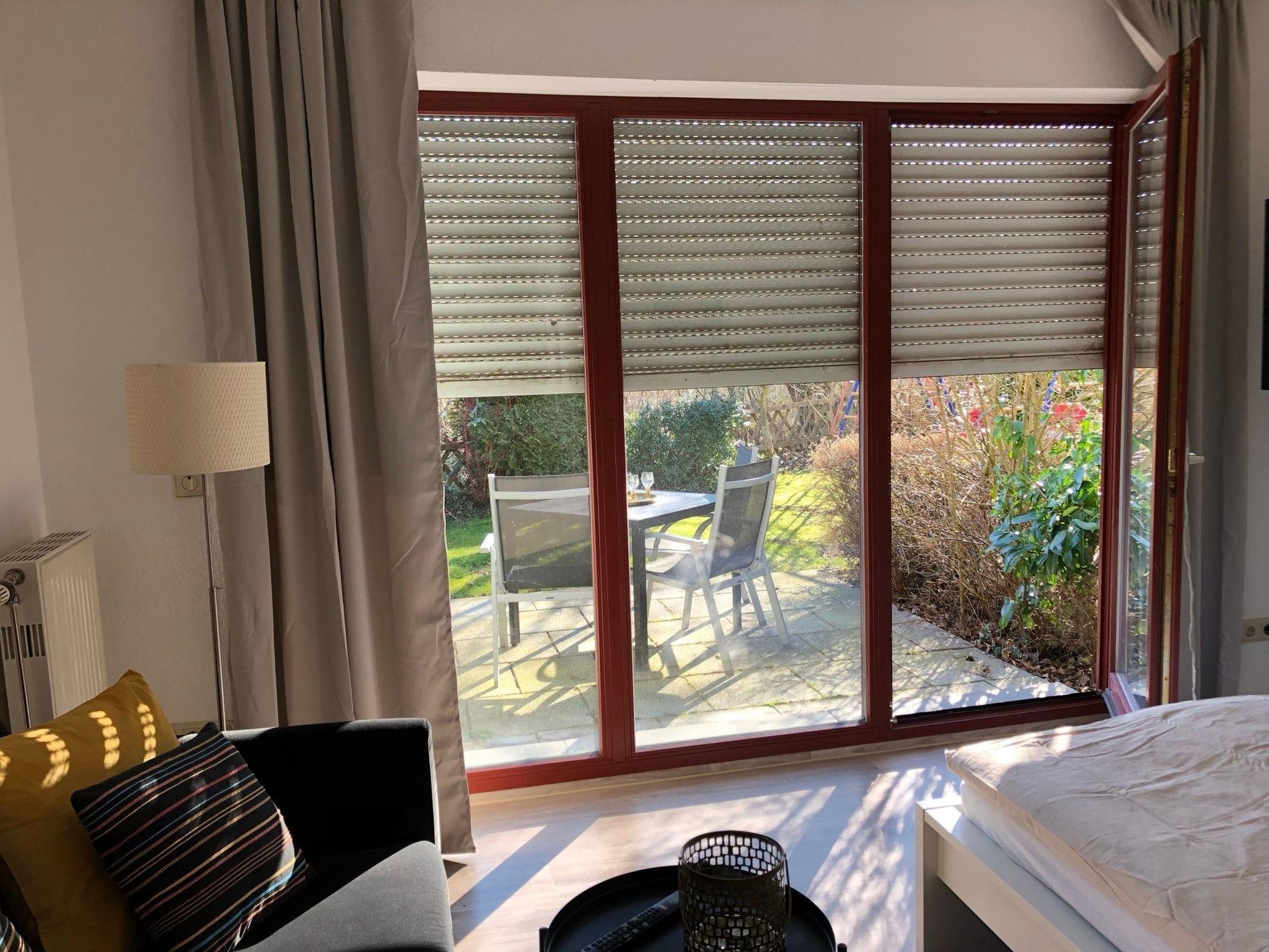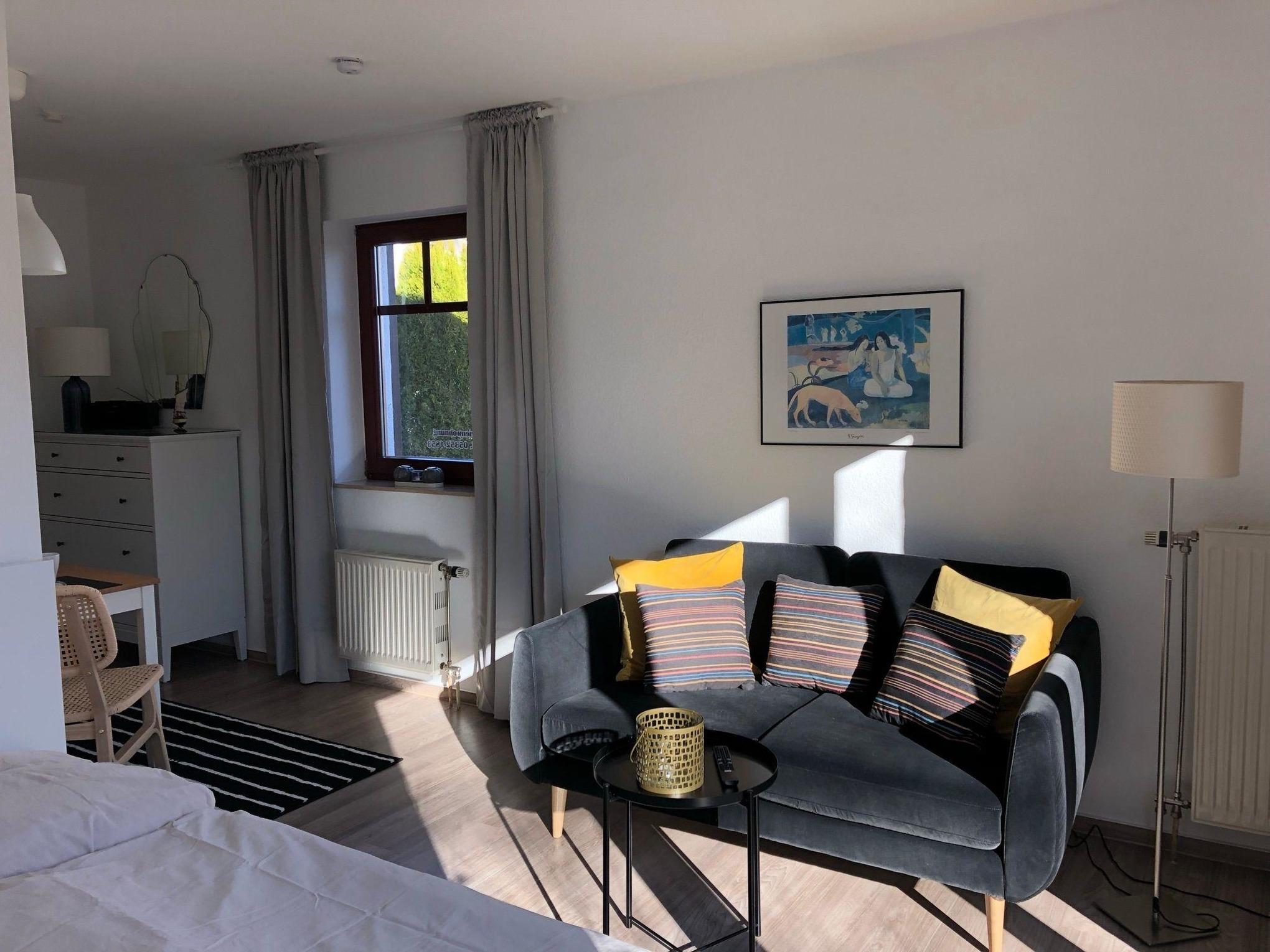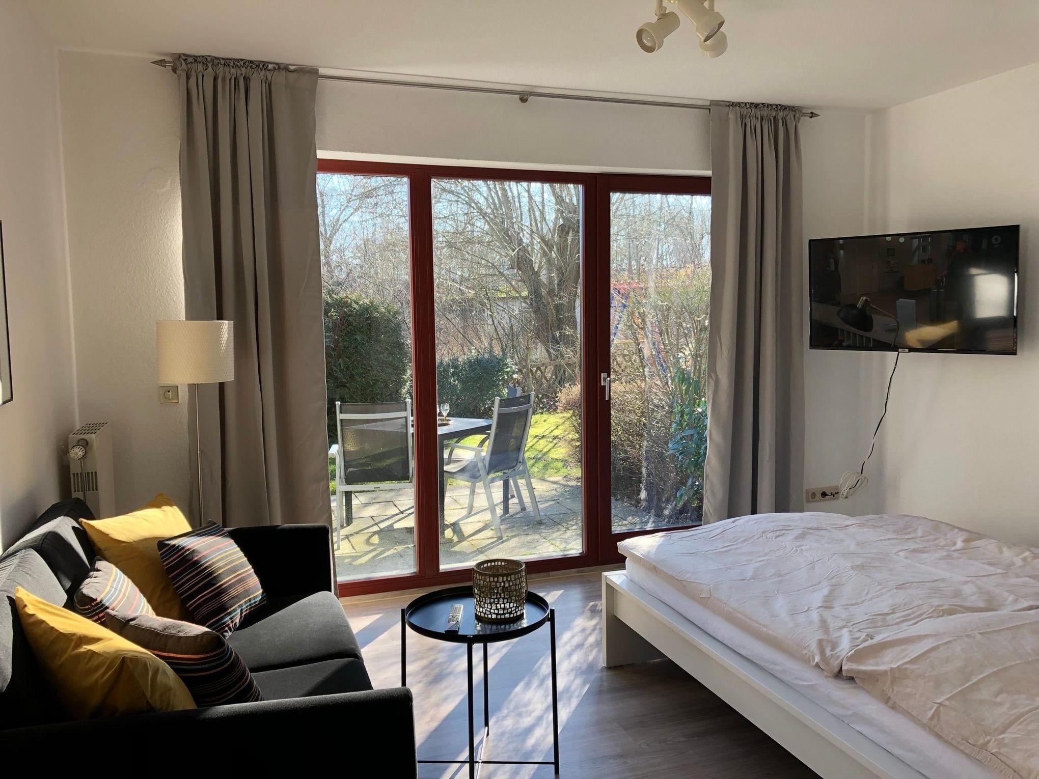 Unsere Ferienwohnung C23 "Klaus Störtebeker" ist ein 34 qm großes Einzimmerappartement im Erdgeschoss unseres Ferienhauses mit insgesamt vier Ferienwohnungen. Die Wohnung ist im skandinavischen Stil eingerichtet. Sie ist hell und gemütlich und wurde 2022 renoviert und neu möbeliert. Das Wohn- und Schlafzimmer ist mit einem 140 cm breiten Doppelbett (eine Matratze) inklusive Inlets ausgestattet. Außerdem befinden sich in diesem Zimmer ein bequemes Sofa mit Beistelltisch, ein Esstisch mit zwei Stühlen, eine Kommode mit viel Stauraum, ein Smart-TV, ein JBL Radio, ein Wäscheständer und ein paar schöne Lampen für indirekte gemüliche Beleuchtung. Eine große Fensterfront mit Tür, die den Weg auf die eigene Sonnenterrasse und den Garten eröffnet, lässt viel Licht in das Wohn- und Schlafzimmer. Darüber hinaus sind alle Fenster des Wohn- und Schlafzimmers mit Rolladen ausgestattet, die abdunkeln und isolieren. Im Flur zwischen Wohn- und Schlafzimmer, Badezimmer und Küche ist ein Schrank untergebracht, der ebenfalls viel Stauraum bereit hält. Die große lichtdurchflutete Küche im Landhausstil ist neben Ofen, Kochfeld und Kühlschrank mit einer Mikrowelle, Kaffeemaschine, einem Wasserkocher und Toaster ausgestattet. Das Badezimmer verfügt über eine Dusche und hält ausreichend Abstellflächen bereit. Im Keller der Ferienwohnung befinden sich ein Grill, ein Sonnenschirm, ein Baby-Reisebett, ein Kinderhochstuhl, Sandspielzeug und ein Kinderwagen.