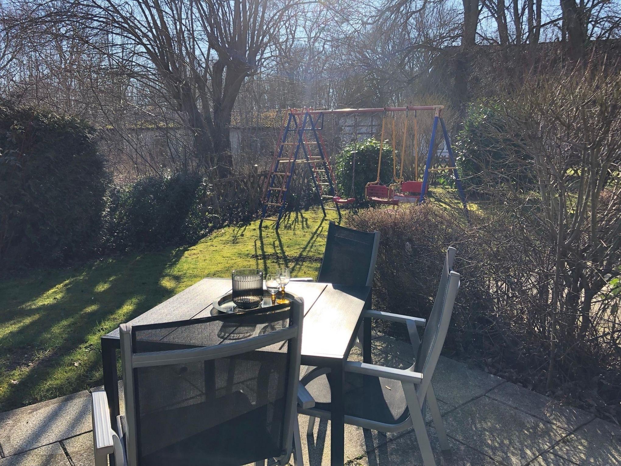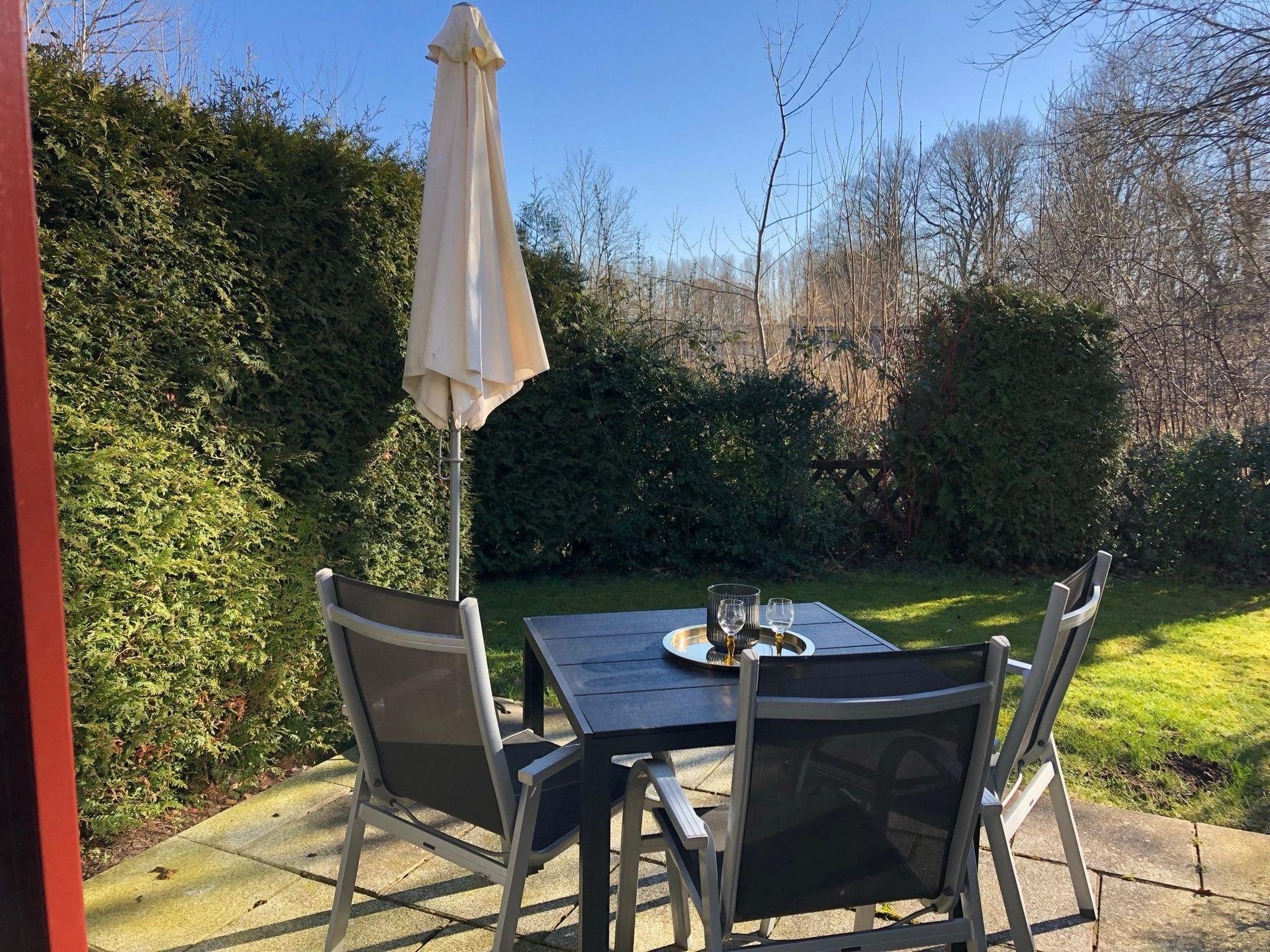 Ein Highlight unserer Ferienwohnung "Klaus Störtebeker" ist die eigene große Sonnenterrasse. Die Terrasse ist mit einem modernen Tisch und zwei bequemen Stühlen ausgestattet. Die Terrasse ist zu den Seiten in Büsche und Sträucher eingebettet, die zugleich für Sichtschutz sorgen. Von der Terrasse aus eröffnet sich der Blick in den Garten des Ferienhauses, der durch Bäume, Büsche und Sträucher zu den Nachbargrundstücken abgegrenz ist, die ebenfalls zum Sichtschutz beitragen. Der Garten verfügt über eine Schaukel und kann von den Gästen unseres Ferienhauses gemeinschaftlich genutzt werden. Darüber hinaus verfügt die Ferienwohnung über einen eigenen Parkplatz.