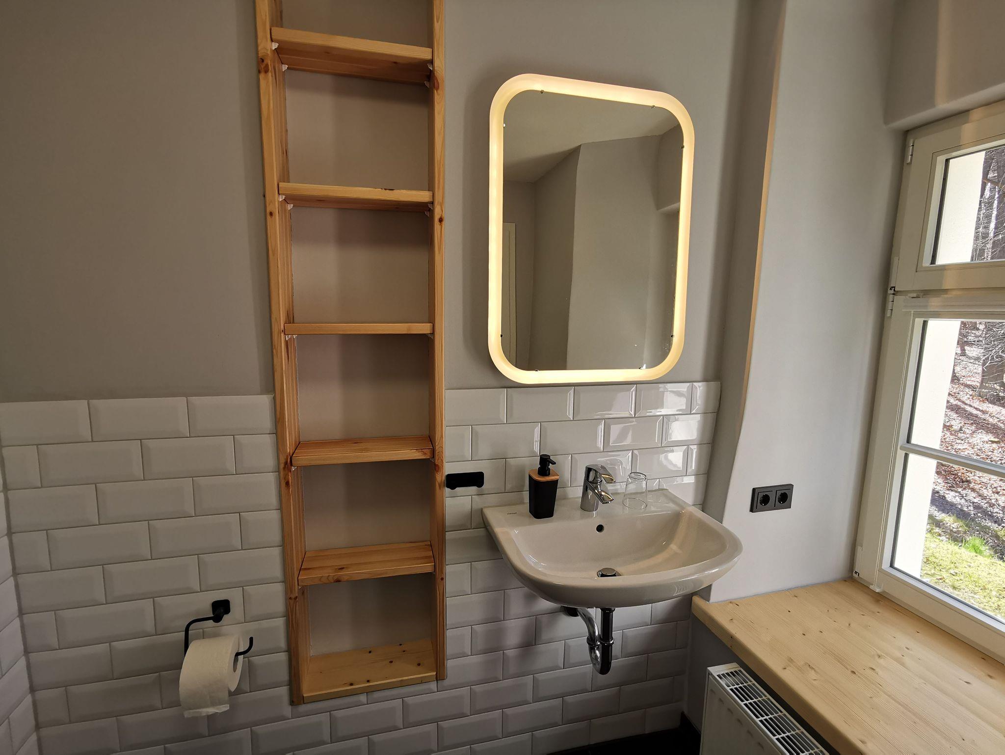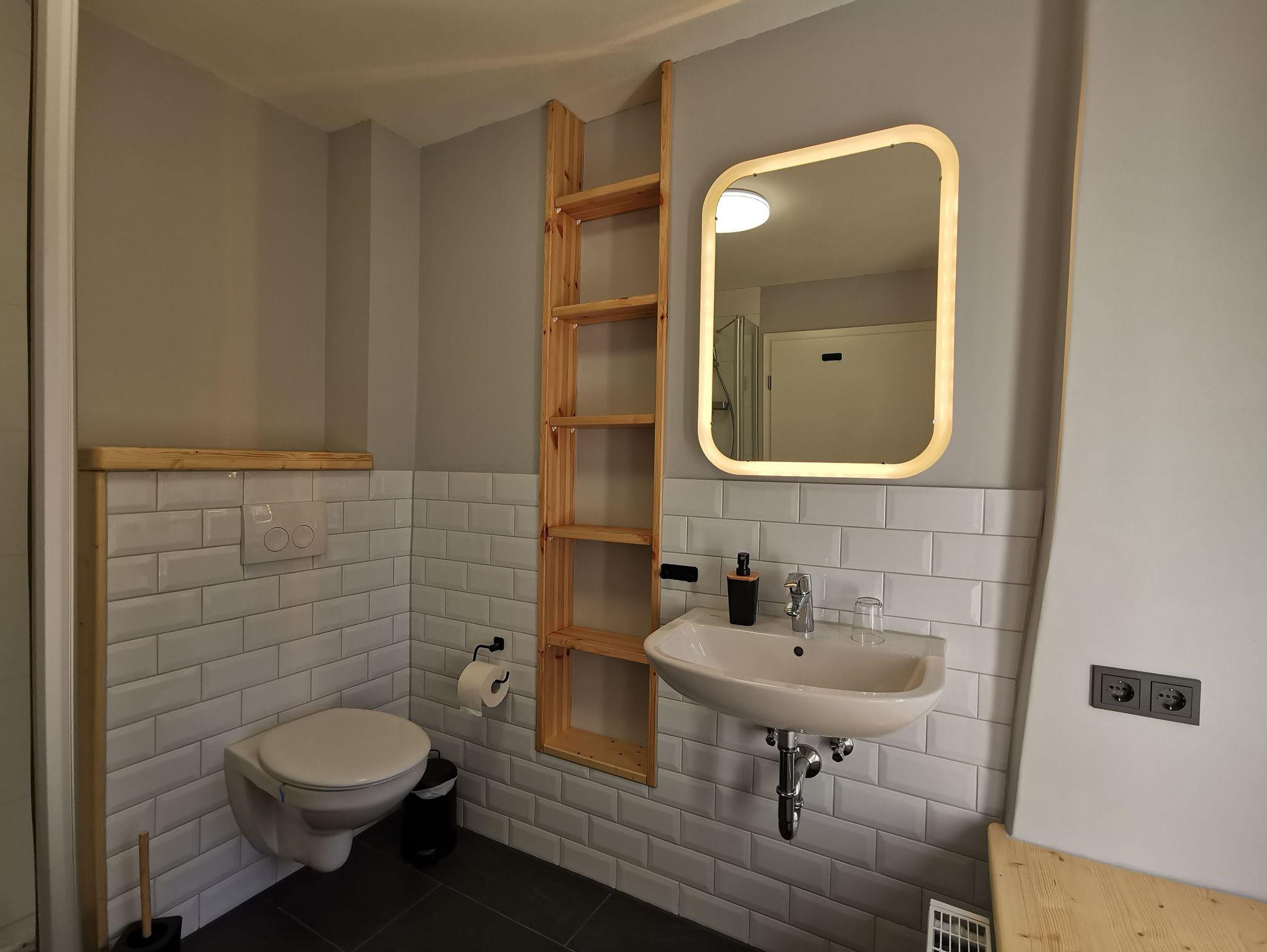 Alle Doppelzimmer haben ein eigenes Badezimmer mit Dusche, Waschbecken und Toilette. Folgende Ausstattung ist in jedem Gästezimmer vorhanden: