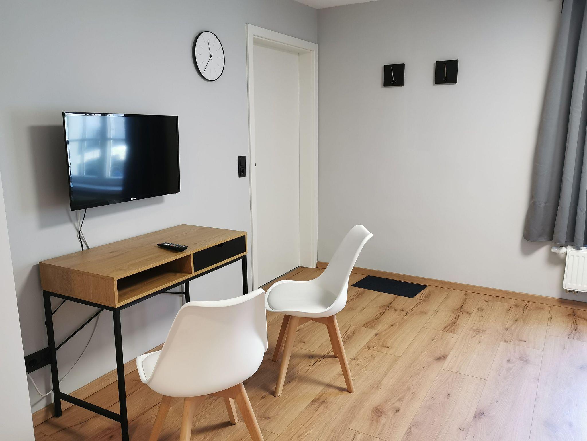 Im Zimmer 2 trifft Alt auf Neu. Es wurde ein spannender Mix zwischen altem Sichtmauerwerk und neuer Wand geschaffen. Die Möbel und die Inneneinrichtung folgen diesem Ansatz und sind perfekt auf das Zimmer abgestimmt. Vom Bett aus haben Sie einen unverbauten Blick auf die Schlosskapelle. Das Doppelbett ist 1,80x2,00 m groß.