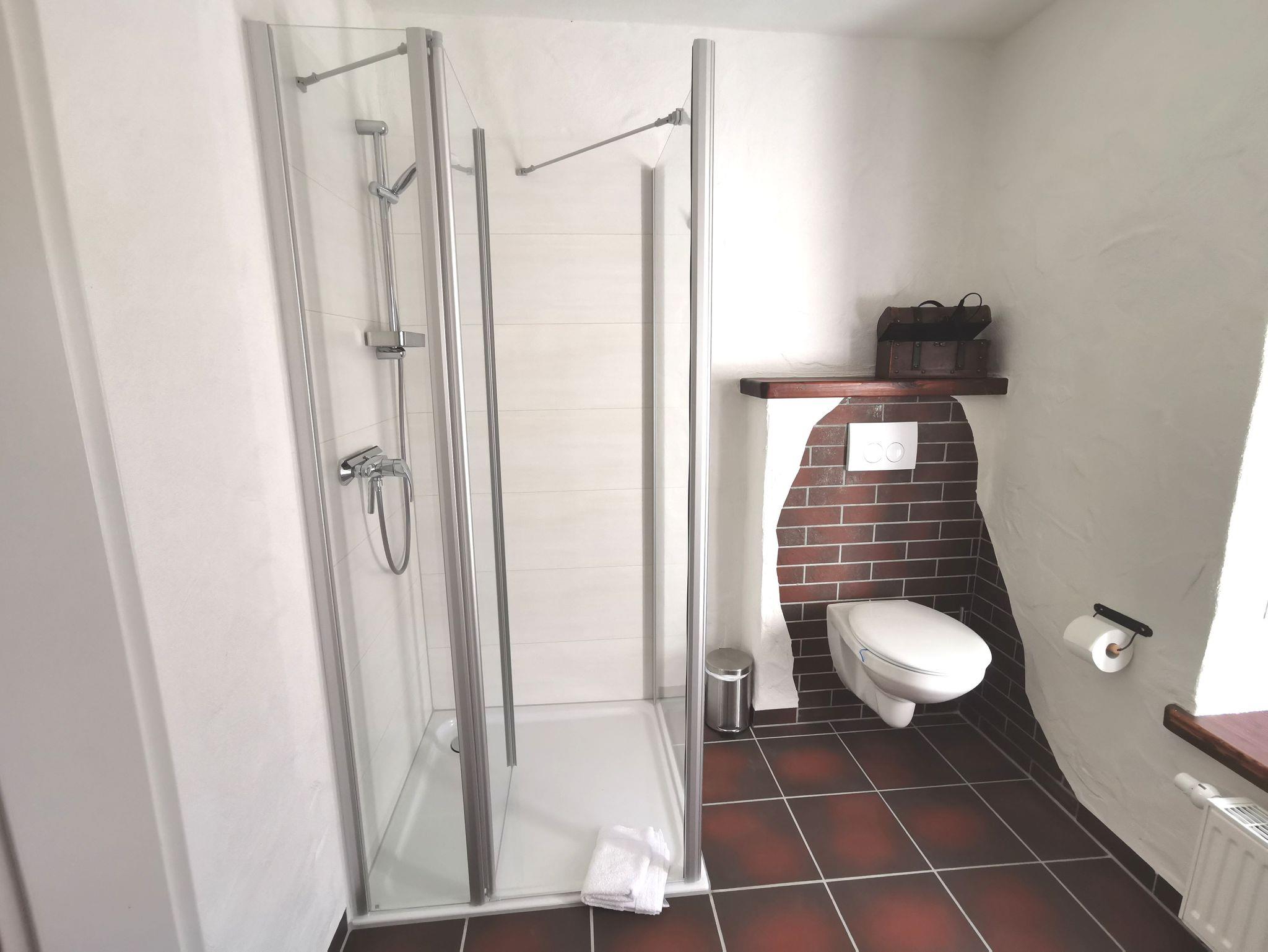 Alle Doppelzimmer haben ein eigenes Badezimmer mit Dusche, Waschbecken und Toilette. Folgende Ausstattung ist in jedem Gästezimmer vorhanden: