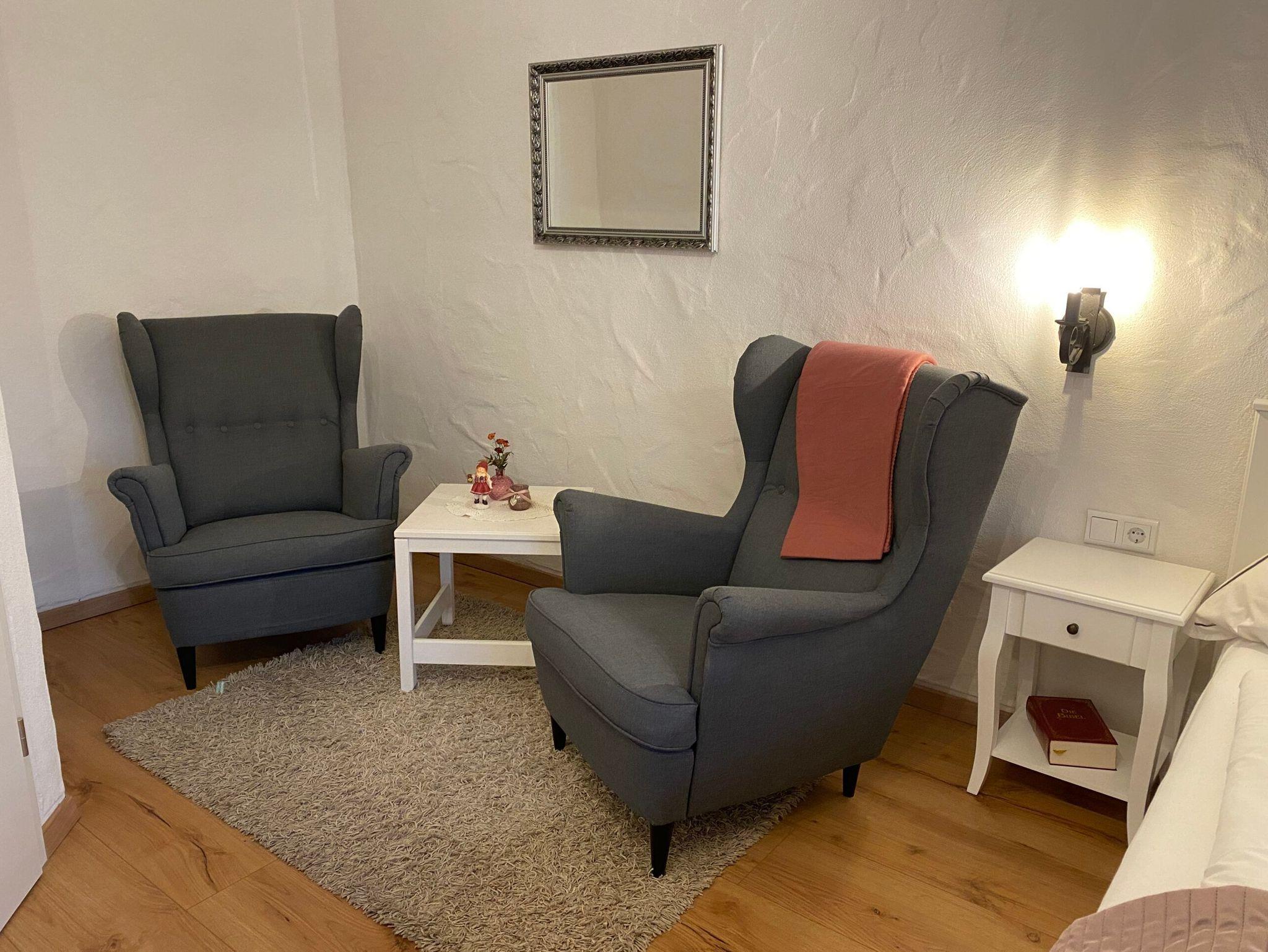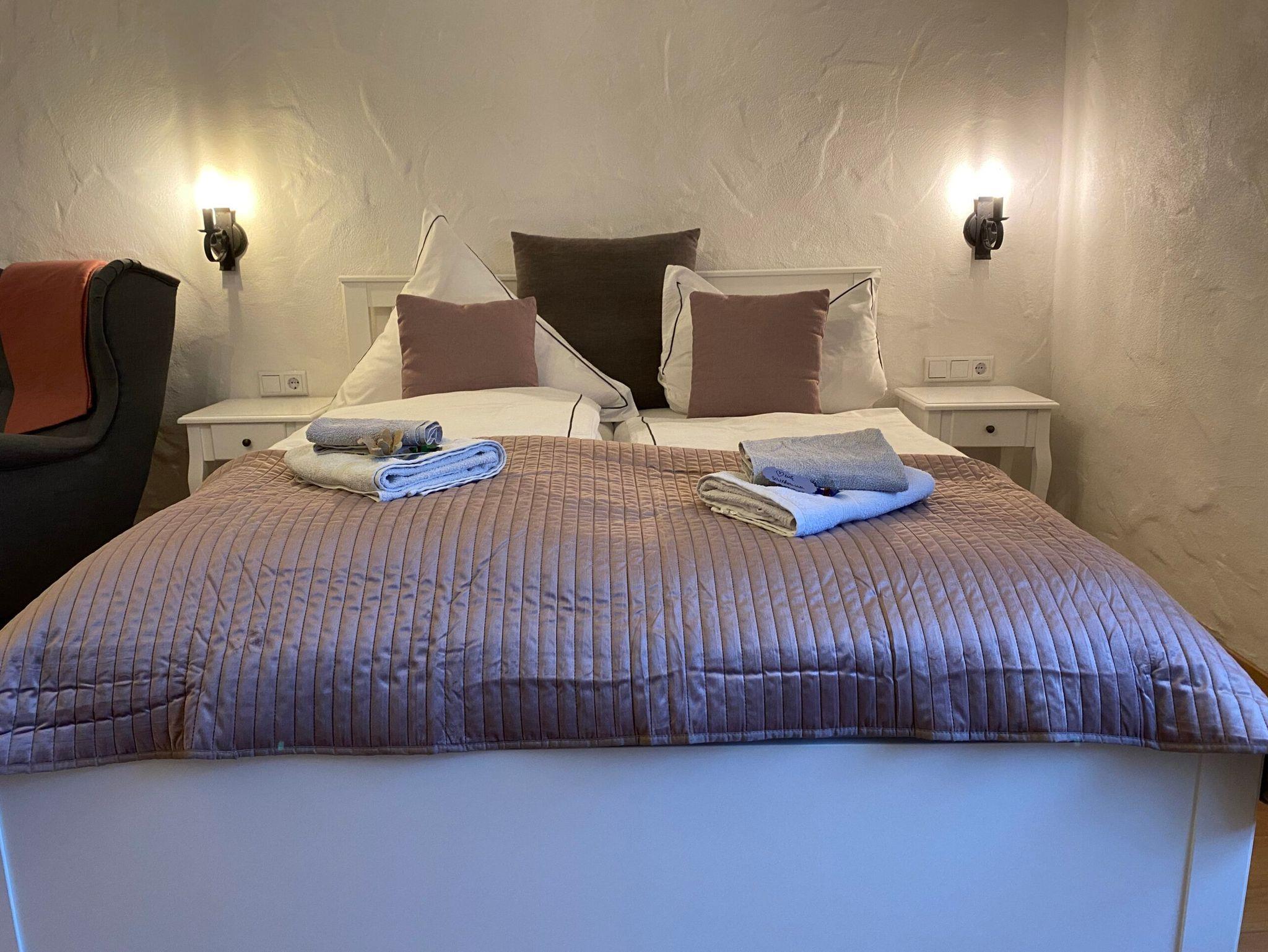 Dieses Zimmer ist wie der Name schon sagt ausgestattet mit einem besonderen Doppelbett in den Maßen 1,60×2,00 m. Es ist barrierefrei zu erreichen und verfügt über ein extra großes Badezimmer mit ebenerdigen Duscheinstieg. Das besondere an diesem Zimmer ist das Gewölbe und die Minibar. Setzen Sie sich auf den alten Lehnstuhl und genießen Sie den Blick auf die Schlosskapelle.