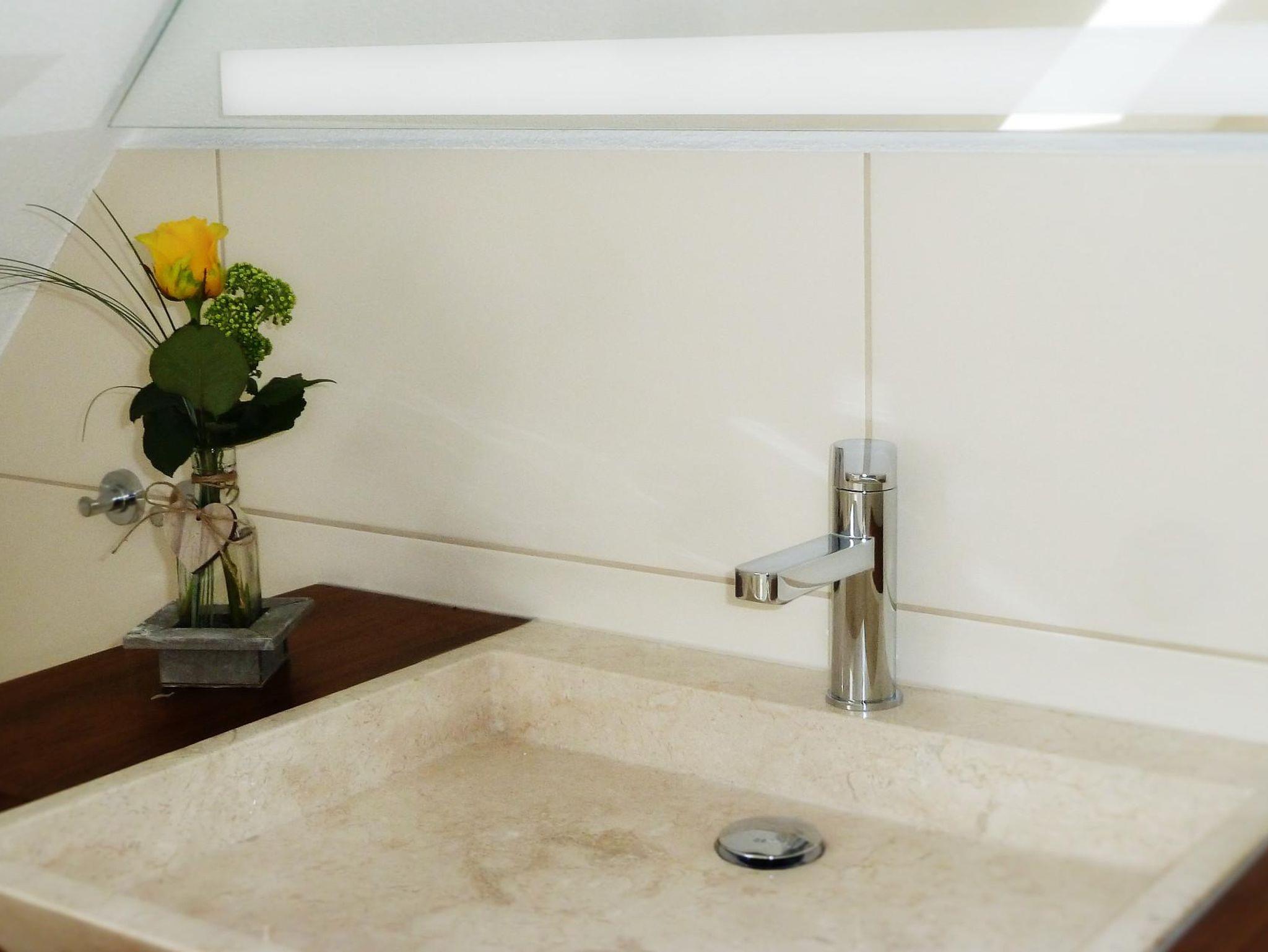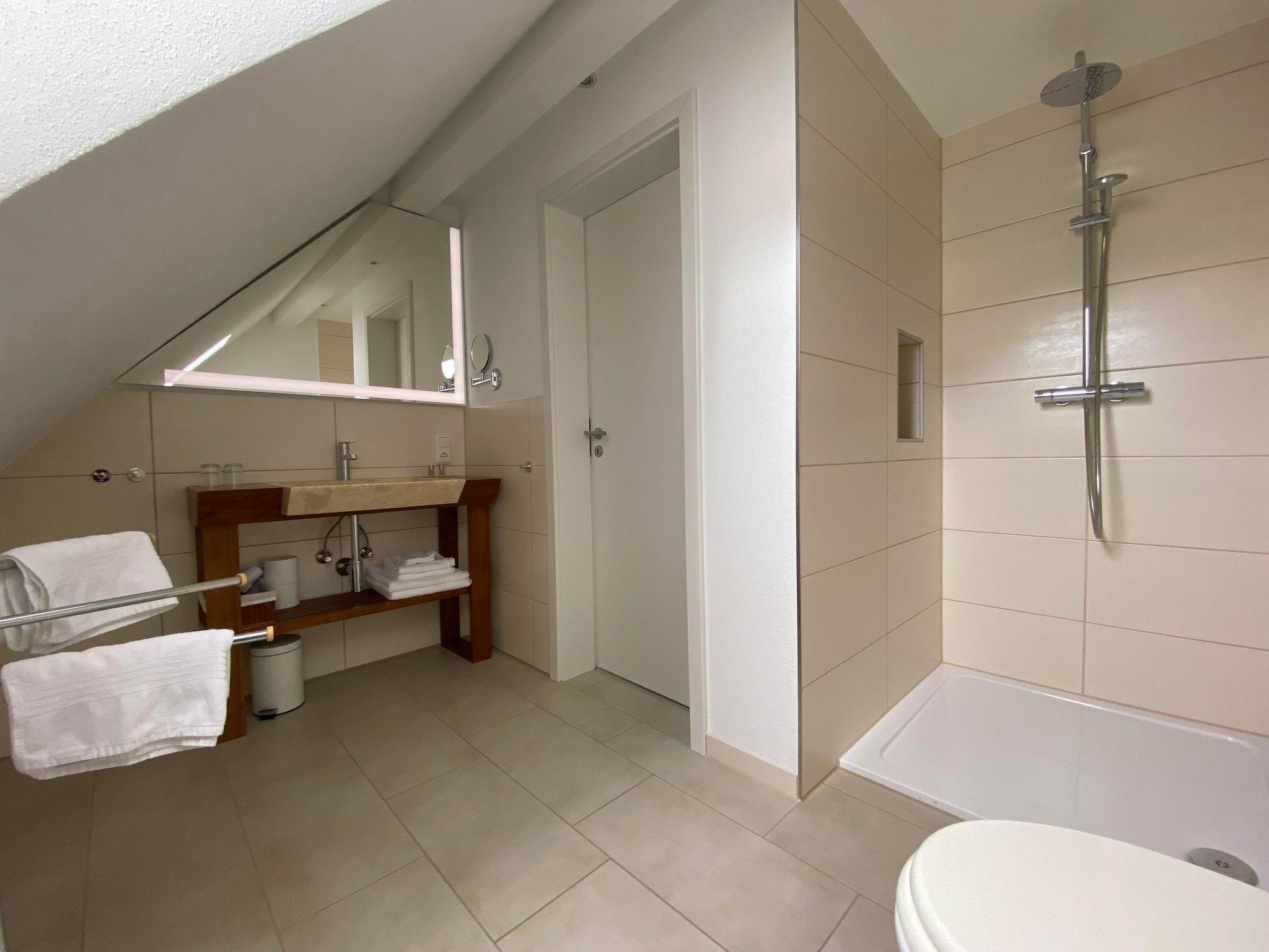 Badezimmer WC, Regendusche, beleuchteter Spiegel, Handtuchheizkörper, Hand- und Duschtücher, Kosmetikspiegel, Fön