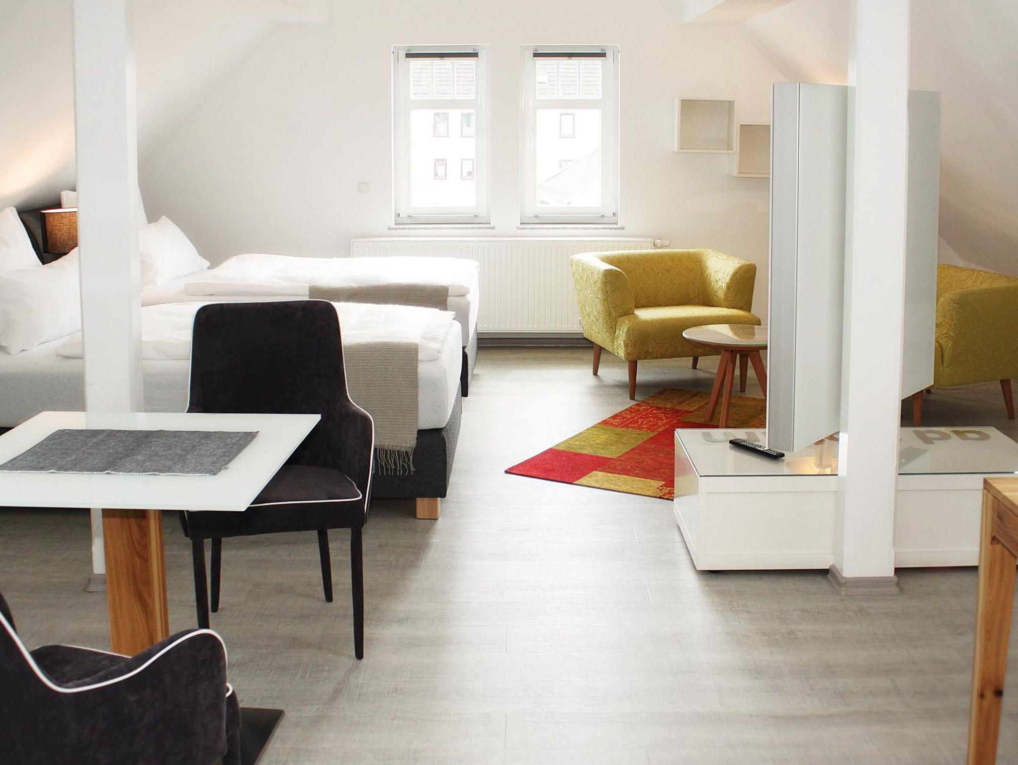 AUSSTATTUNG DER FERIENWOHNUNG ROSE Wohn- & Schlafbereich bequeme Loungesessel, Designer-TV , Schreibtisch, Doppelbett , Kleiderschrank, Garderobe
