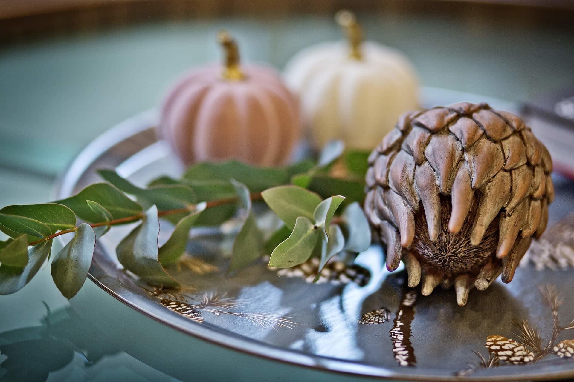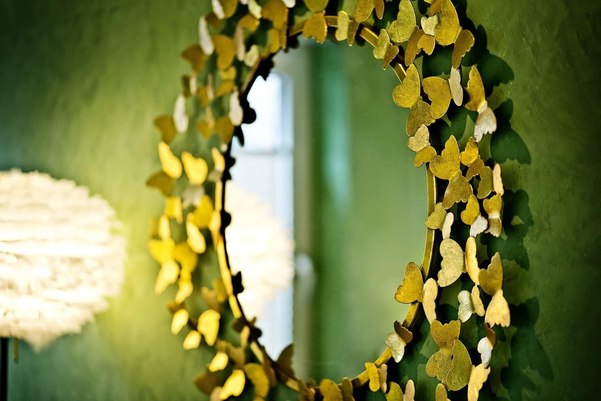 Nachttischlampen und Spiegel im Schmetterling-Design präsentieren sich in modernen Kupfer- und Gold-Tönen. Eine gemütliche Leseecke mit Samtsessel lädt zum Entspannen ein.