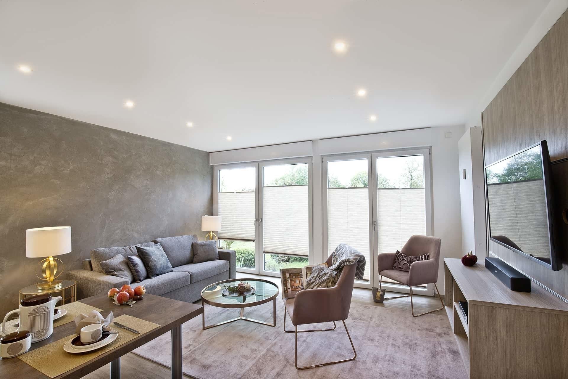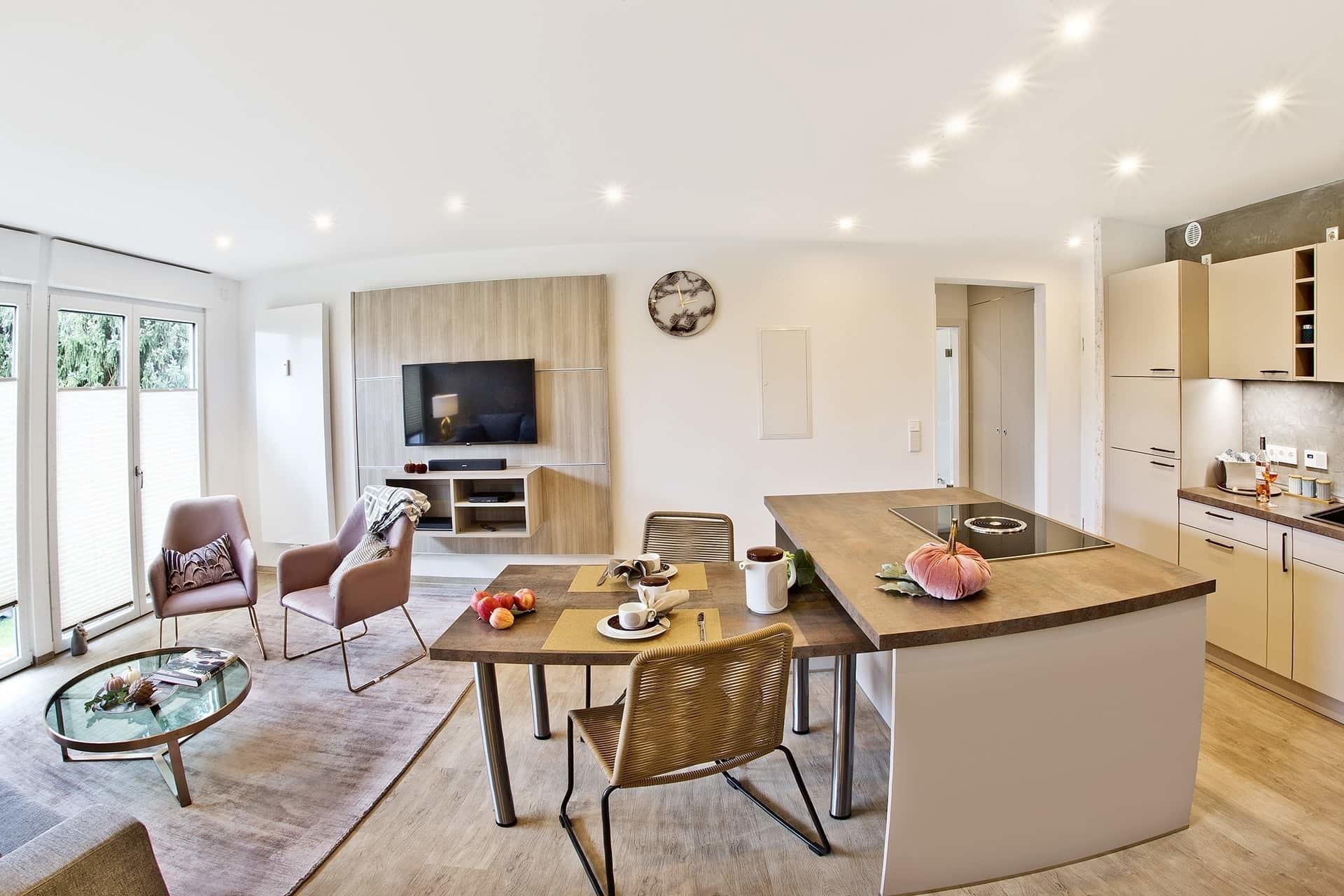 Vor der Küchenwand mit Spüle, Kühlschrank mit Gefrierfach, Backofen, Geschirrspüler, Waschtrockner und Regalen steht eine moderne Kochinsel mit 4-Platten-Induktionsherd. Der verschiebbare und im Design identische Esstisch - für bis zu vier Personen - fügt sich harmonisch an. Gegenüber des kuscheligen, hochwertigen Sofas - welches als zusätzliche Schlafmöglichkeit fungieren kann - befindet sich die Cine-Wall mit Flachbild-TV. Für die kühleren Tage steht ein knisternder Kamin zur Verfügung. Bodentiefe Fenster spenden viel Licht. Zwei Türen führen hinaus auf die Westseite des Hauses. Dort befindet sich eine eigene Gartenfläche von etwa 30 m² mit Outdoor-Sitzmöglichkeit für bis zu vier Personen.