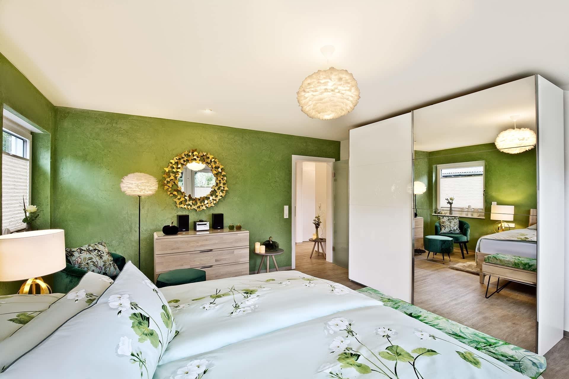 Das Schlafzimmer beherbergt ein großes, luxuriöses Massivholzbett für zwei Personen und dazu passendem Mobiliar - Nachttische, Kommode, Bettbank und ein geräumiger Schrank.
