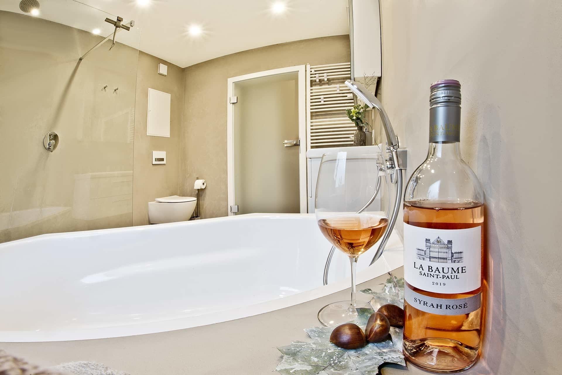 Im neuen Bad befindet sich eine coole Walk-In-Dusche mit großer Regenbrause sowie eine Eckbadewanne, ein Waschbecken mit Unterwaschtisch und WC. Außerdem: ein großer Spiegelschrank, ein Kosmetik-Spiegel, Föhn, Handtücher und Vorleger. Das Bad kann mittels Tageslichtfenster gut belüftet werden.
