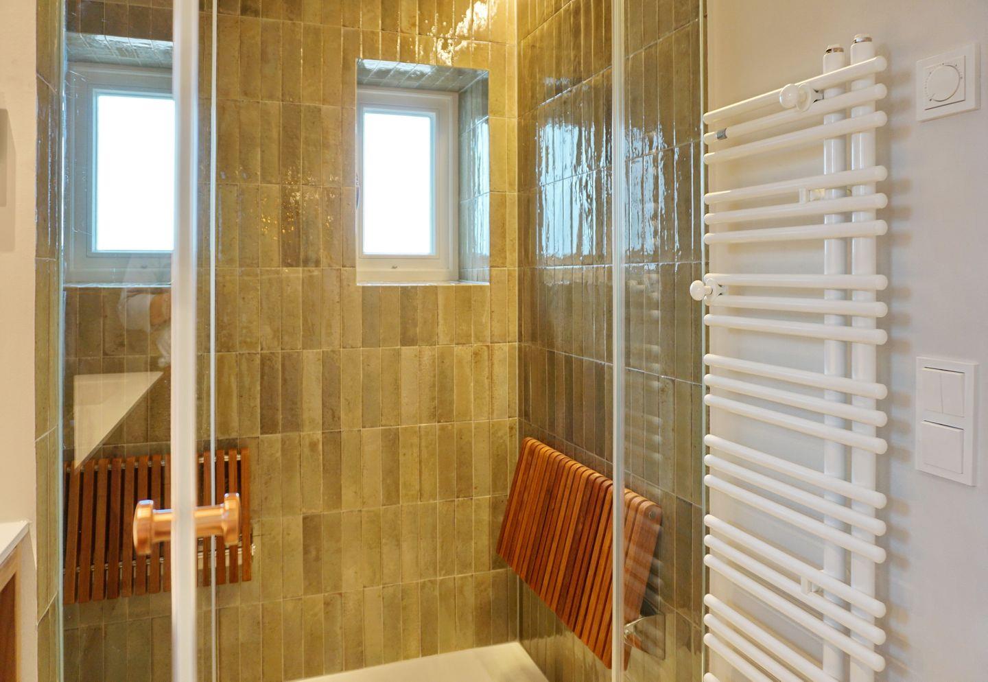 Bad 1: helles, modernes Bad mit WC, Dampfdusche, Einzelwaschtisch mit Fussbodenheizung