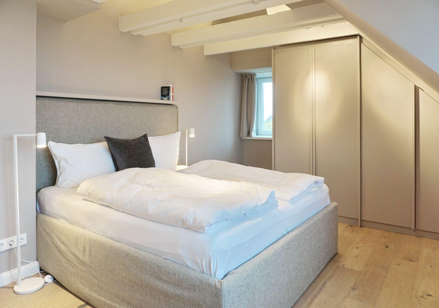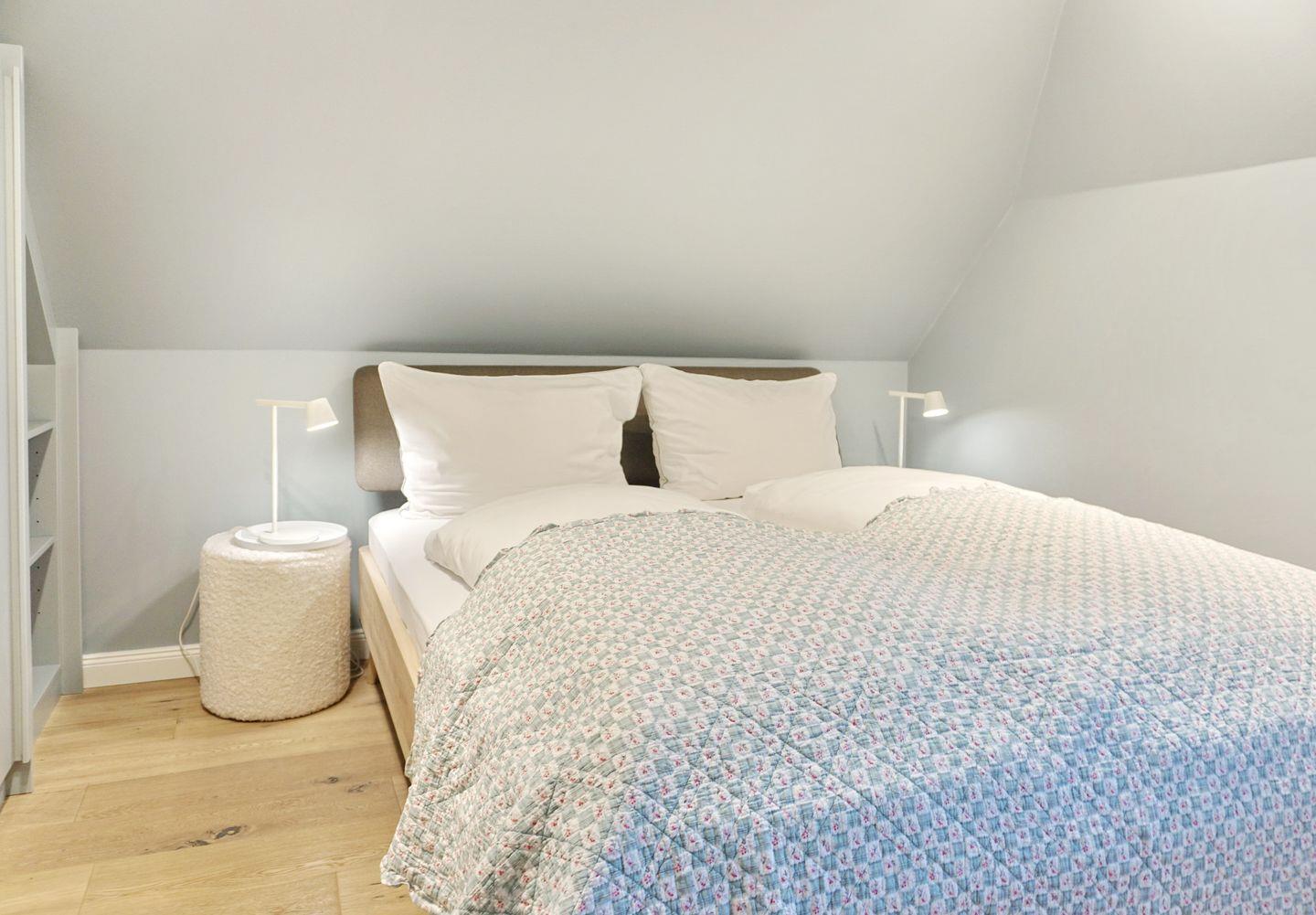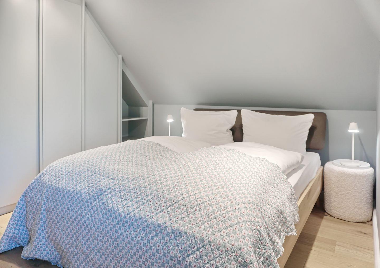 Schlafen 2: Schlafzimmer mit 1,60 m x 2 m Doppelbett und Kleiderschränken, kleiner Schminktisch