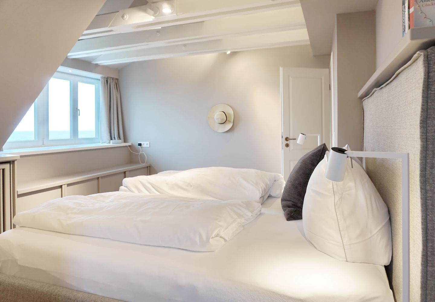 Schlafen 1: Schlafzimmer mit Meerblick und Kleiderschränken, hohes Bett 1,80 m x 2 m und traumhaften Blick auf das Meer und den Sonnenuntergang