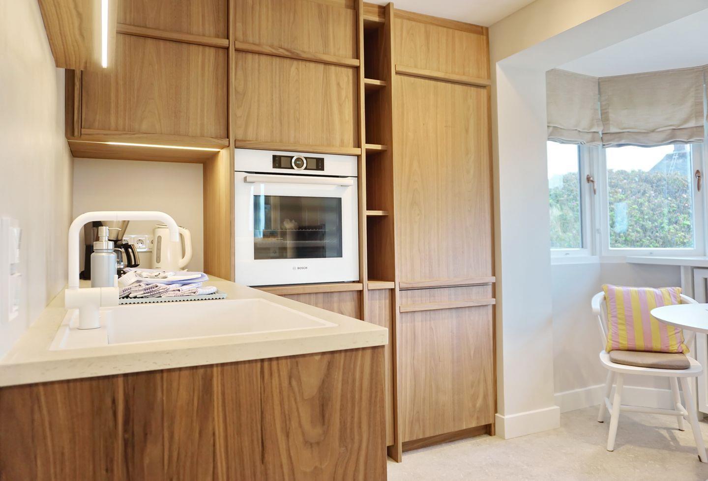 Küche: separate halboffene Küche mit kleinem Tisch und 2 Stühlen; Geschirrspüler, Backofen mit Dampfgarer, Induktionskochfeld