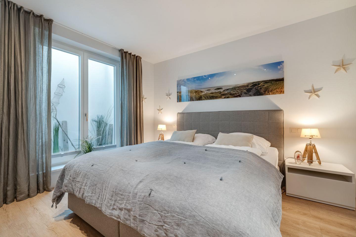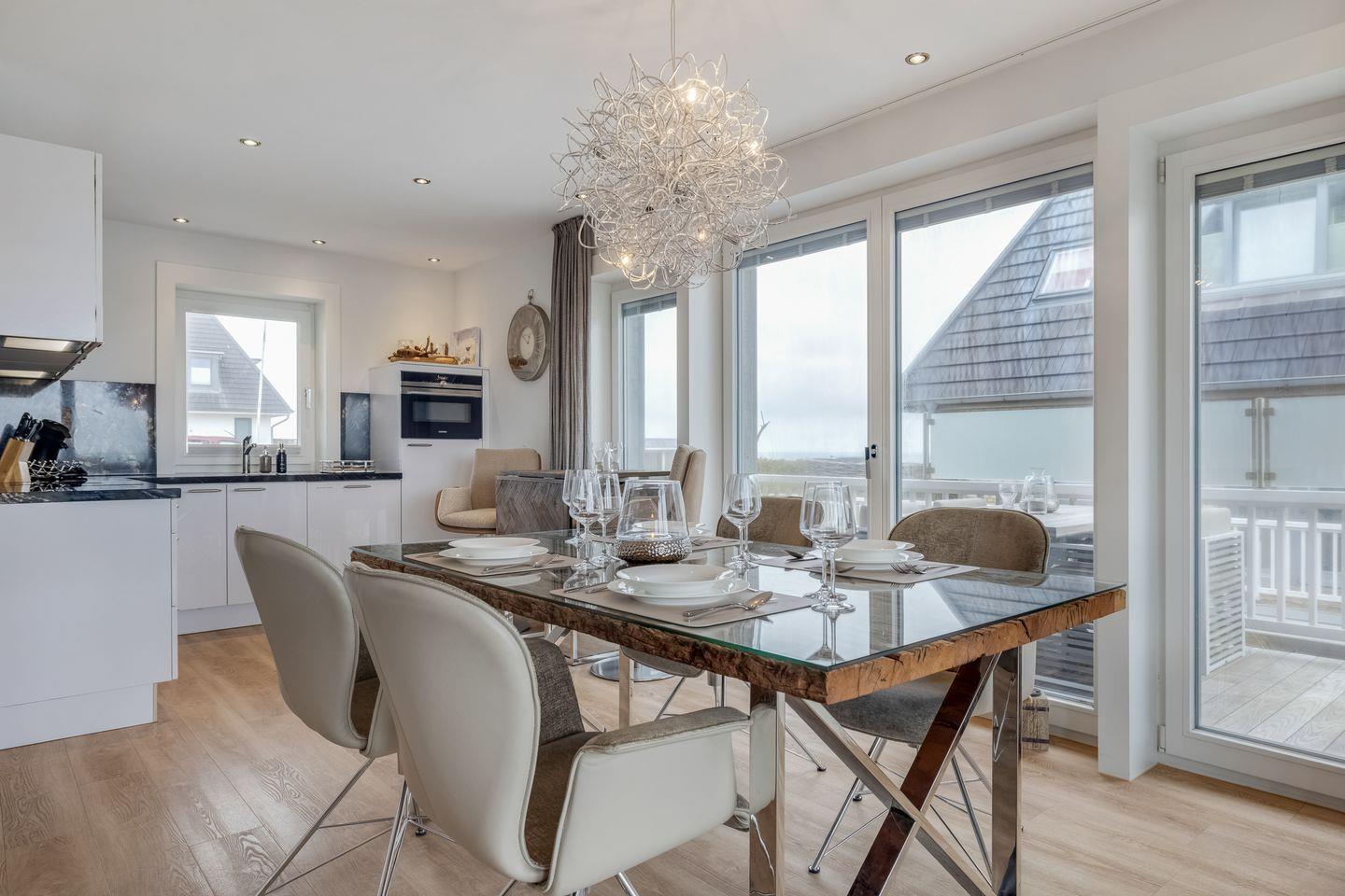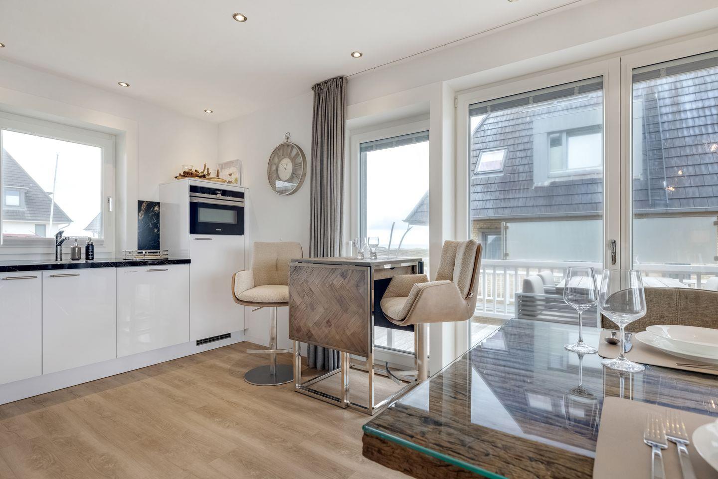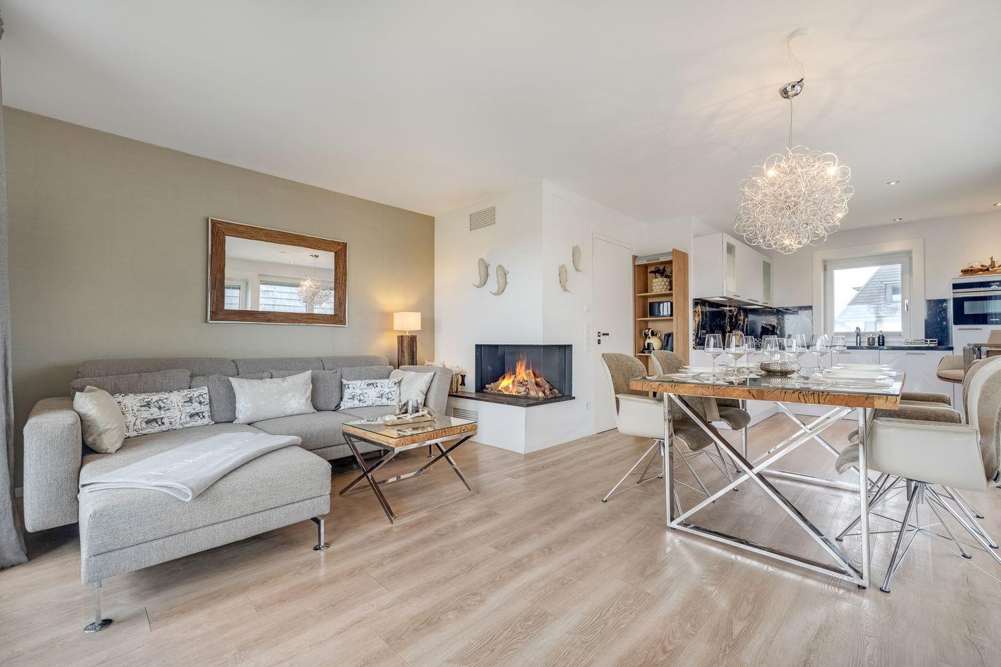 Mittelpunkt der Wohnung ist der offen gestaltete Wohn- und Essbereich mit hochwertigen Möbeln und einem Gaskamin, der auch an verregneten Tagen für Gemütlichkeit sorgt. Zum Wohnbereich gehört außerdem eine moderne Küchenzeile mit Geschirrspülmaschine, Backofen und Induktionskochfeld. Vom Wohnbereich aus erreichen Sie Ihre Terrasse von der aus Sie sowohl das Wattenmeer als auch den Weststrand der Insel bewundern können.