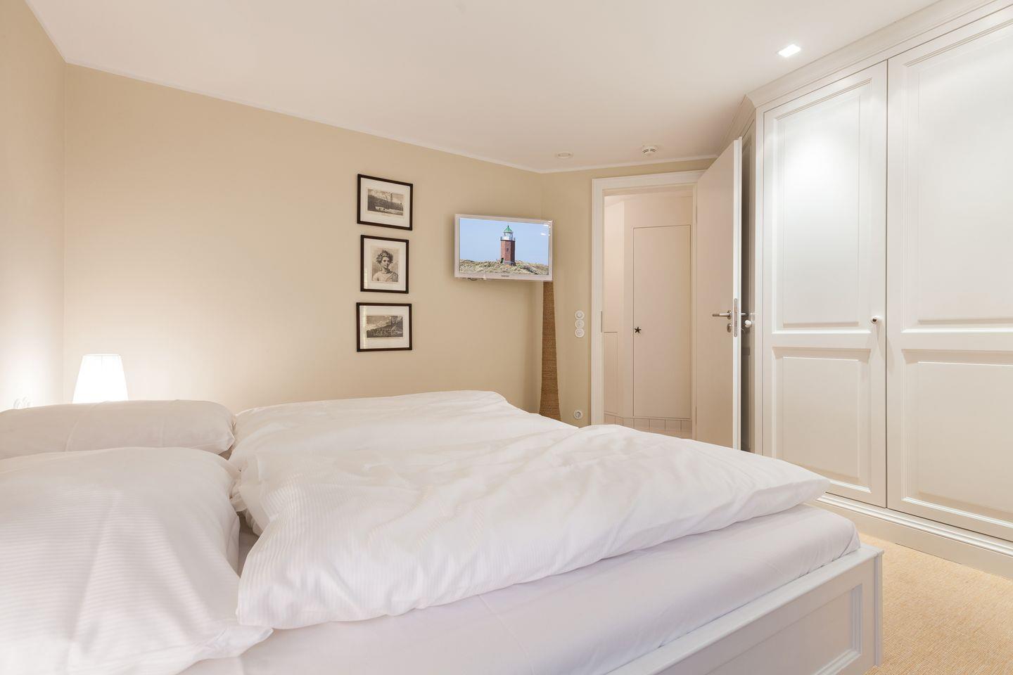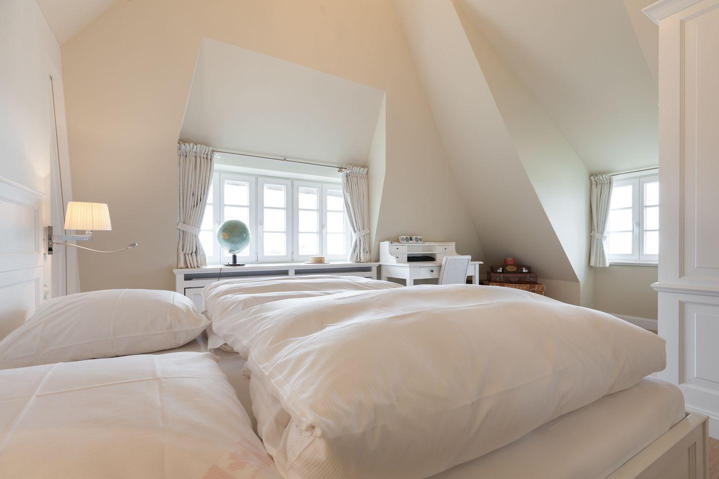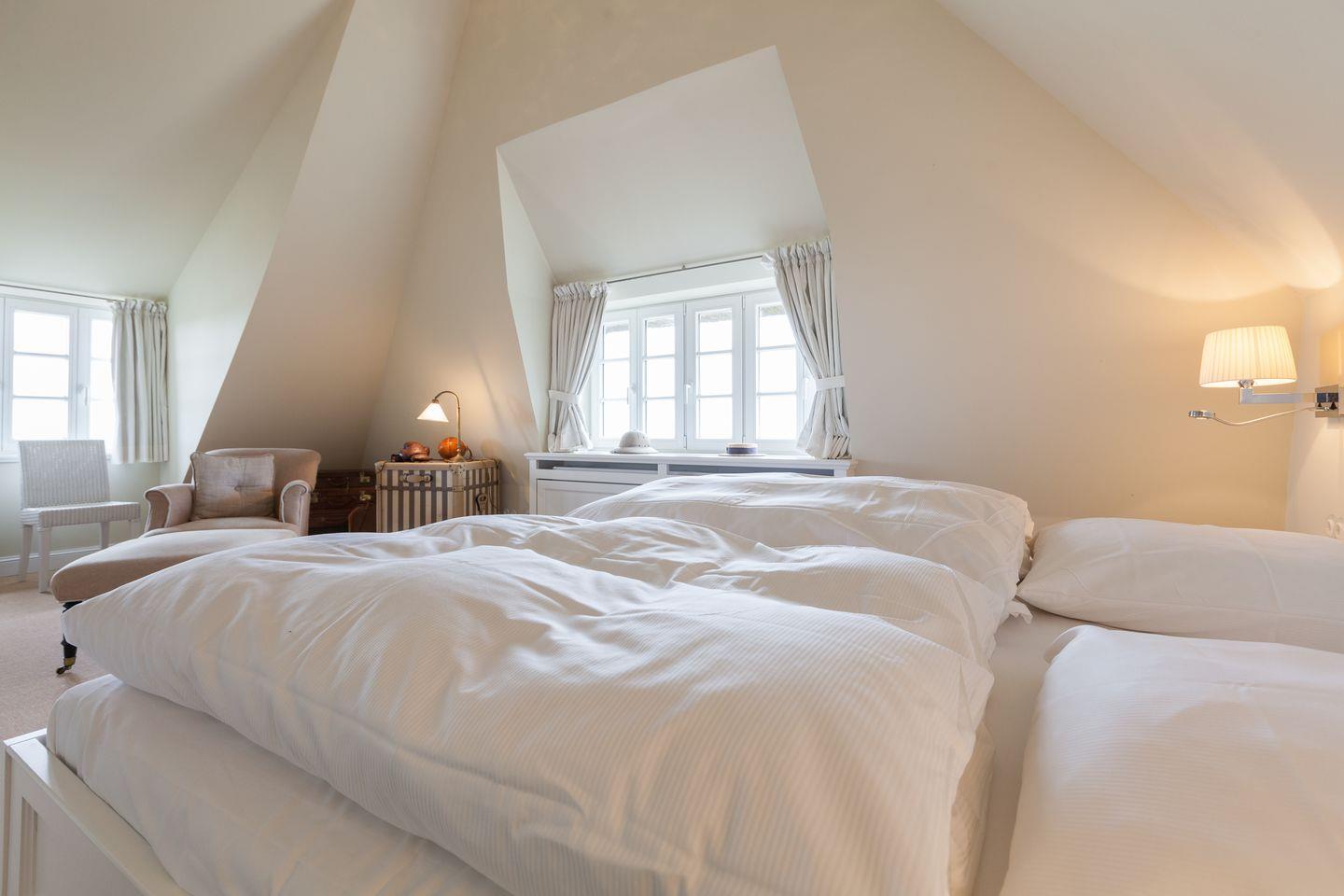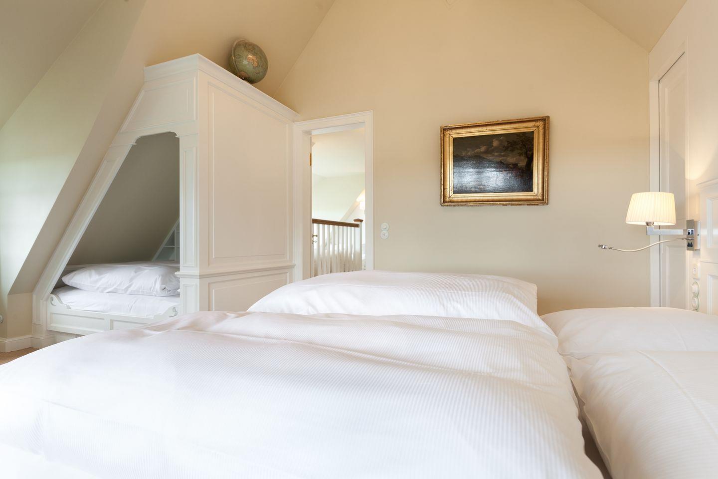 Sofern das Feinperlige geleert sein sollte und der letzte Schweinswal von dannen zog, haben Sie sich Ihre Nachtruhe wohlverdient. Hier im Obergeschoss können Sie gleich aus zwei superben Master-Bedrooms mit jeweils imposanter Deckenhöhe wählen, die ein einzigartig luftiges Raum- und Wohlfühlgefühl erzeugen. Ihr Schlafbereich zum Nord-Westen ausgerichtet bietet vollen Meerblick und ist geschmackvoll mit wertigen Antiquitäten ausgestattet. Zwei begehbare Kleiderschränke finden Sie von kundiger Tischlerhand hinter Ihrem Doppelbett eingebaut. Ein Traum, bei geöffnetem Fenster einzuschlafen bzw. aufzuwachen. Und stets mit wohligem Meeresrauschen. 'Die schönste Musik der Welt', so ein Urlaubsgast, 'hörte ich von meinem Schlafzimmer aus. TV vor dem Einschlafen? Reinste Zeitvergeudung.'