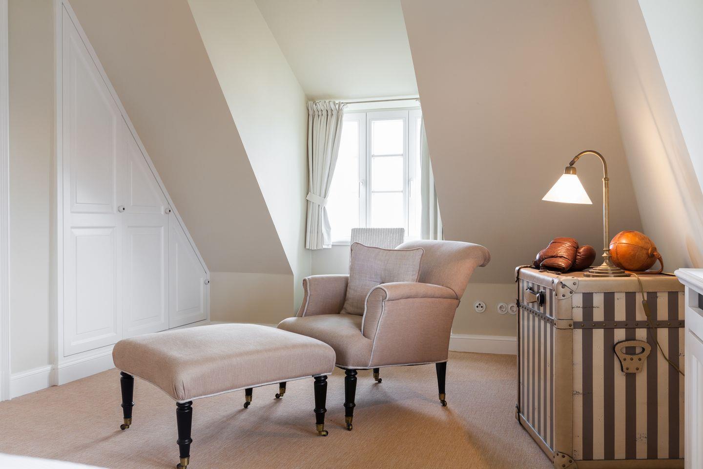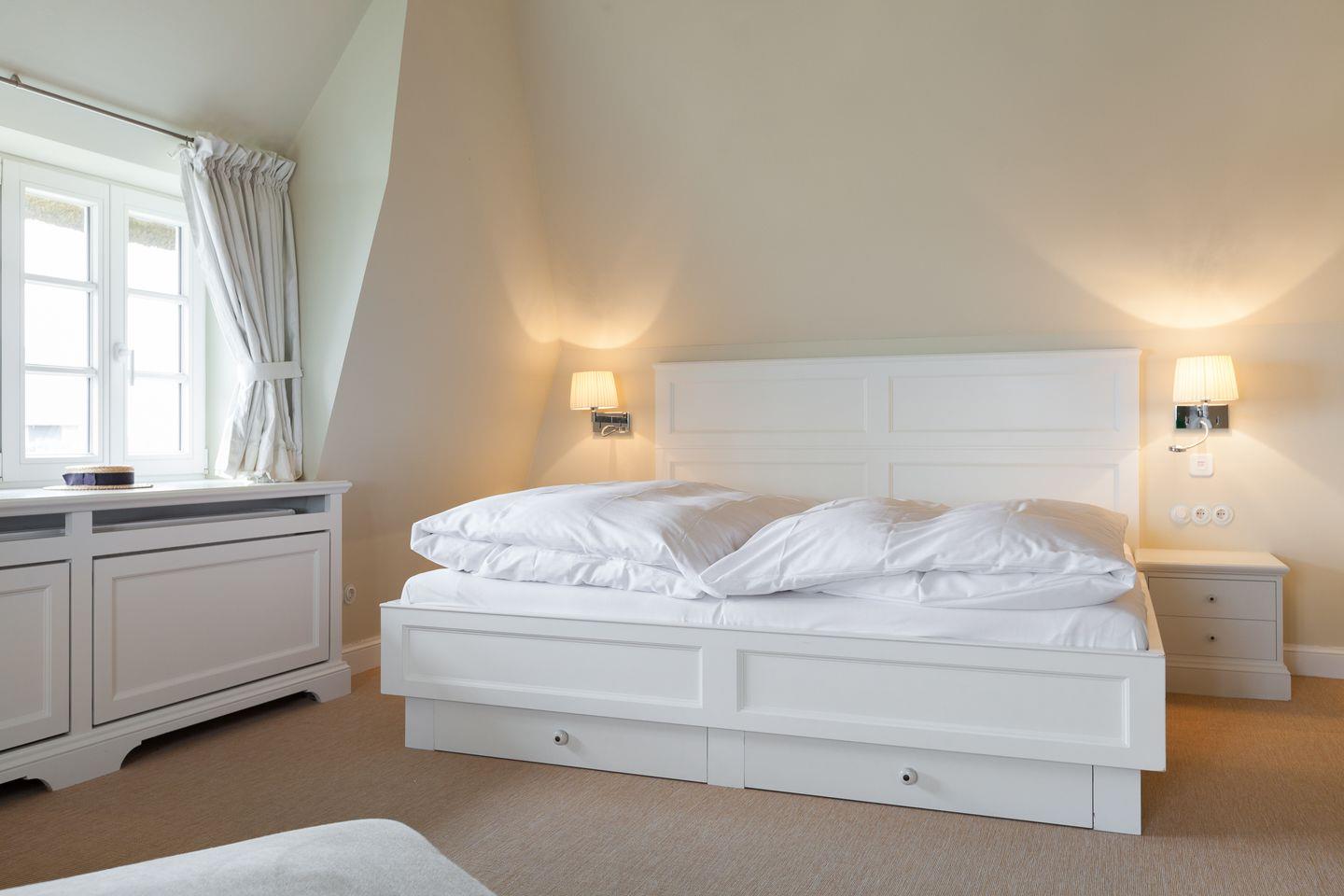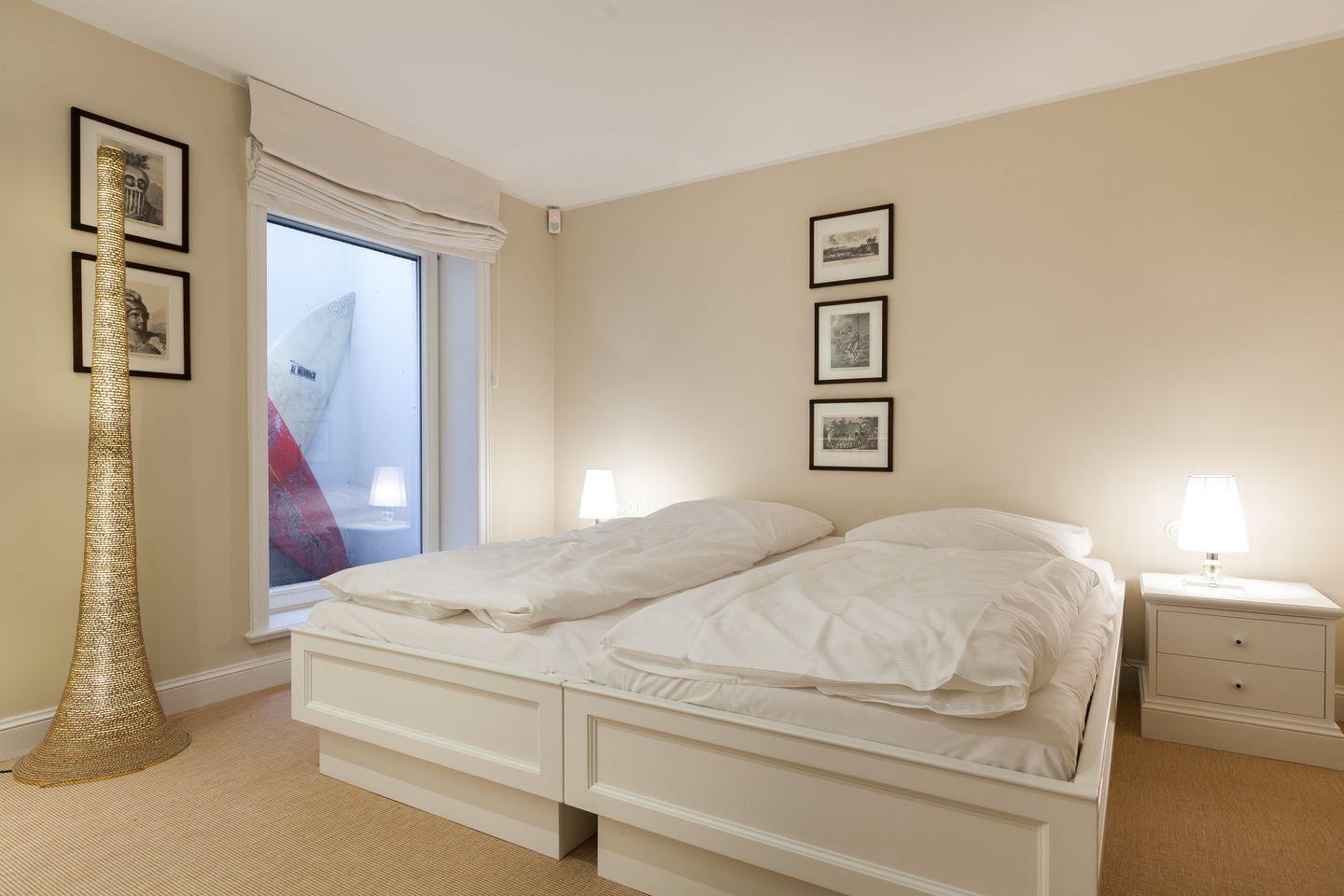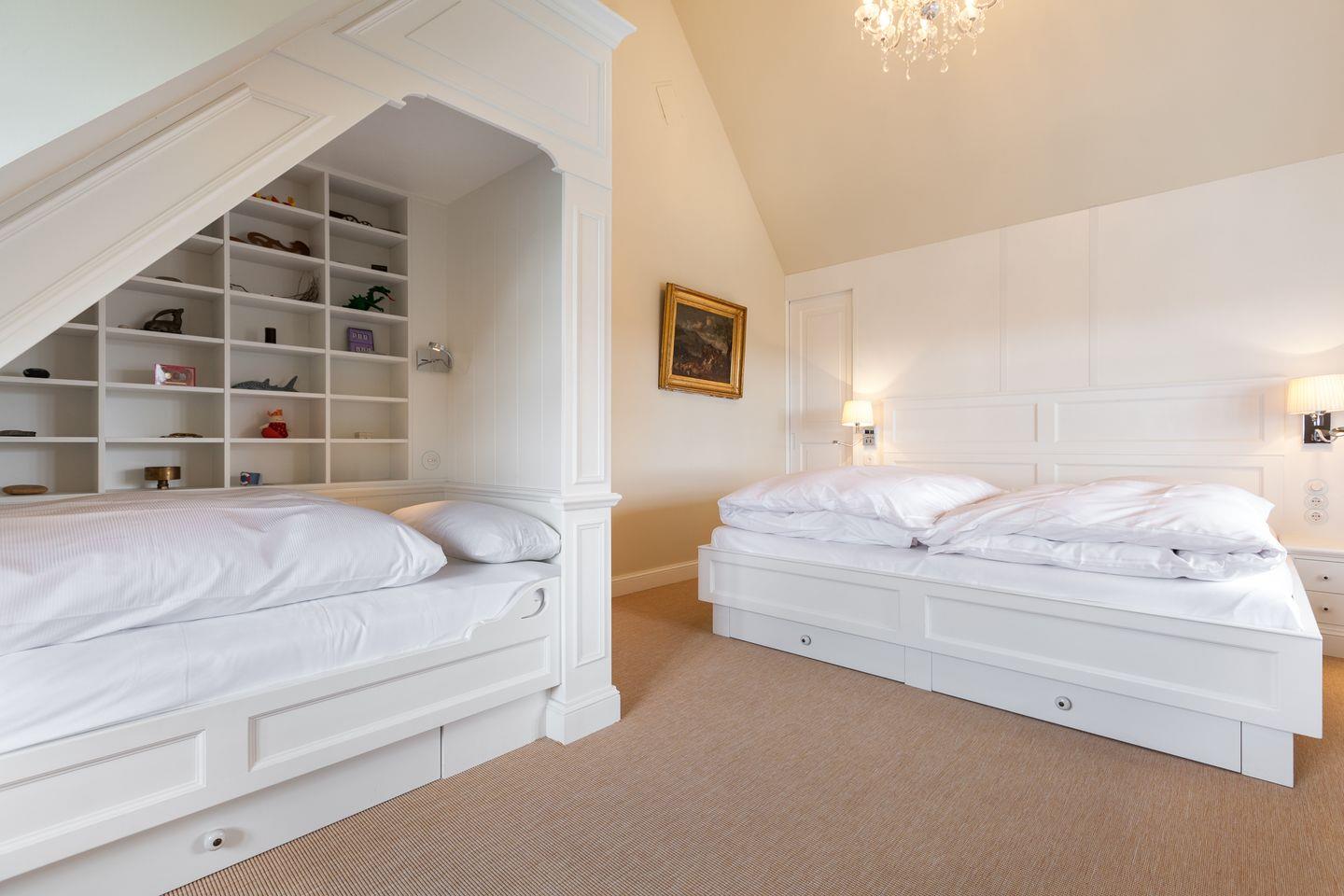 Sofern das Feinperlige geleert sein sollte und der letzte Schweinswal von dannen zog, haben Sie sich Ihre Nachtruhe wohlverdient. Hier im Obergeschoss können Sie gleich aus zwei superben Master-Bedrooms mit jeweils imposanter Deckenhöhe wählen, die ein einzigartig luftiges Raum- und Wohlfühlgefühl erzeugen. Ihr Schlafbereich zum Nord-Westen ausgerichtet bietet vollen Meerblick und ist geschmackvoll mit wertigen Antiquitäten ausgestattet. Zwei begehbare Kleiderschränke finden Sie von kundiger Tischlerhand hinter Ihrem Doppelbett eingebaut. Ein Traum, bei geöffnetem Fenster einzuschlafen bzw. aufzuwachen. Und stets mit wohligem Meeresrauschen. 'Die schönste Musik der Welt', so ein Urlaubsgast, 'hörte ich von meinem Schlafzimmer aus. TV vor dem Einschlafen? Reinste Zeitvergeudung.'