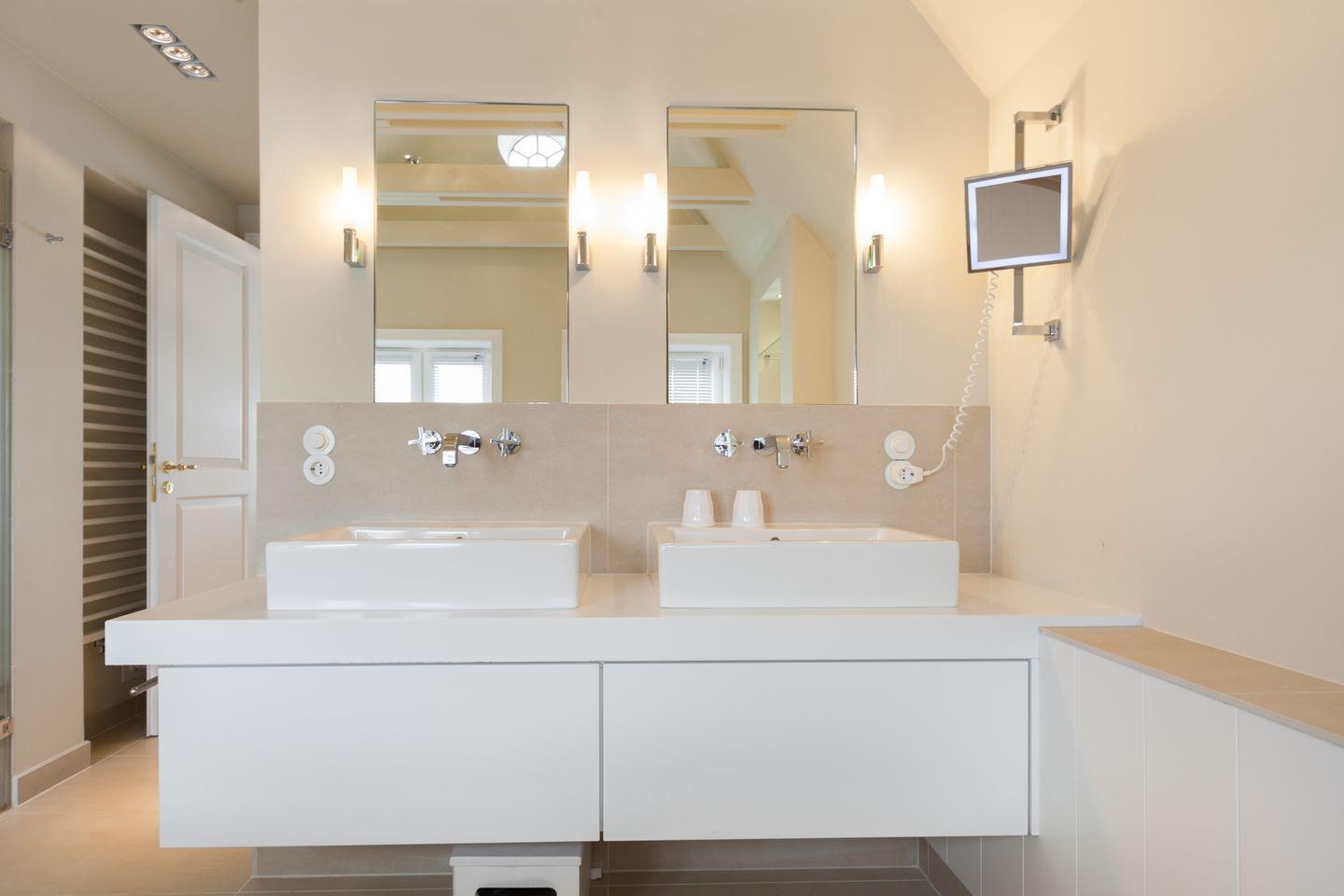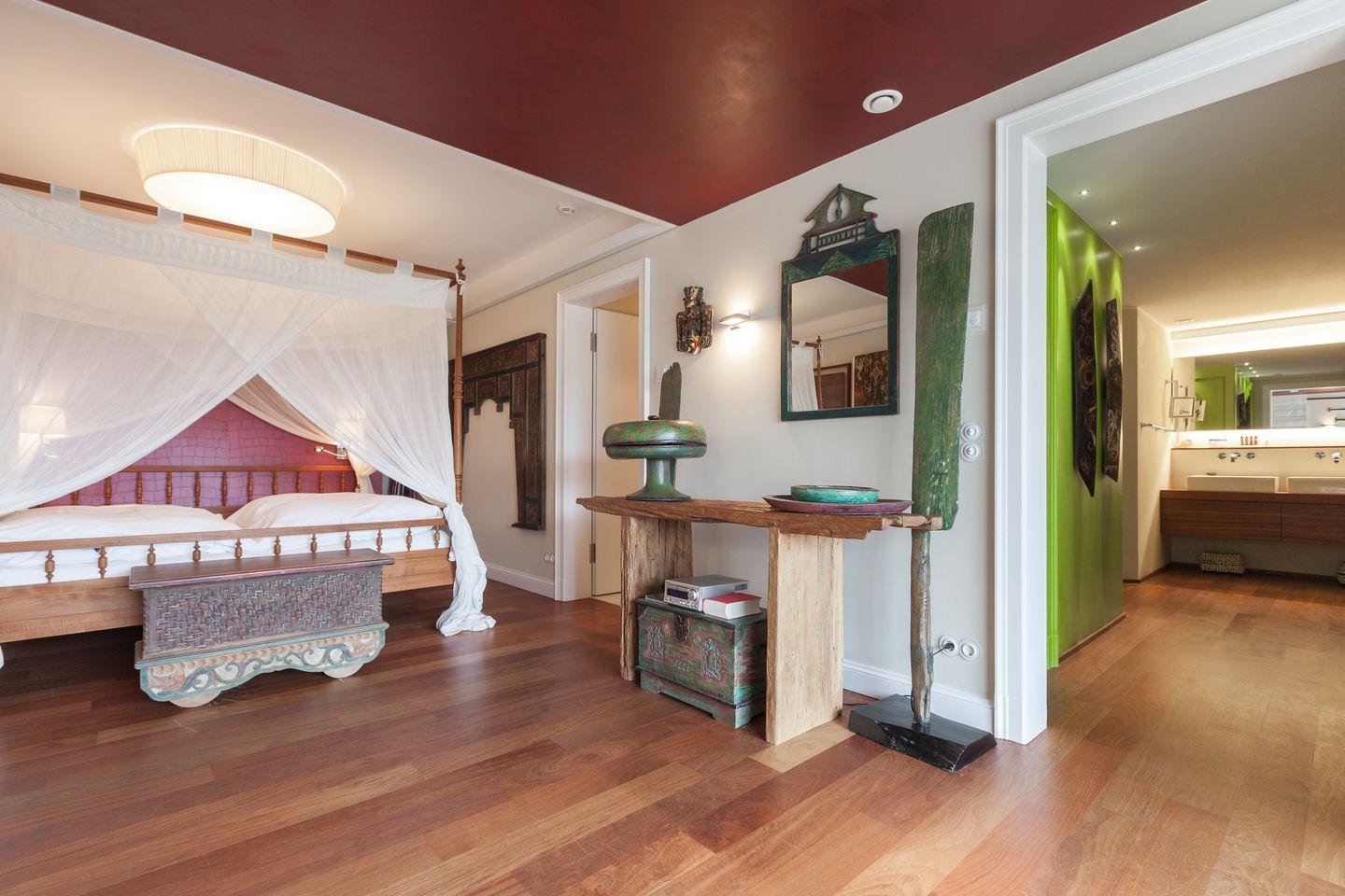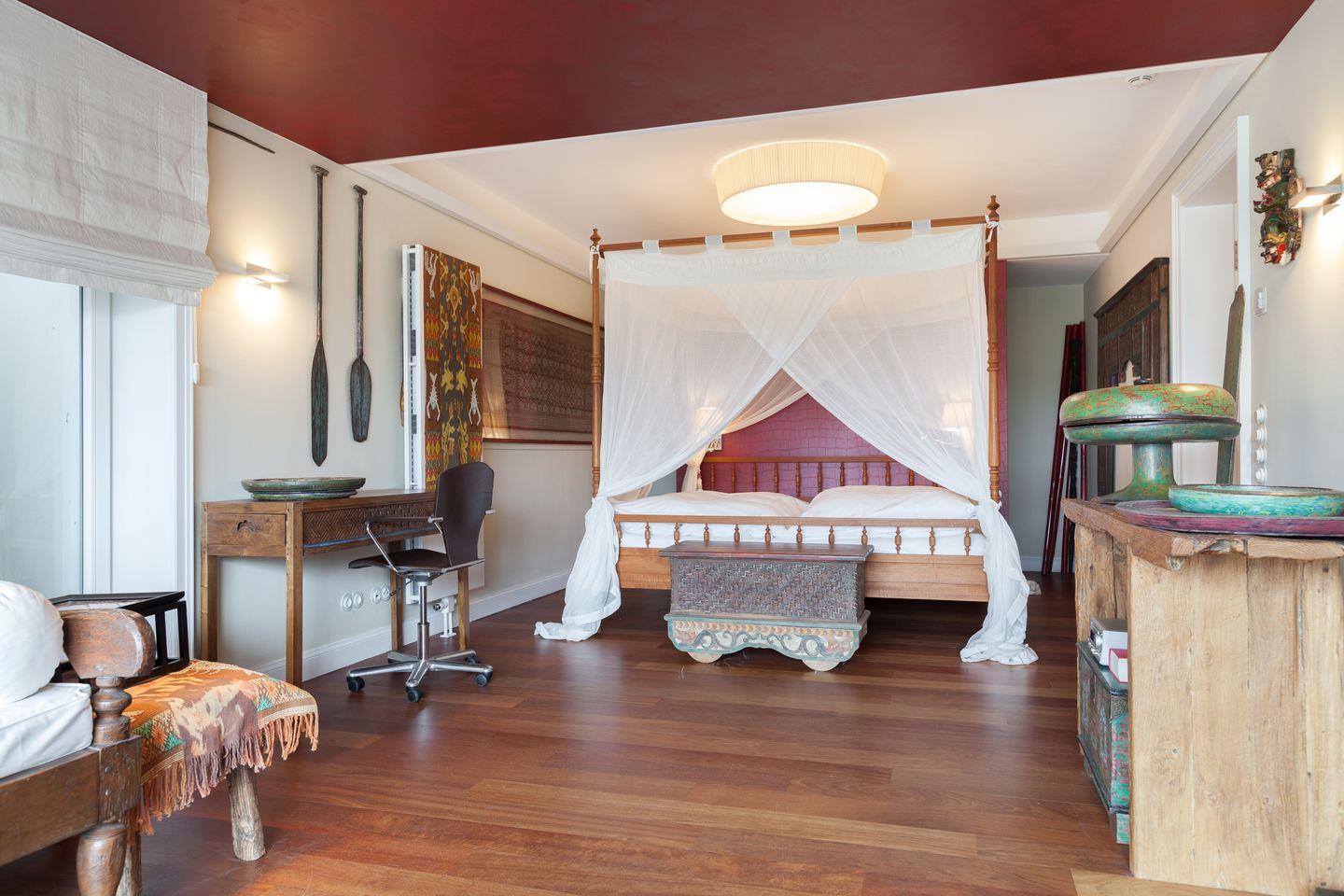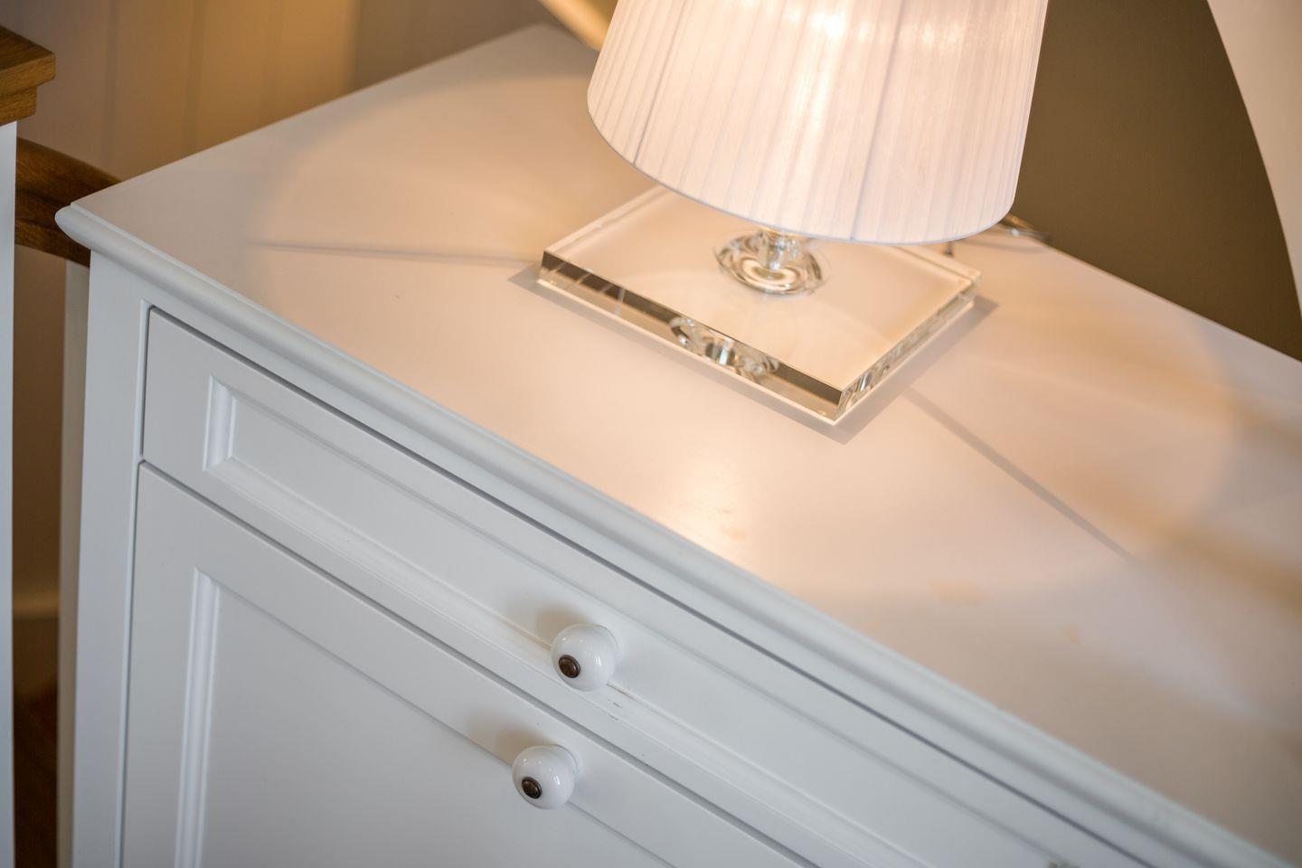 Sofern das Feinperlige geleert sein sollte und der letzte Schweinswal von dannen zog, haben Sie sich Ihre Nachtruhe wohlverdient. Hier im Obergeschoss können Sie gleich aus zwei superben Master-Bedrooms mit jeweils imposanter Deckenhöhe wählen, die ein einzigartig luftiges Raum- und Wohlfühlgefühl erzeugen. Ihr Schlafbereich zum Nord-Westen ausgerichtet bietet vollen Meerblick und ist geschmackvoll mit wertigen Antiquitäten ausgestattet. Zwei begehbare Kleiderschränke finden Sie von kundiger Tischlerhand hinter Ihrem Doppelbett eingebaut. Ein Traum, bei geöffnetem Fenster einzuschlafen bzw. aufzuwachen. Und stets mit wohligem Meeresrauschen. 'Die schönste Musik der Welt', so ein Urlaubsgast, 'hörte ich von meinem Schlafzimmer aus. TV vor dem Einschlafen? Reinste Zeitvergeudung.'