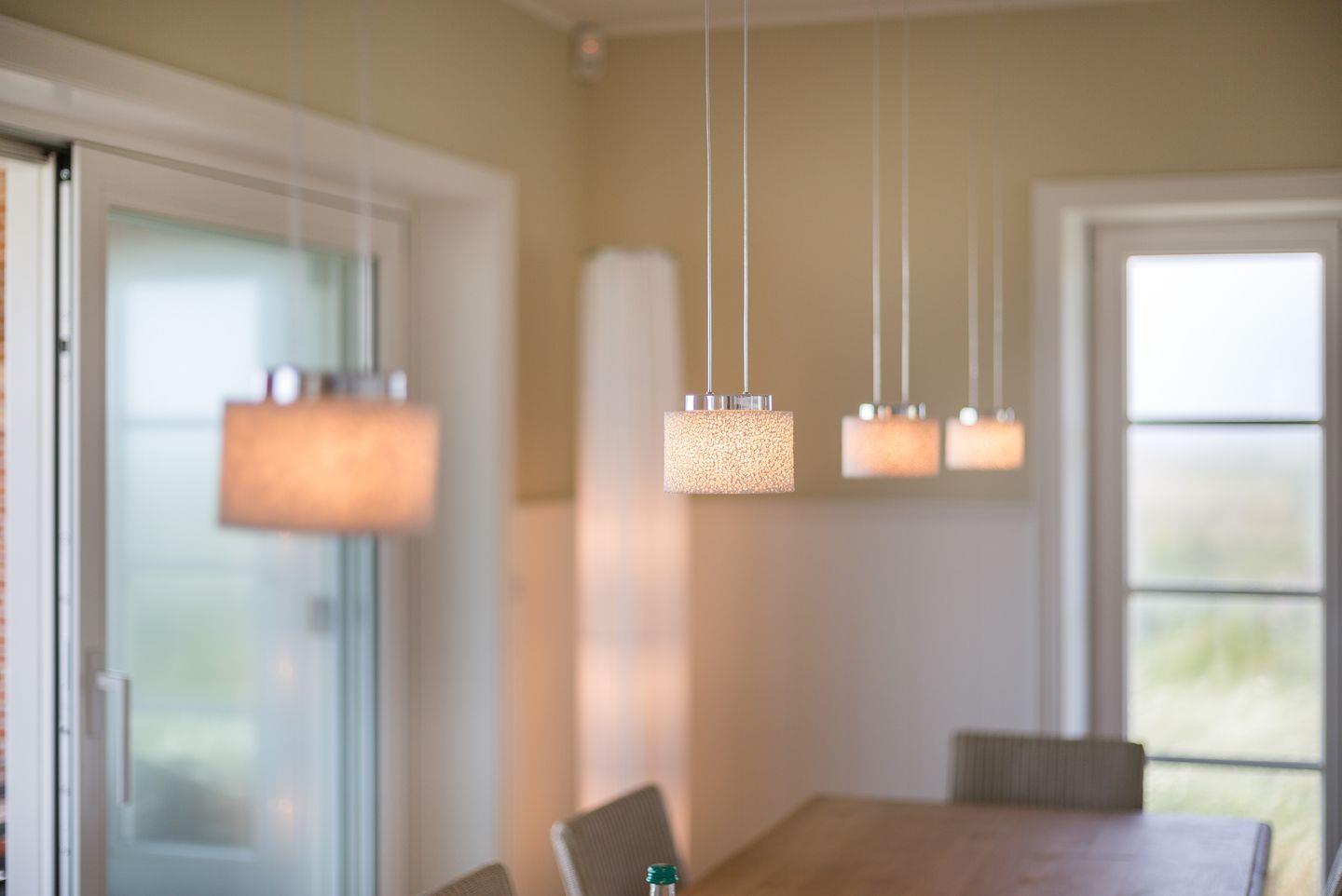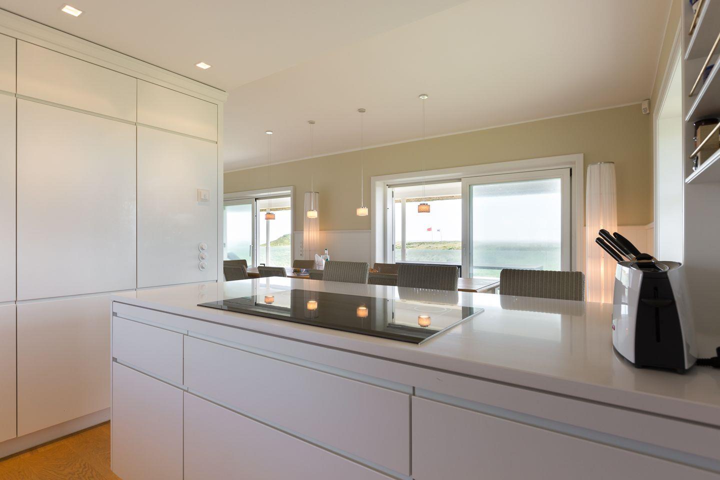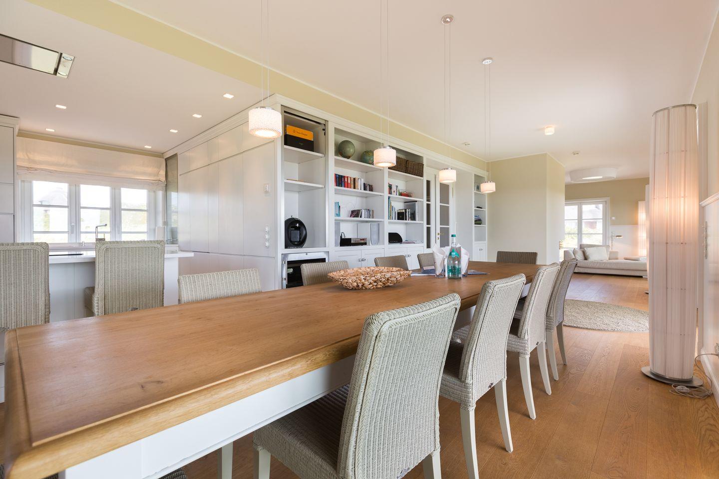 Als nächstes Highlight entdecken Sie Ihren riesigen Eichentisch -oder besser: Ihre herrschaftliche Tafel- mit verschwenderisch viel Platz auch für die ganz große Familie. Schöner als mit diesem Meerblick werden Sie nicht dinieren können. Aber auch für einen gemütlichen Spiele- oder Rotweinabend in großer Runde eignet sich Ihre Tafel perfekt. Die Luxus-Küche schließt sich der Esstafel an, optisch geschickt durch einen Esstresen getrennt. Stets in Griffnähe: der Liebherr Weinklimakühlschrank, damit Ihre flüssigen Schätze auch im Urlaub adäquat lagern. Geschirrspüler, Microwelle und Induktionsherd verstehen sich von selbst. Ein Detail, dennoch erwähnenswert: Selbstverständlich sind das hochwertige Porzellan, das[nbsp][nbsp]geschmackvolle Besteck sowie ein Gläsersortiment, das auch verwöhnte Weinconaisseure begeistert, jeweils üppig dimensioniert. Gäste-WC und große Diele.