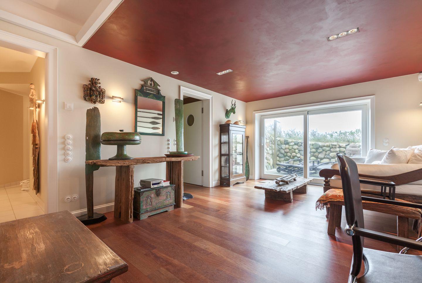 Steter Blickfang ist die prächtige, über die ganze Erdgeschossfläche verlaufende Glas-Veranda, die durch große Schiebe-Elemente aus Glas zu öffnen ist - es stellt sich ein fantastisches Wohngefühl durch stetig wechselnde Lichtspiele über dem Meer ein, das man einfach erlebt haben muss. Die Veranda lädt zu einem superben Open-Air Erlebnis, das Sie auf Ihrem edlen Outdoor-Lounge Mobiliar genießen können. Die zweite Möglichkeit, das eindrucksvolle Schauspiel des Meeres zu inhalieren, bietet Ihnen eine Süd-West Panorama-Terrasse mit Sitzbank- und Tischensemble im massiven, puristischen Treibholz-Stil. Wem das noch nicht reicht, den macht dann wahrscheinlich ein reetgedeckter (!) Tee-Pavillon, für besonders schöne und romantische Sonnenuntergänge über dem Meer vollends sprachlos.