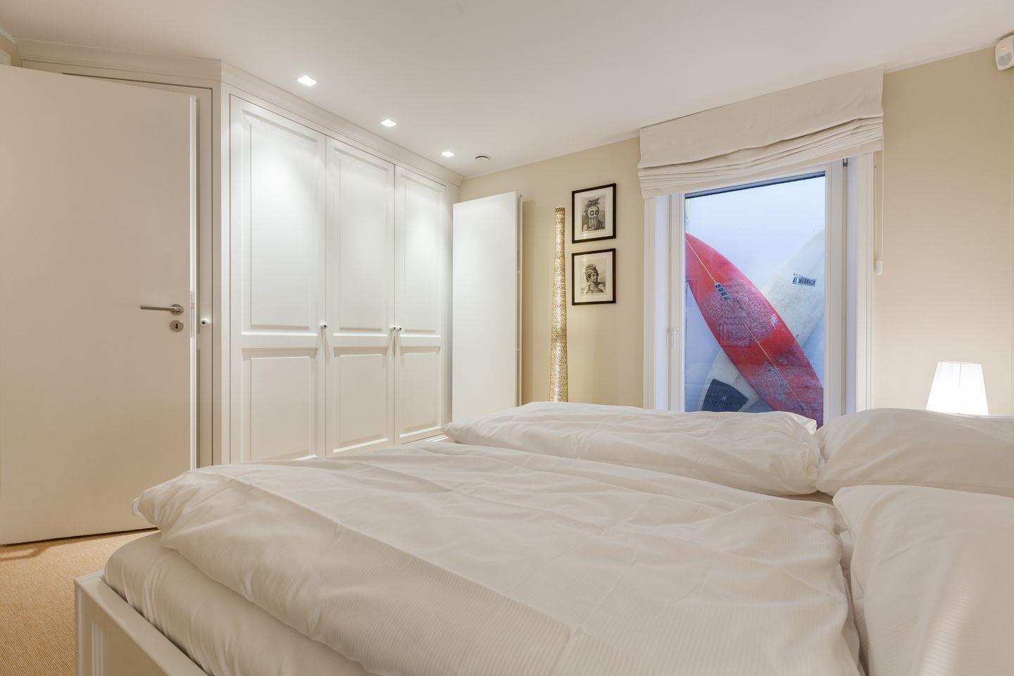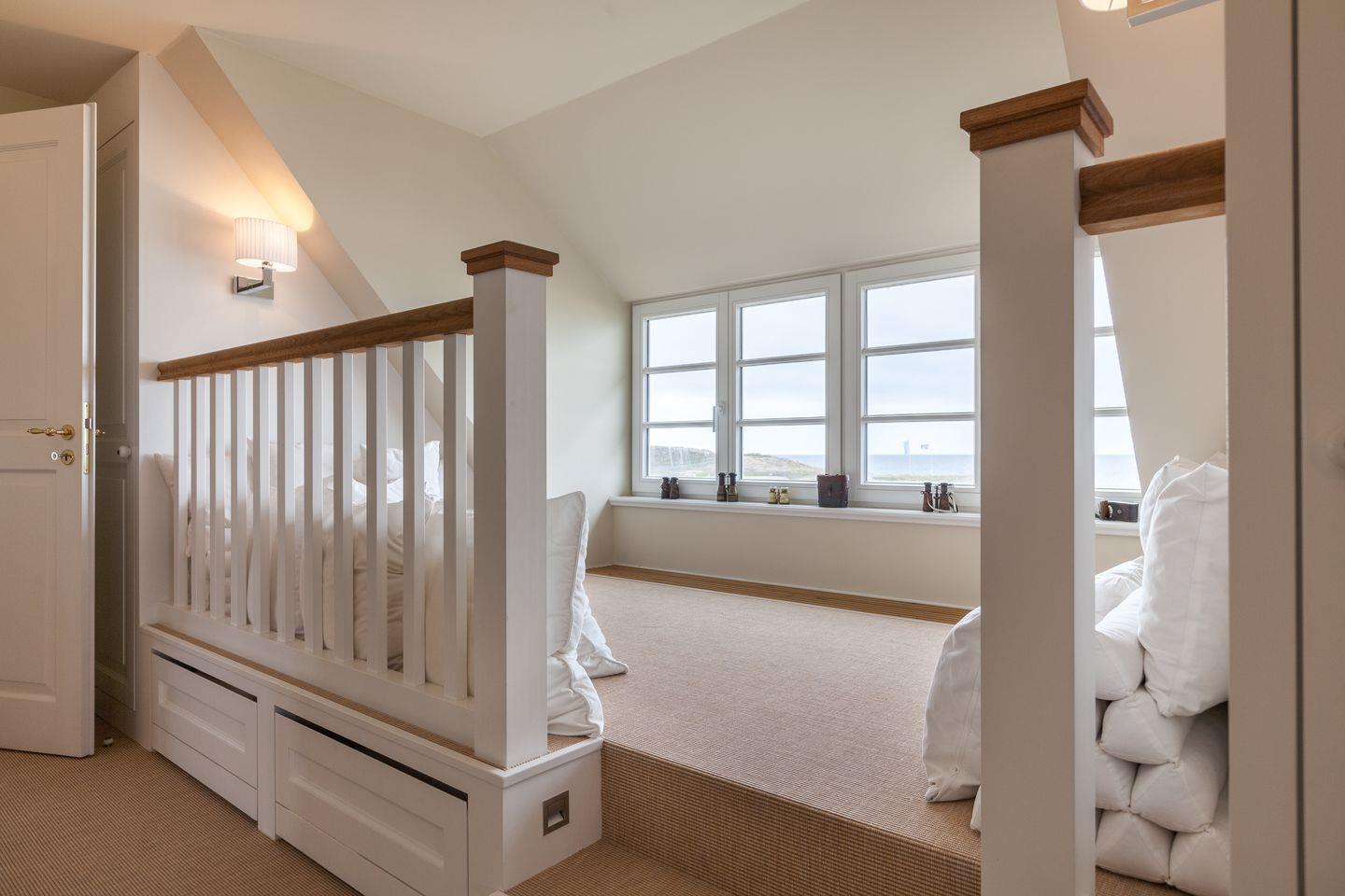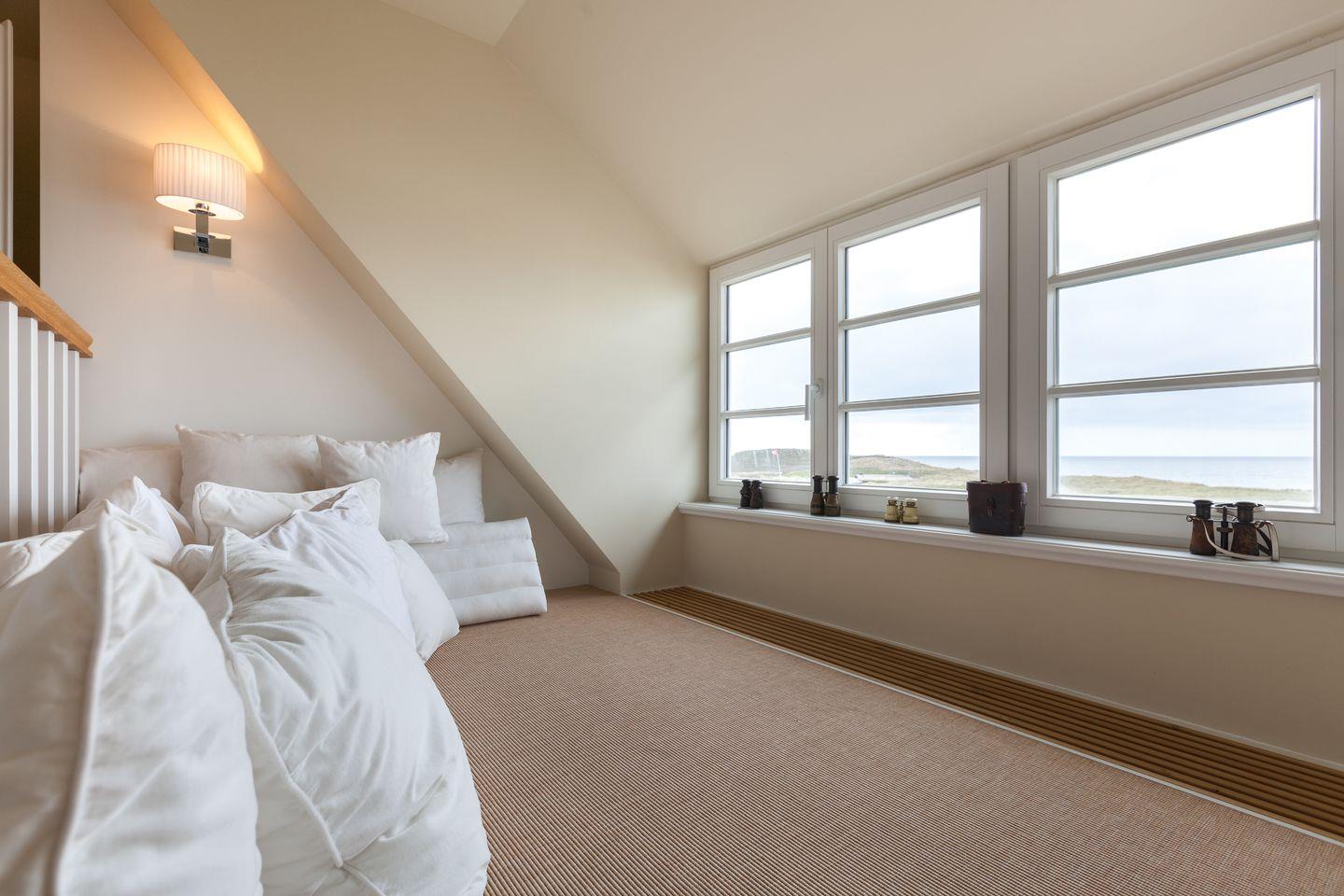 Der einmalige Meerblick sowie das beruhigende Meeresrauschen ist Ihnen von Ihrem süd-westlichen Masterbedroom aus ebenfalls vergönnt. Von dieser Räumlichkeit aus bietet sich Ihnen zusätzlich die beeindruckende Aussicht auf das benachbarte Amrum. Neben einem Doppelbett w
