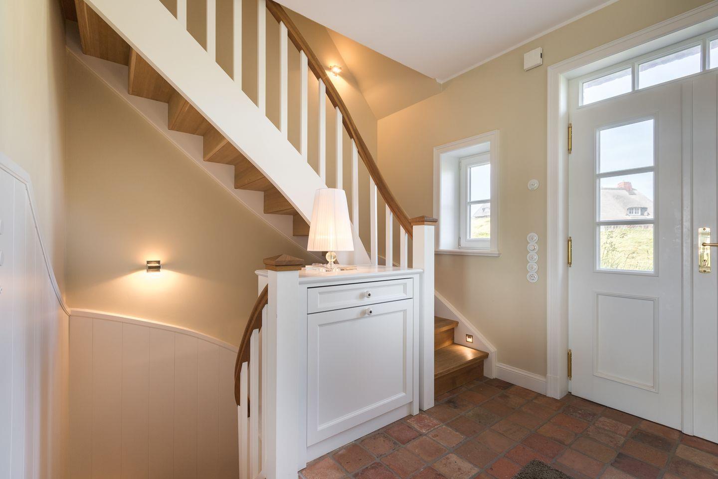 Sie gelangen die illuminierte, fein gearbeitete Eichentreppe empor und sehen als erstes: Das Meer. Und zwar von seiner schönsten Seite. Hier, quasi im heiligen Zentrum Ihrer Villa, finden Sie Ihre eigene "Whale-Watching-Station", eine Empore zum Innehalten und Müßiggang, eine Luxus-Lounge als Serenity-Retreat. Ein nahezu meditativer Ort. Liebevoll wurde Ihre Indoor-Aussichtsplattform auch bereits von einem Gast als 'Ort der vielen Oders' bezeichnet: