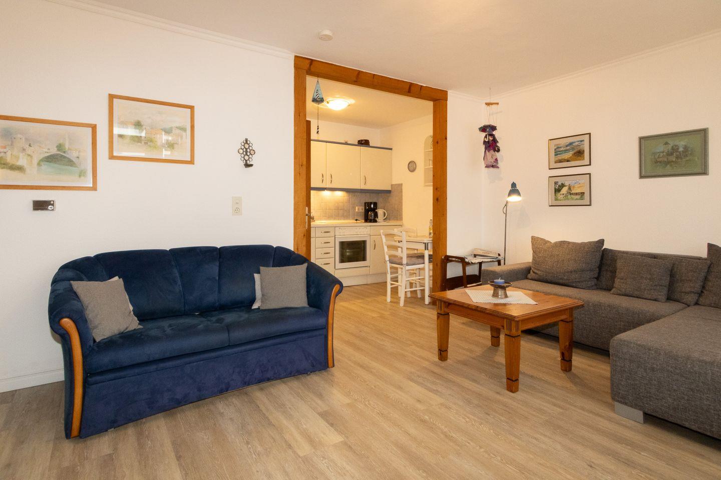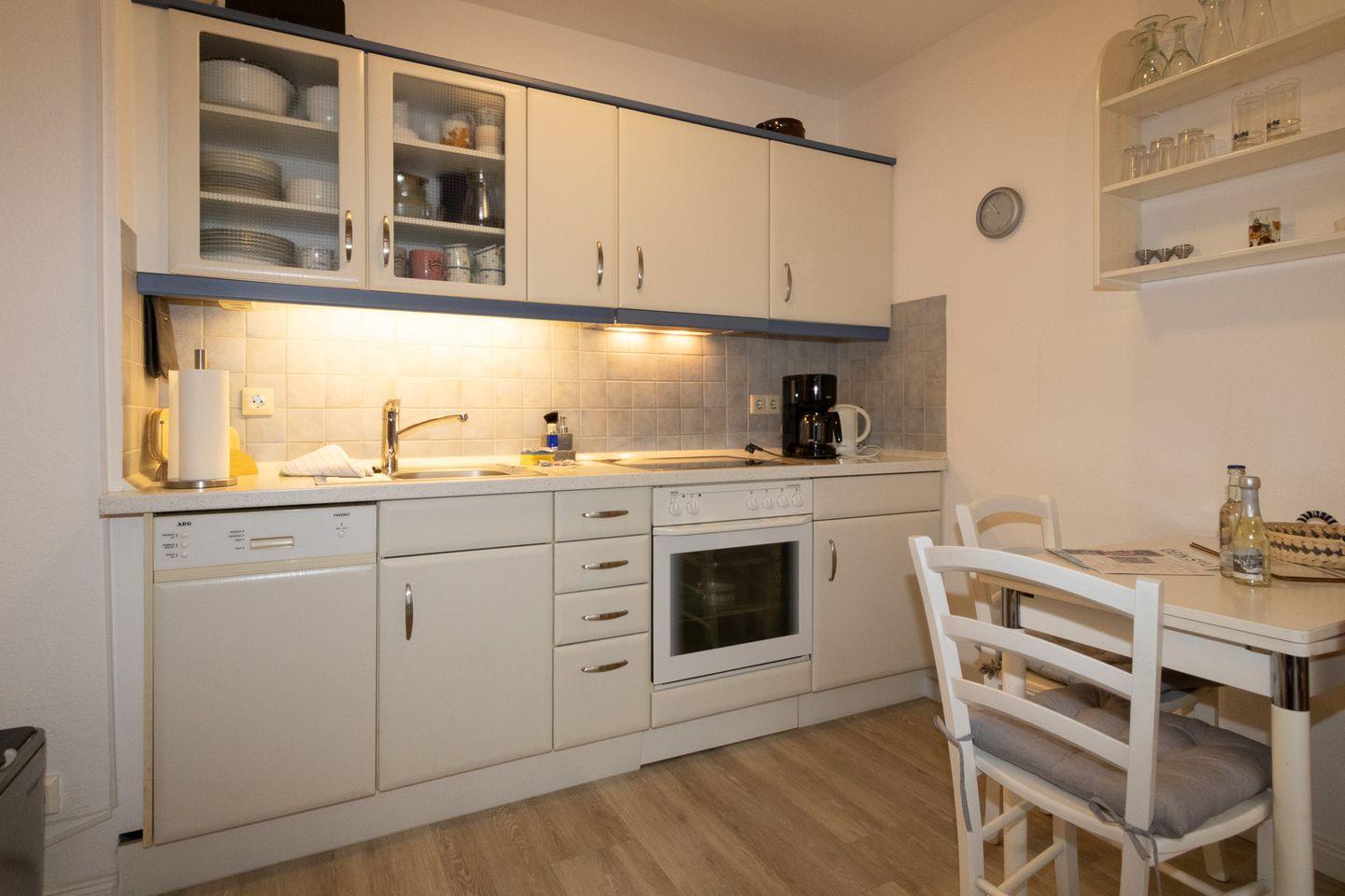 Die Wohnung Ewald ist für 2 Personen sehr gut geeignet. Vom großzügigen Wohnraum gelangen Sie auf den geräumigen Balkon. Das Schlafzimmer befindet sich direkt hinter dem Wohnzimmer. Der Strand, Hafen und auch die Einkaufsmöglichkeiten sind gut zu Fuß in wenigen Minuten zu erreichen. Im Wohnbereich gibt es eine gemütliche Couchgarnitur mit TV. Die Küchenzeile grenzt direkt an dem Wohnbereich an und ist mit sämtlichem Zubehör ausgestattet und enthält neben Cerankochfeld und Backofen auch einen Geschirrspüler.