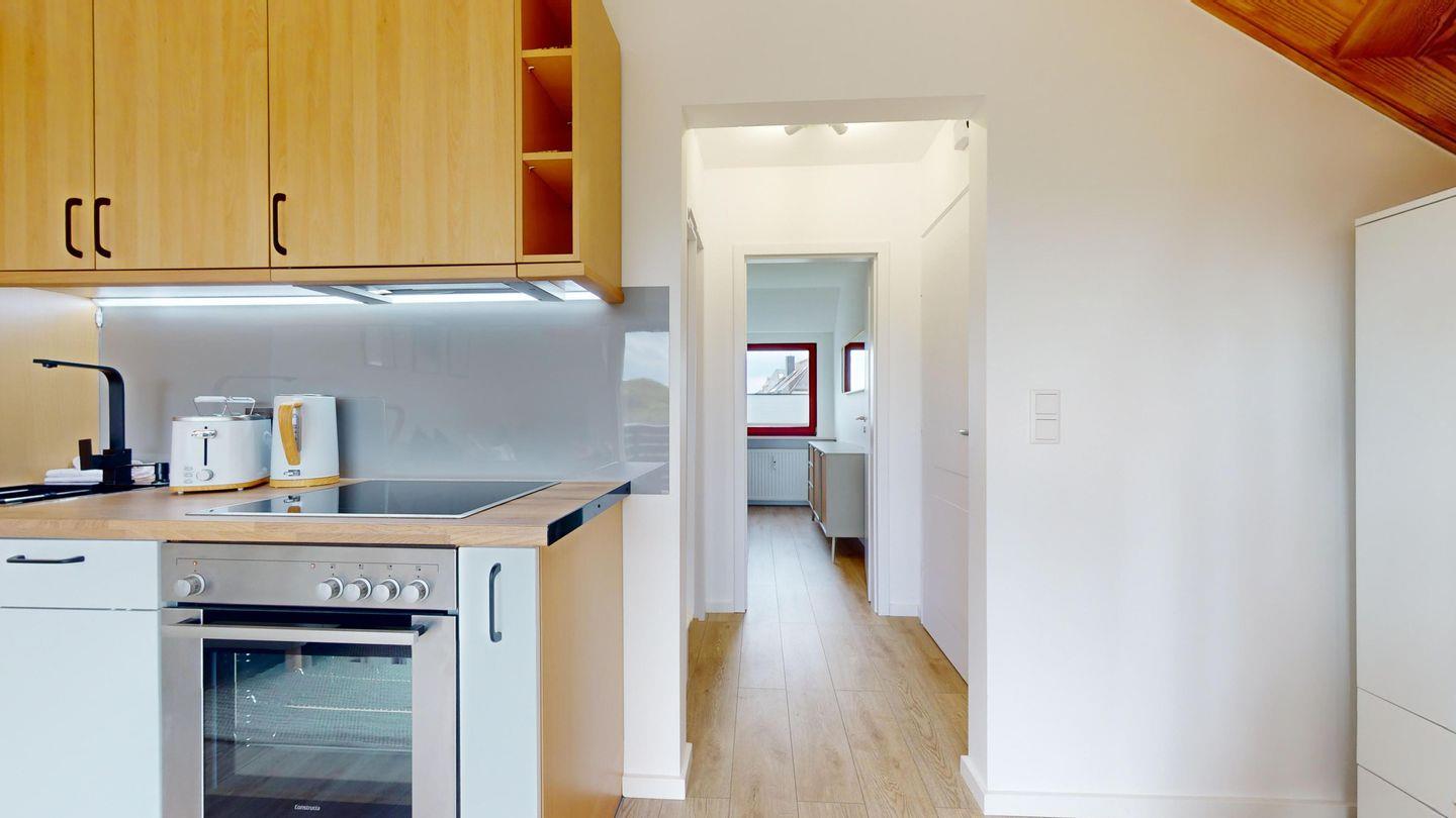 Der großzügige Wohnbereich bietet eine einladende Sofaecke, ideal für entspannte Abende. Von hier aus haben Sie direkten Zugang zum Balkon. Die voll ausgestattete, offene Küche lässt keine Wünsche offen und lädt zum gemeinsamen Kochen und Genießen ein.