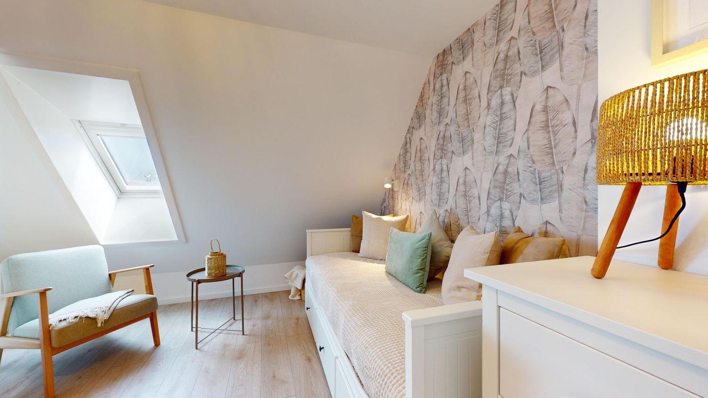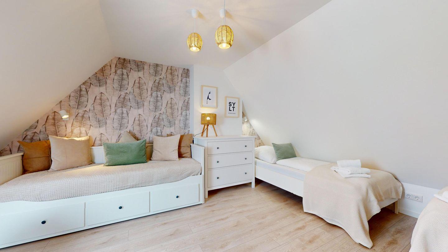 Im oberen Stockwerk erwarten Sie 2 Einzelbetten und ein Tagesbett. Hier finden Sie erholsamen Schlaf und starten voller Energie in den Tag.