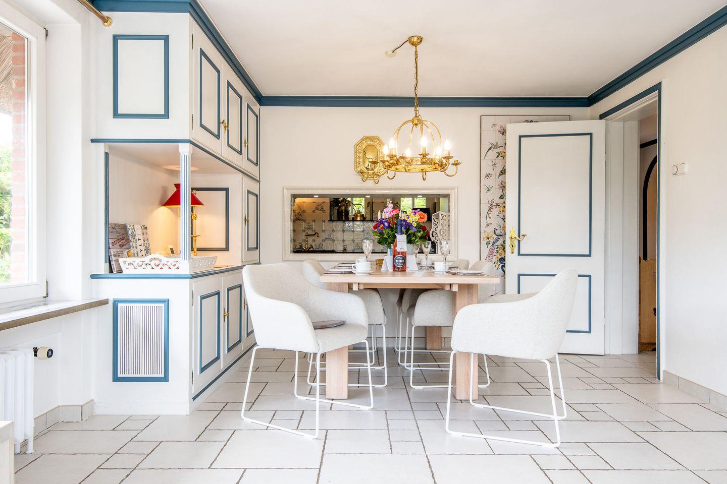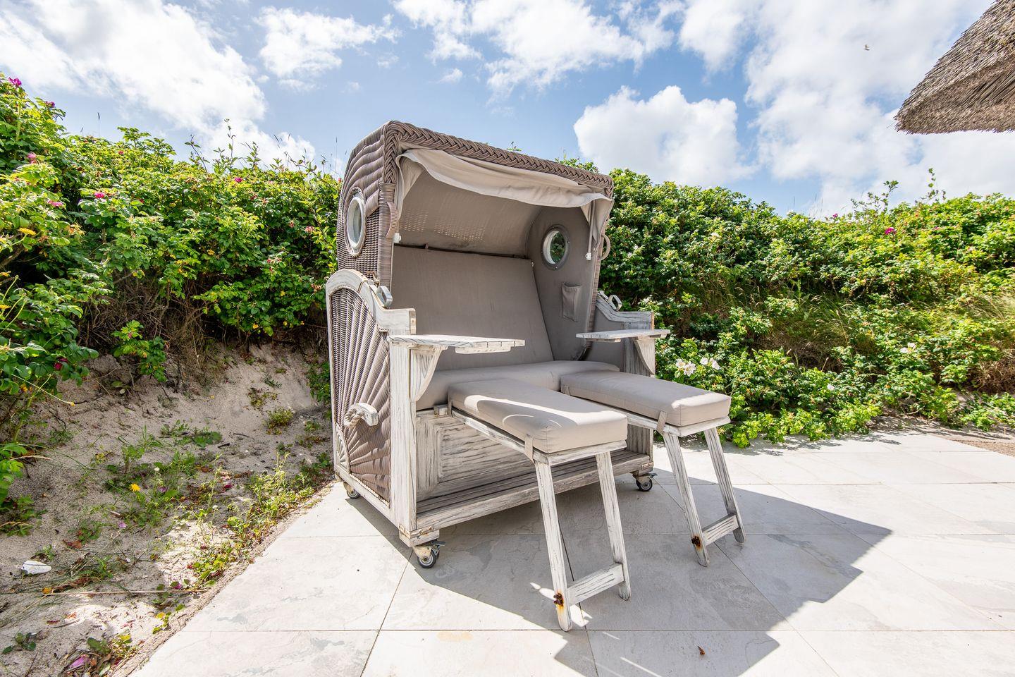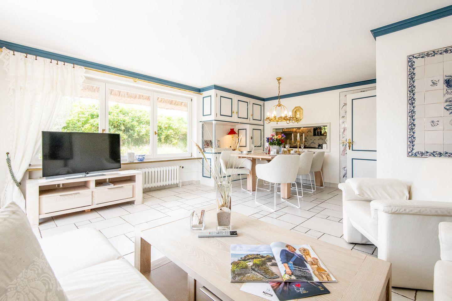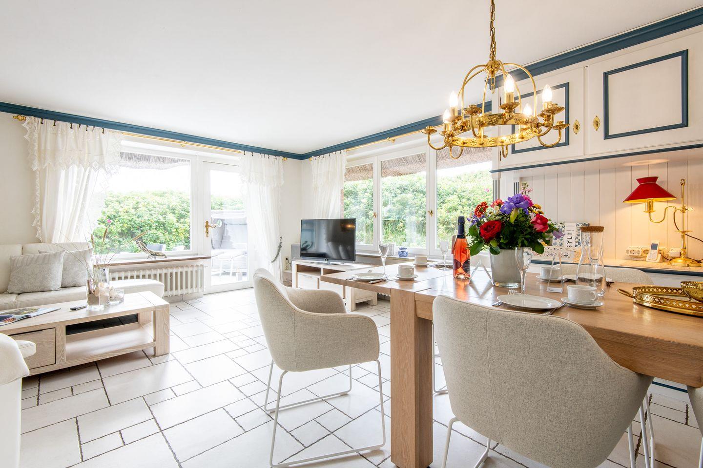 Das großzügige Wohnzimmer mit einer Essgelegenheit für 6 Personen öffnet sich direkt zur windgeschützten Südterrasse. Hier erwarten Sie komfortable Gartenmöbel und ein Strandkorb – der ideale Ort, um die frische Nordseeluft zu genießen und den Blick auf die umliegenden Dünen schweifen zu lassen. Die offen gestaltete Küche ist voll ausgestattet und bietet alles, was Sie für gemeinsames Kochen und Genießen benötigen.