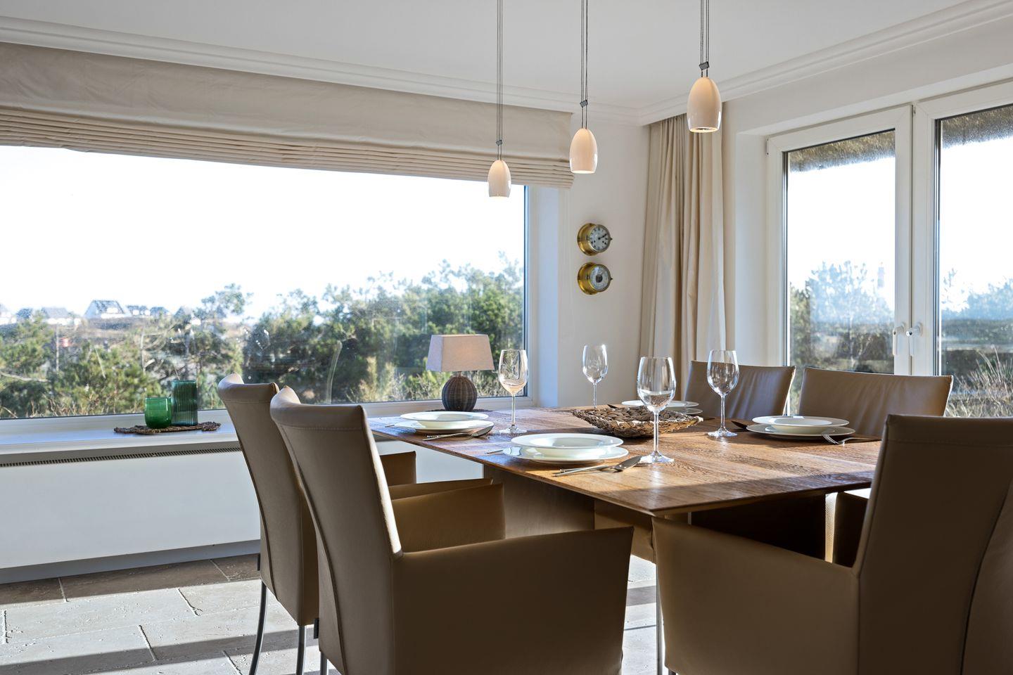 Die große Holzbohlen-Terrasse bietet mit ihrem massiven Teak-Tisch (im Sommer) den perfekten Ort, um in der Natur zu verweilen. Von hier aus haben Sie einen weitläufigen Blick bis hin zu den Inseln Amrum und Föhr. Zudem haben Sie die Möglichkeit in Ihrem eigenen Strandkorb zu entspannen.