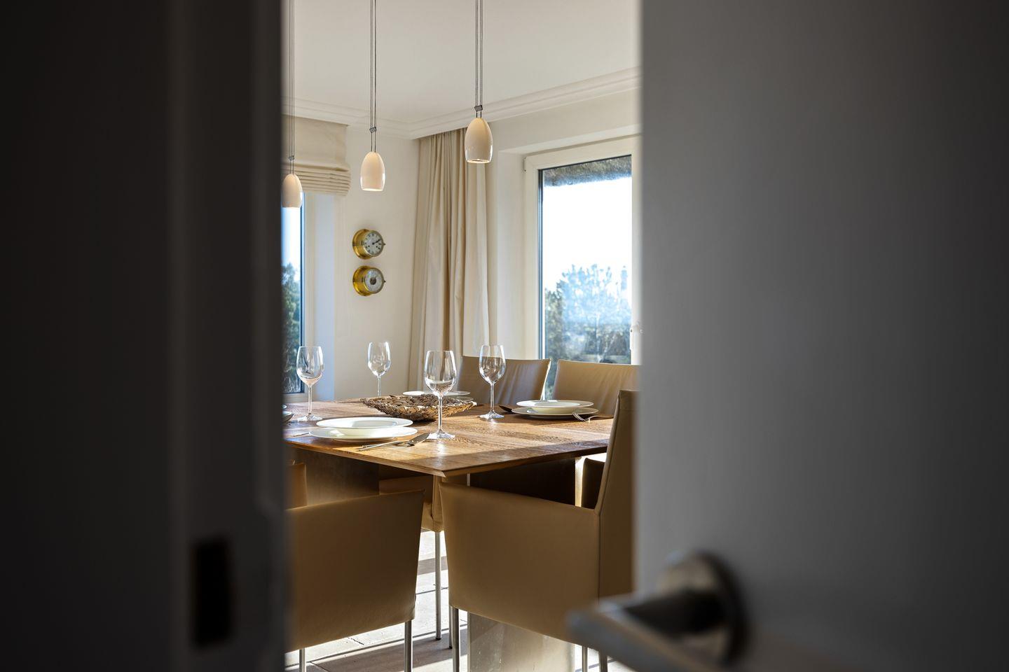 Die offene, hochwertige Küche ist voll ausgestattet und lädt dazu ein, gemeinsame Kochmomente am gegenüberliegenden großzügigen Esstisch zu genießen.