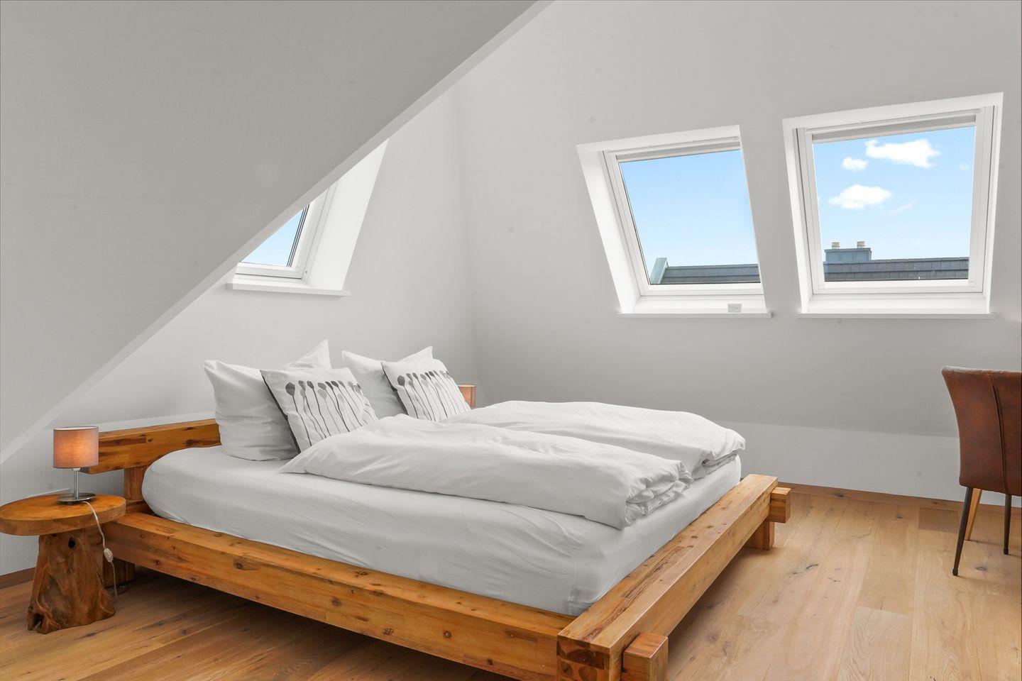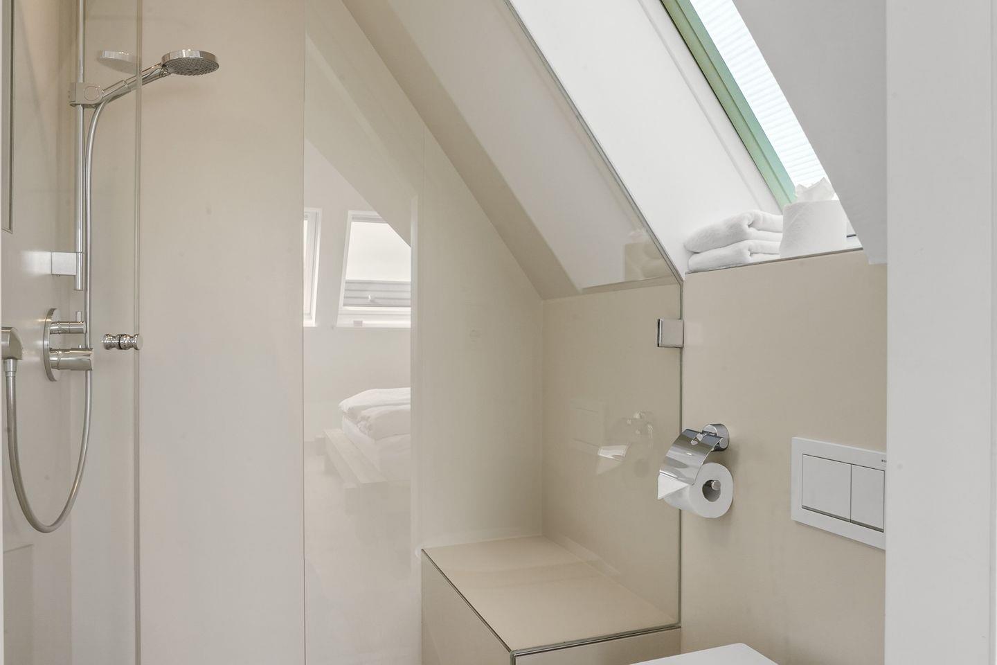 Ein weiteres Highlight erwartet Sie im oberen Geschoss: Das deckenhohe Schlafzimmer mit Ankleide, eigenem Flatscreen-TV sowie einem kleinen Ensuite-Badezimmer (Dusche/WC). Von den Dachfenstern genießen Sie einen traumhaften Blick über die Nordsee und das Wattenmeer – ein perfekter Ort zum Aufwachen und Abschalten.