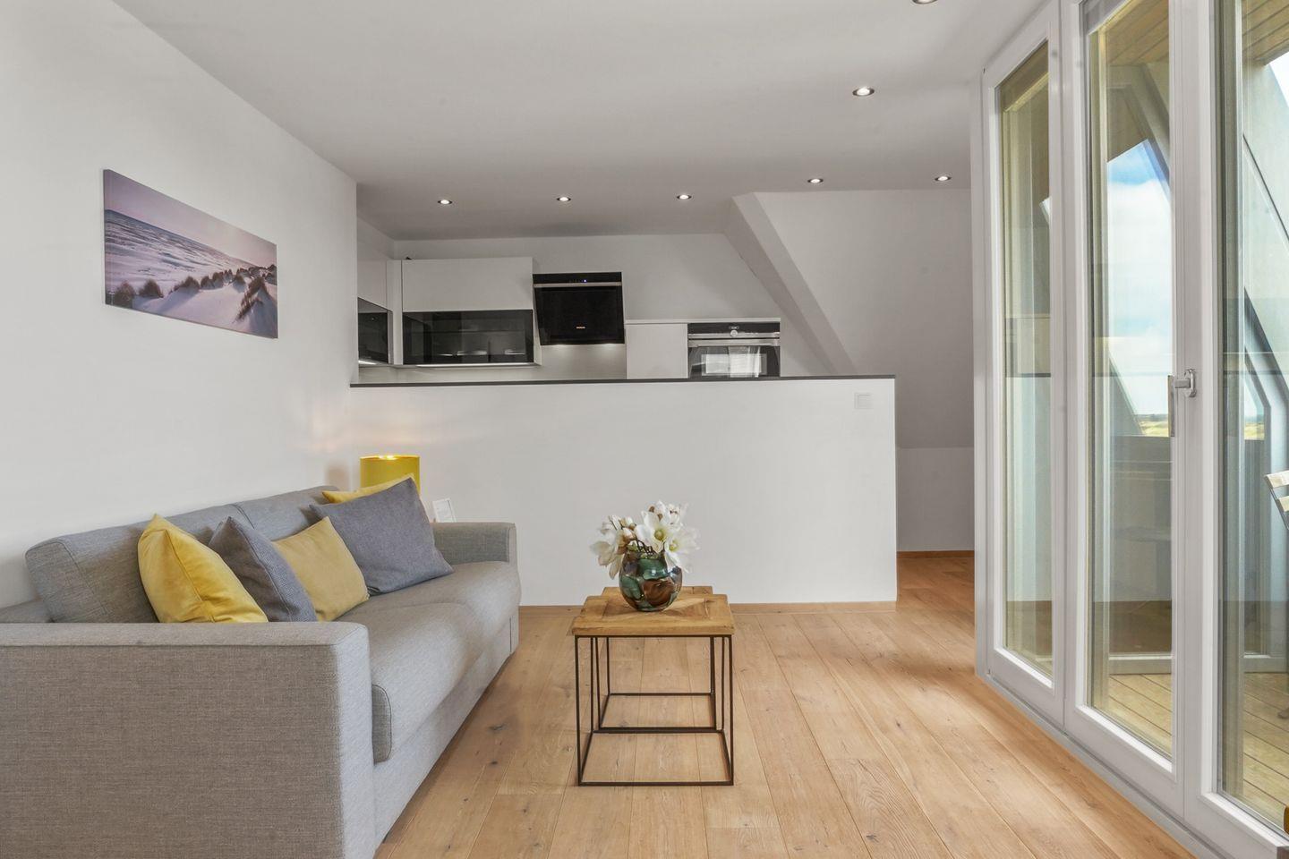 Der Essplatz bietet Raum für bis zu vier Personen, und das LIGNE ROSET-Schlafsofa (160?x?200?cm) im Wohnbereich ermöglicht auch spontanen Übernachtungsgästen einen komfortablen Aufenthalt. Für Unterhaltung sorgen eine Sonos-Box, ein Radio und ein Flatscreen-TV. Der kleine Balkon lädt zum Frühstück mit Aussicht ein – bei klarer Sicht können Sie bis nach Amrum oder Wyk auf Föhr blicken, während sich vor Ihnen die Sylter Dünen- und Heidelandschaft ausbreitet.