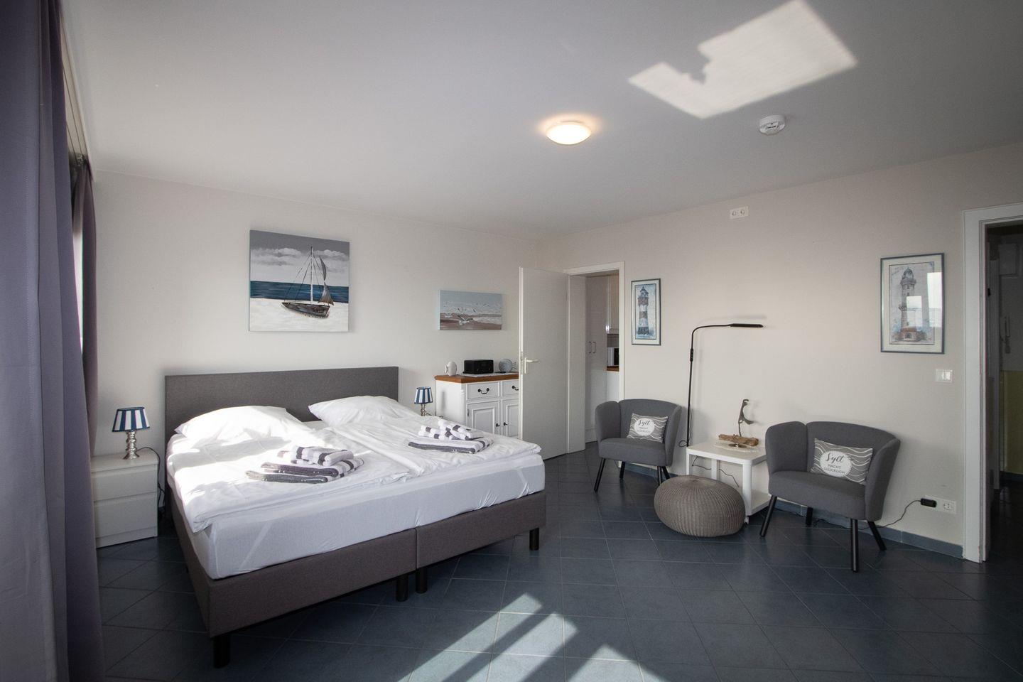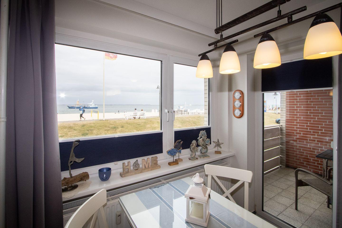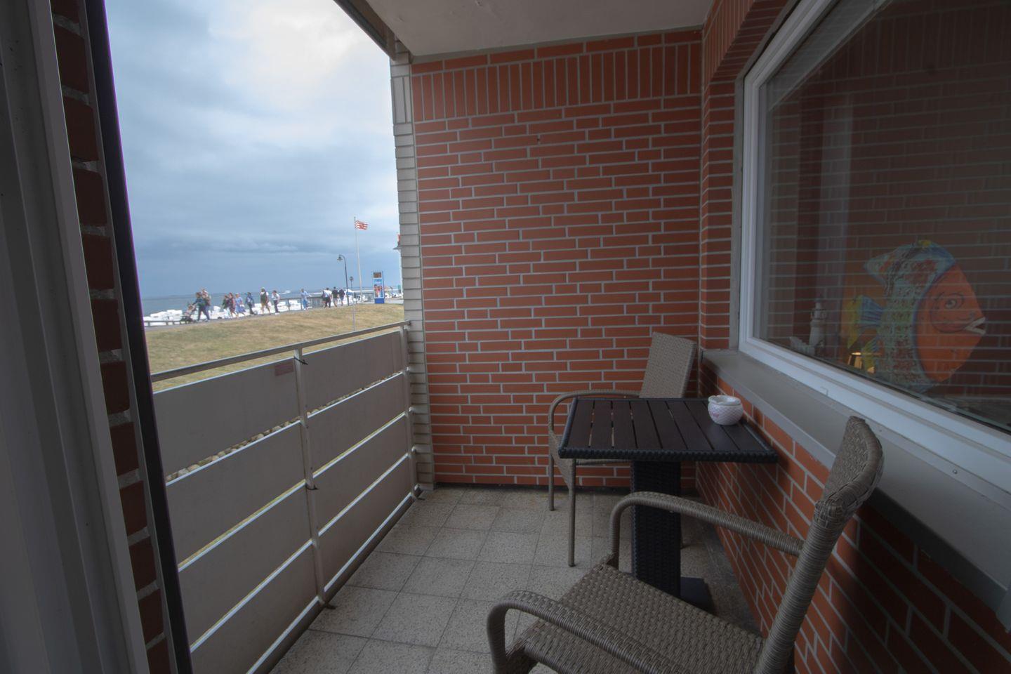 Der Wohnbereich lädt zum Entspannen ein und bietet Möglichkeiten zur individuellen Freizeitgestaltung. Für Ihre Unabhängigkeit sorgt die vorhandene Küche, in der Sie nach Belieben Mahlzeiten selbst zubereiten können. Ein Balkon bietet Ihnen Freiraum an der frischen Nordseeluft – ideal, um den Tag in privater Atmosphäre ausklingen zu lassen oder die inseltypische Ruhe zu genießen.