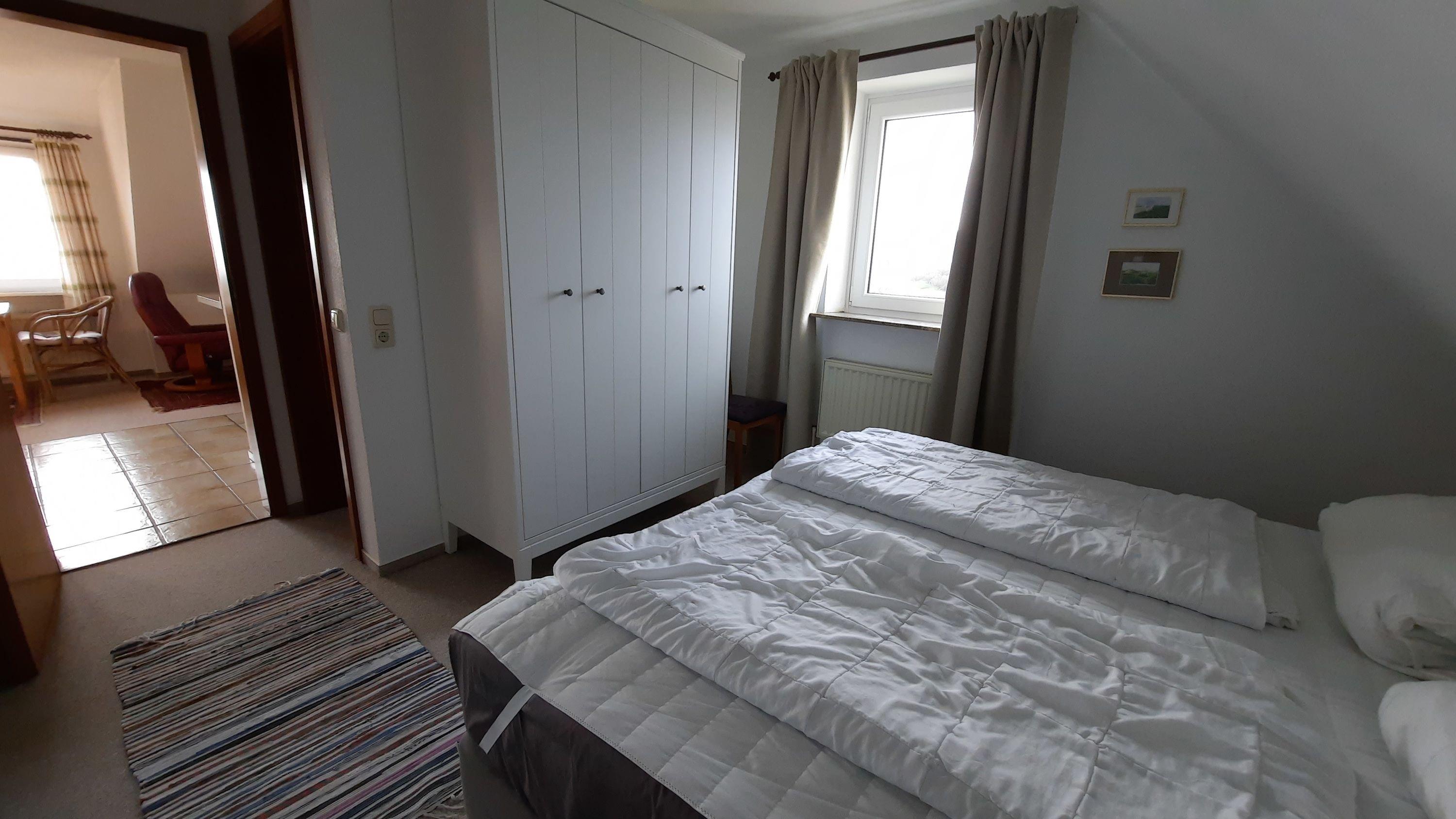 Diese kleine Ferienwohnung für zwei Personen im Haus Meerblick hat zwei getrennte Zimmer, davon ein neues Schlafzimmer mit Boxspringbett, und ein Wohnzimmer mit Küchenzeile.