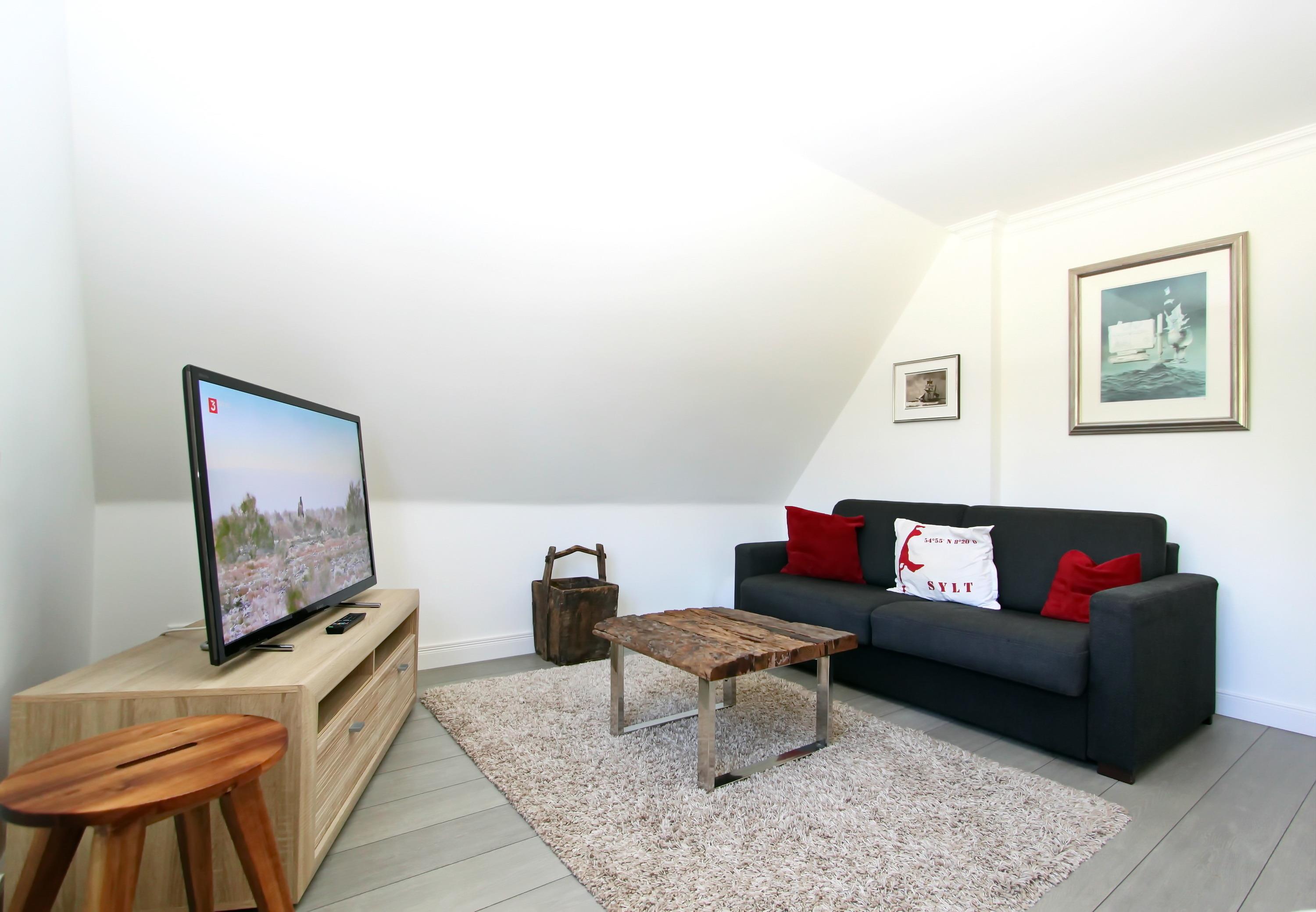 Der Wohnraum ist mit einer bequemen Doppelschlafcouch mit vollwertiger Schlaffunktion, einem Couchtisch, zwei bequemen Lesesesseln, 3 Sideboards, einem hochwertigen Flatscreen-TV, Internetradio sowie einen großzügigen Essplatz ausgestattet. Auf gleicher Ebene befindet sich ein Duschbad/WC sowie eine komplett ausgestattete, kleine aber feine Einbauküche, die es an nichts missen lässt.