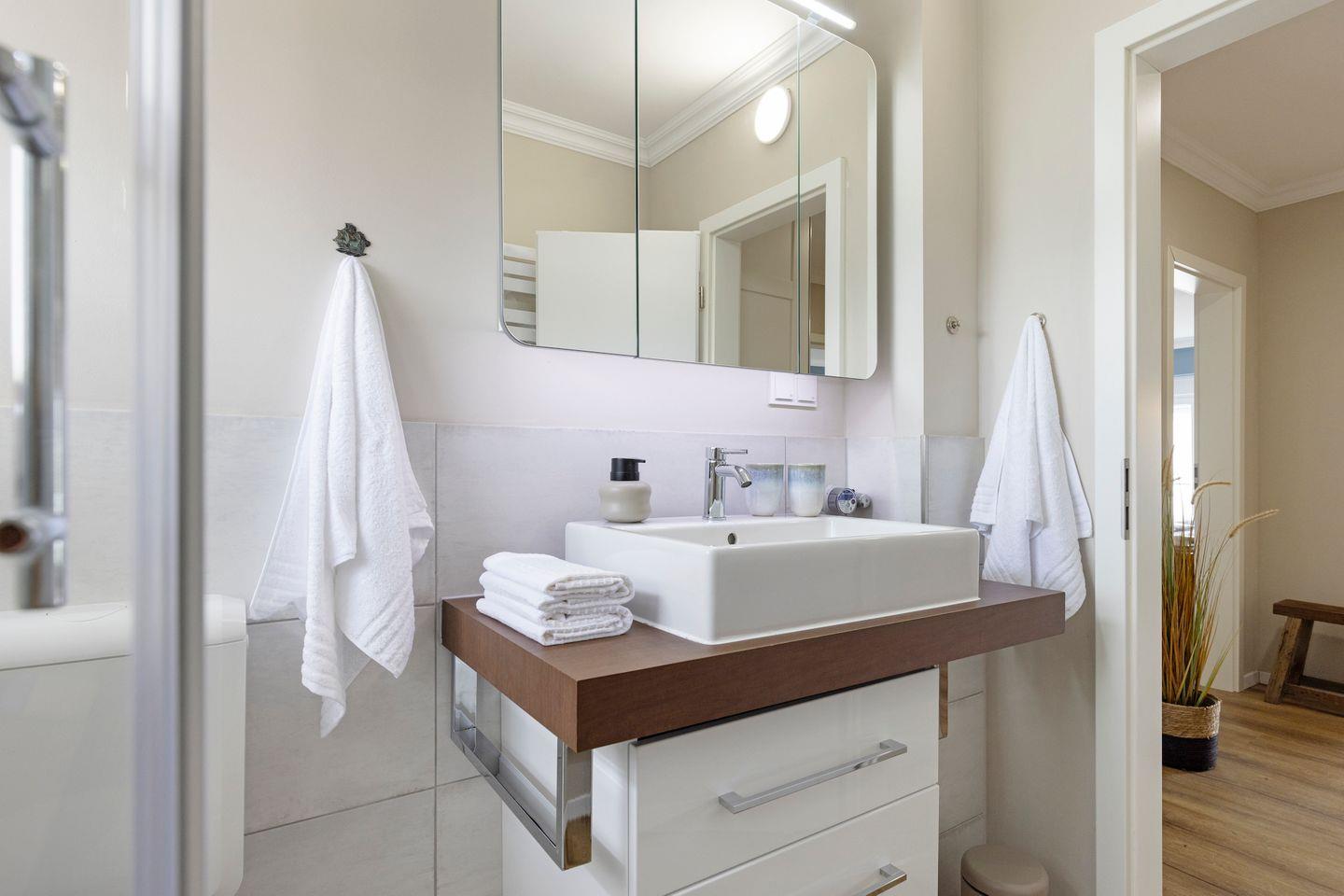 Beginnen Sie Ihren Urlaubstag im stilvollen Tageslichtbad. Dieses verfügt über
