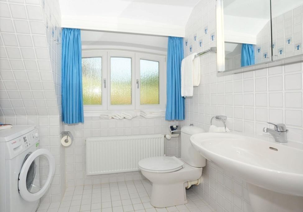 Zwei Badezimmer sorgen für Komfort und Wohlgefühl: Ein maritim blau gefliestes Badezimmer mit Dusche und Tageslicht, das für echtes Sylt-Flair sorgt, und ein weiteres Badezimmer mit Dusche, WC, Fön und Waschmaschine.