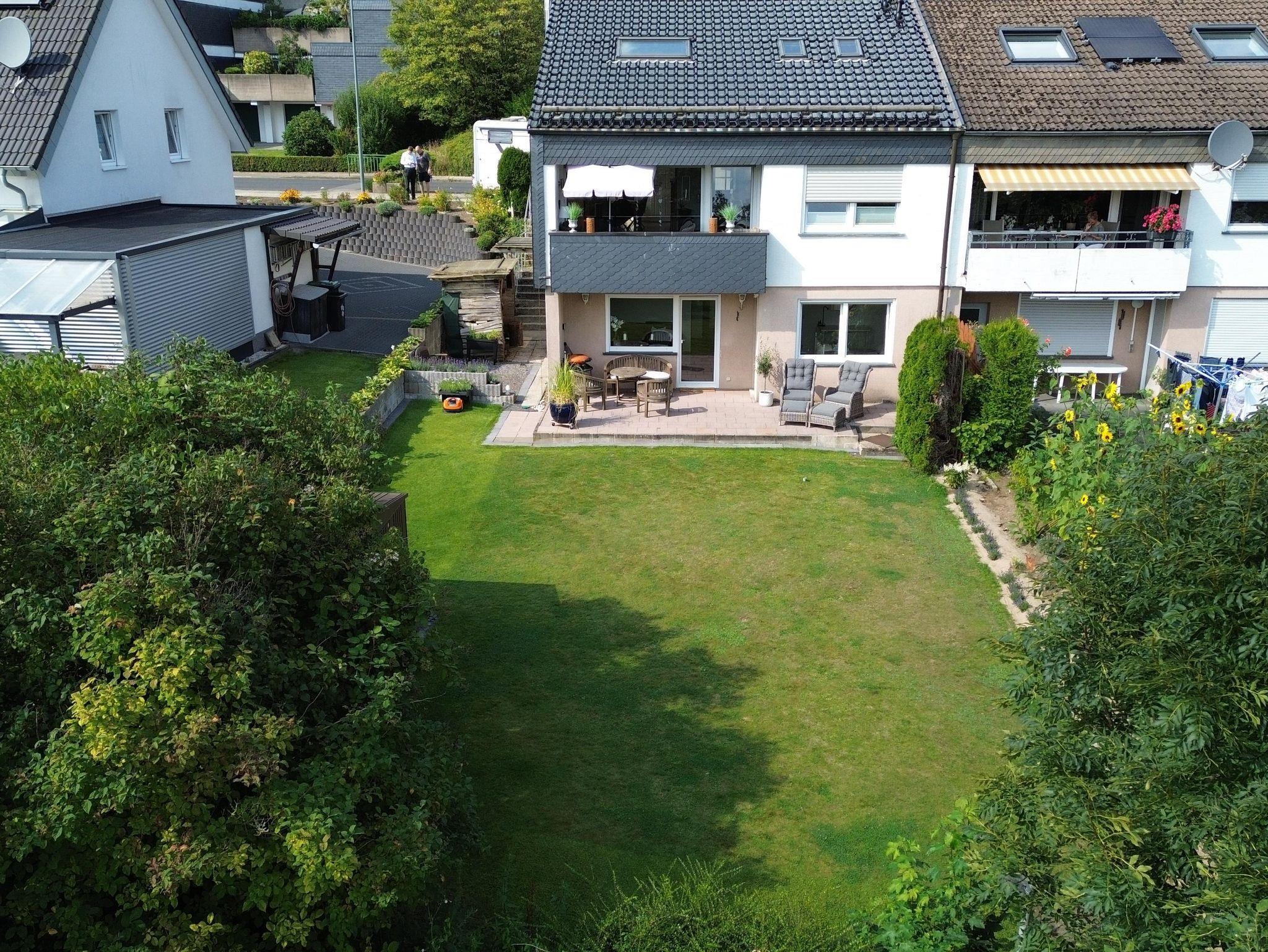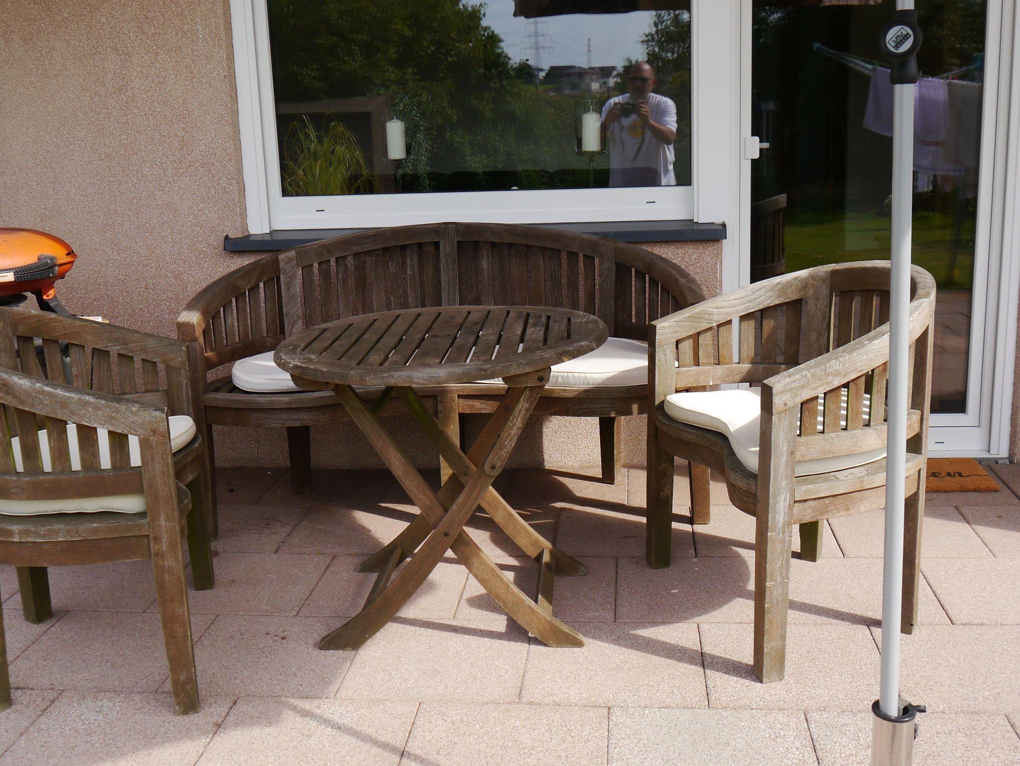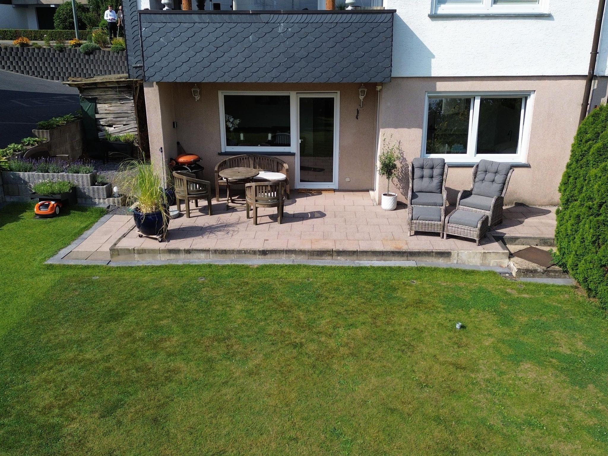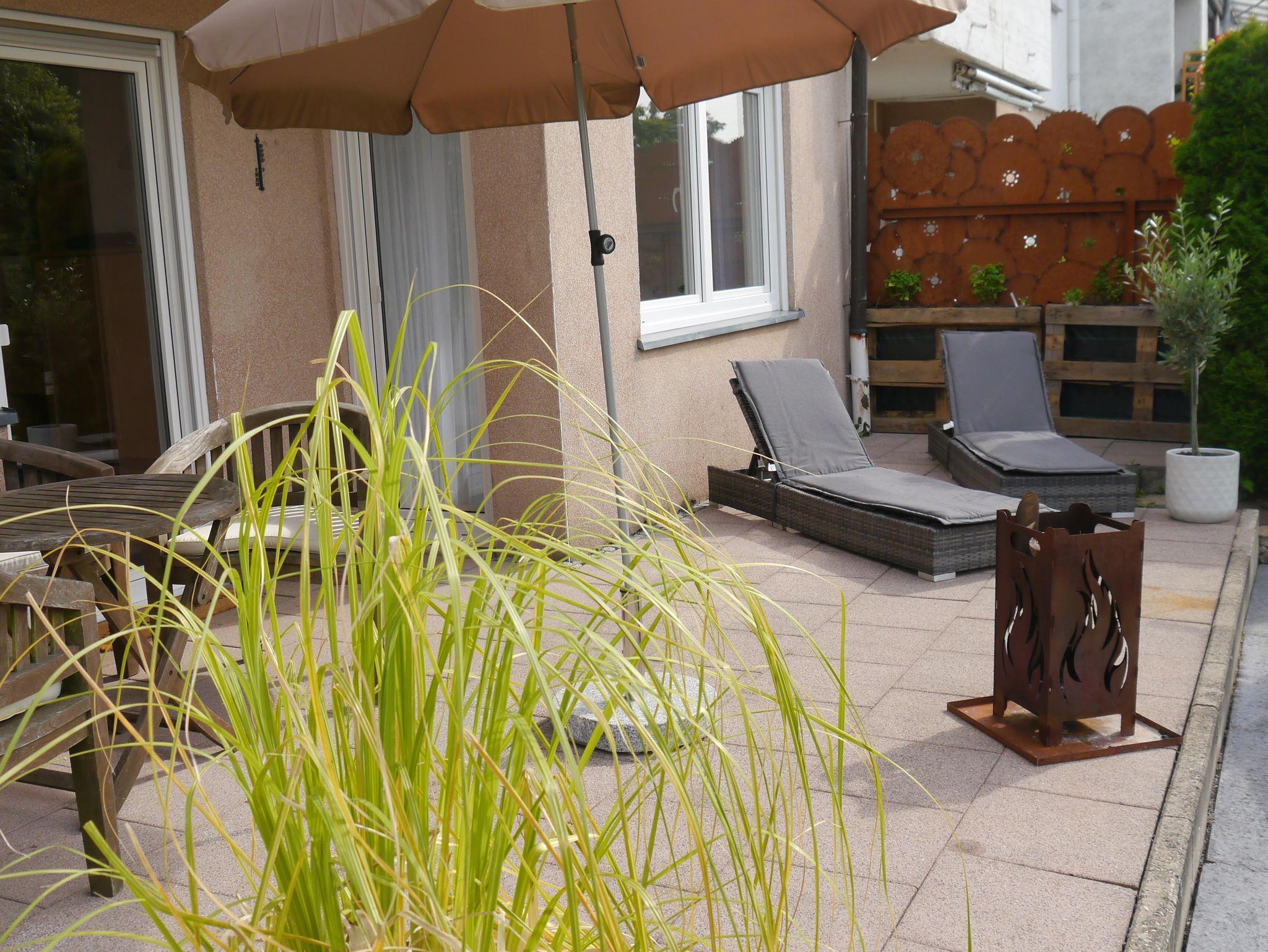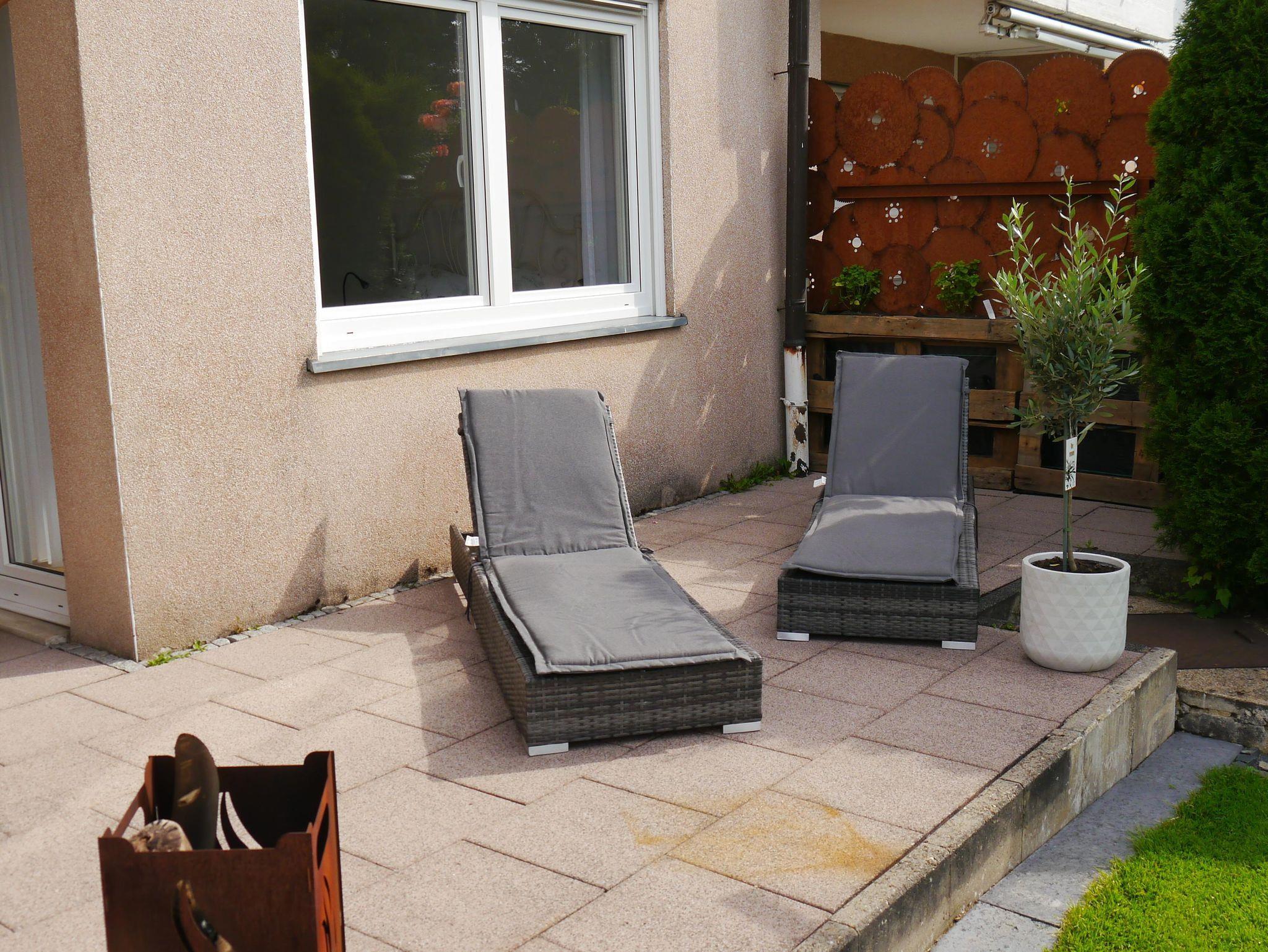 Zur Ferienwohnung gehört eine ca. 32m2 große möblierte Terasse. Auf der Terassen findet Ihr neben einem Gas-Grill, eine Sitzgruppe sowie zwei Liegen. Zu den Terassenmöbeln stehen passende Polster bereit. An die Terasse schließt sich ein ungefähr 250 m2 großer Garten an.