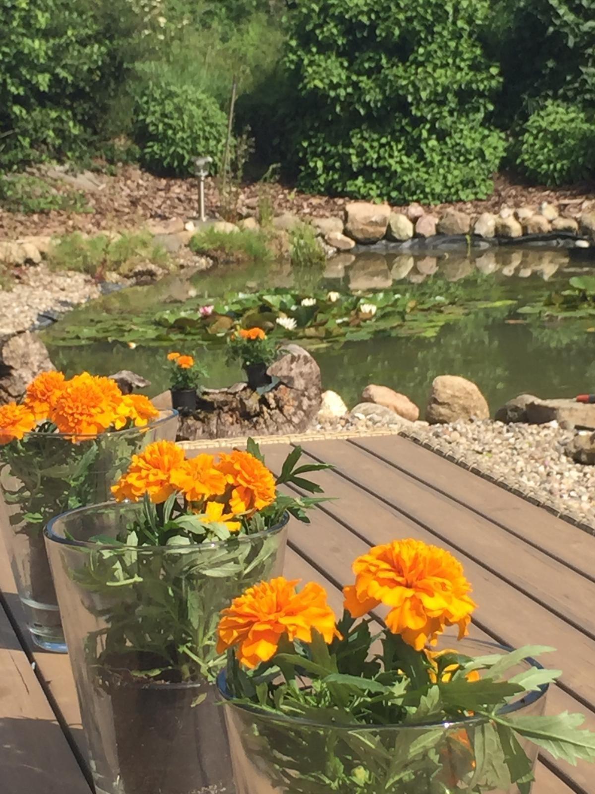 Im großen Garten finden sie einen großzügigen Teich und pro Wohnung zwei große Terassen und im oberen Bereich zwei Balkone für unsere Gäste. Der große Balkon wird gemeinsam von zwei Appartements genutzt. Die Balkone am Giebel sind für die reine private Nutzung der Gäste. Vom Haus können sie den Blick in die Natur genießen.