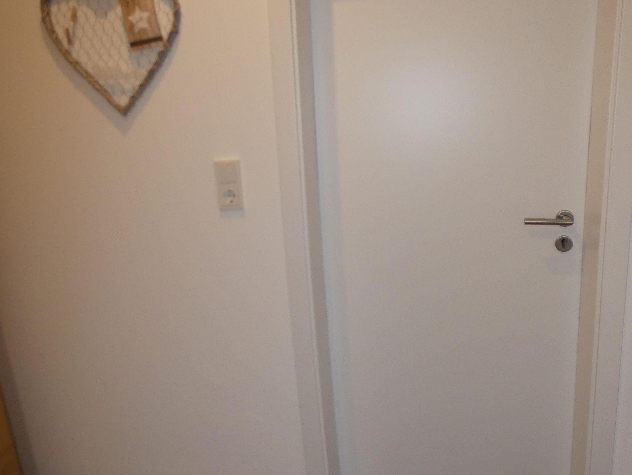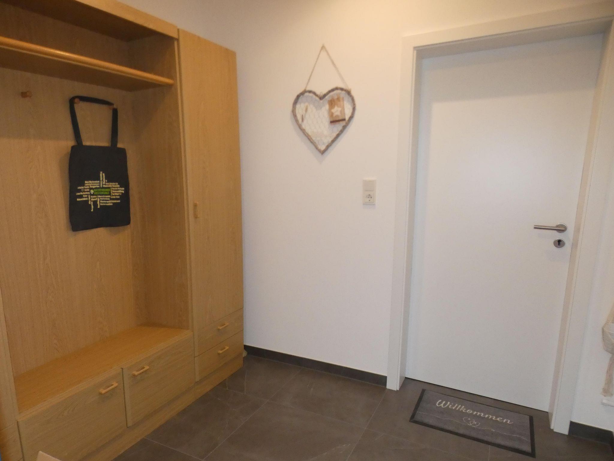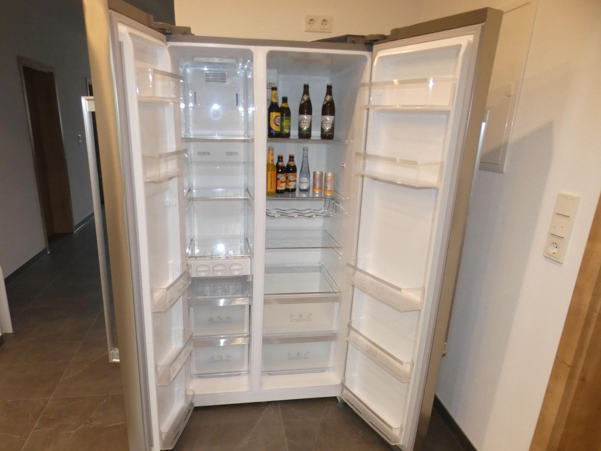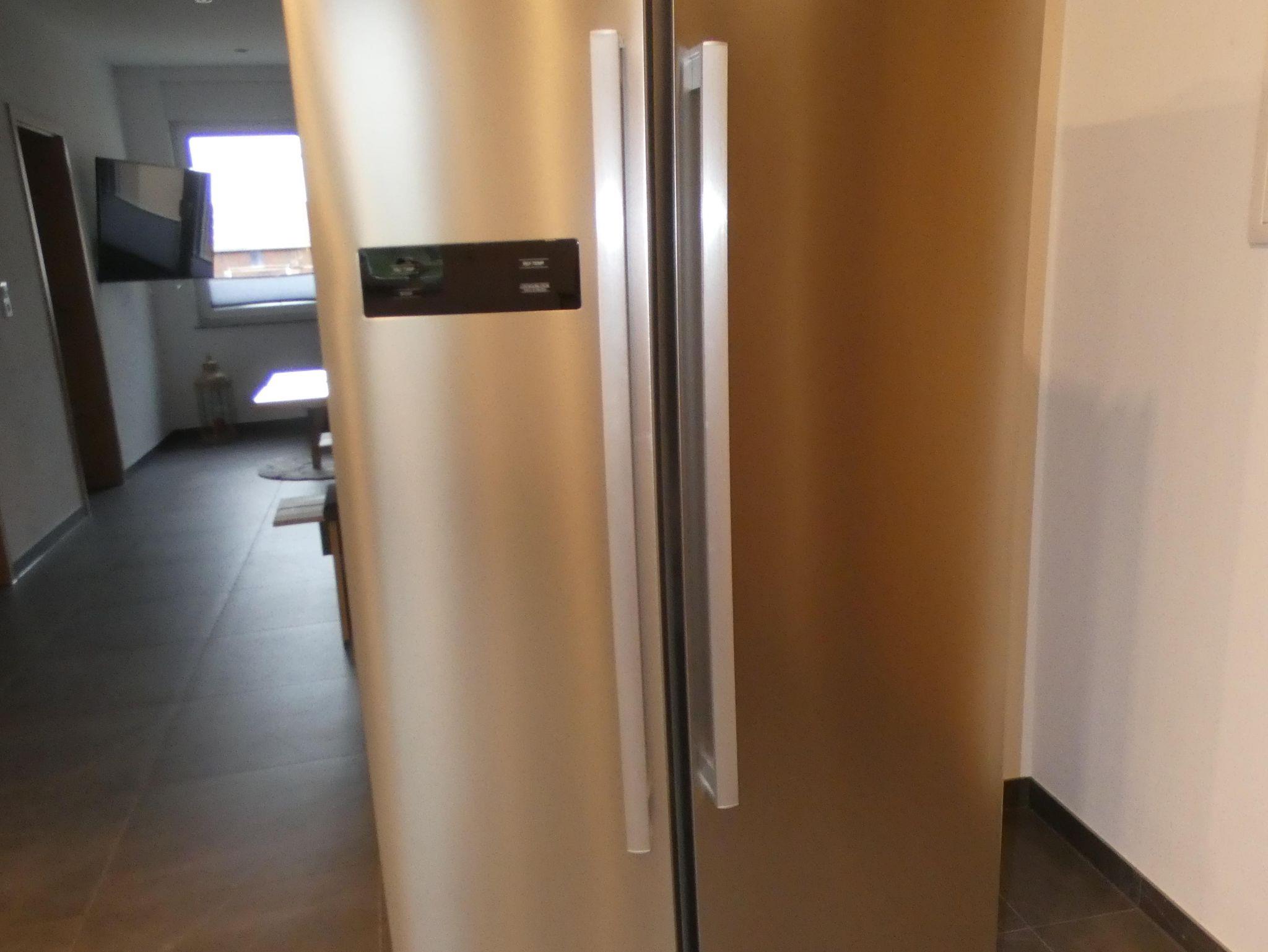 Die Wohnung beginnt mit einem kleinen Flur, mit einer großen Gaderobe. Wenn man die Ferienwohnung betritt, sieht man auf eine schöne schicke Küche und einen Side by Side Kühlschrank.