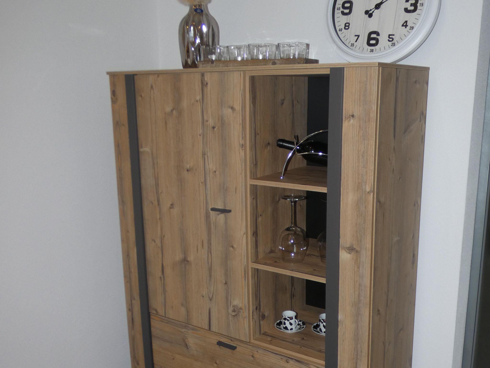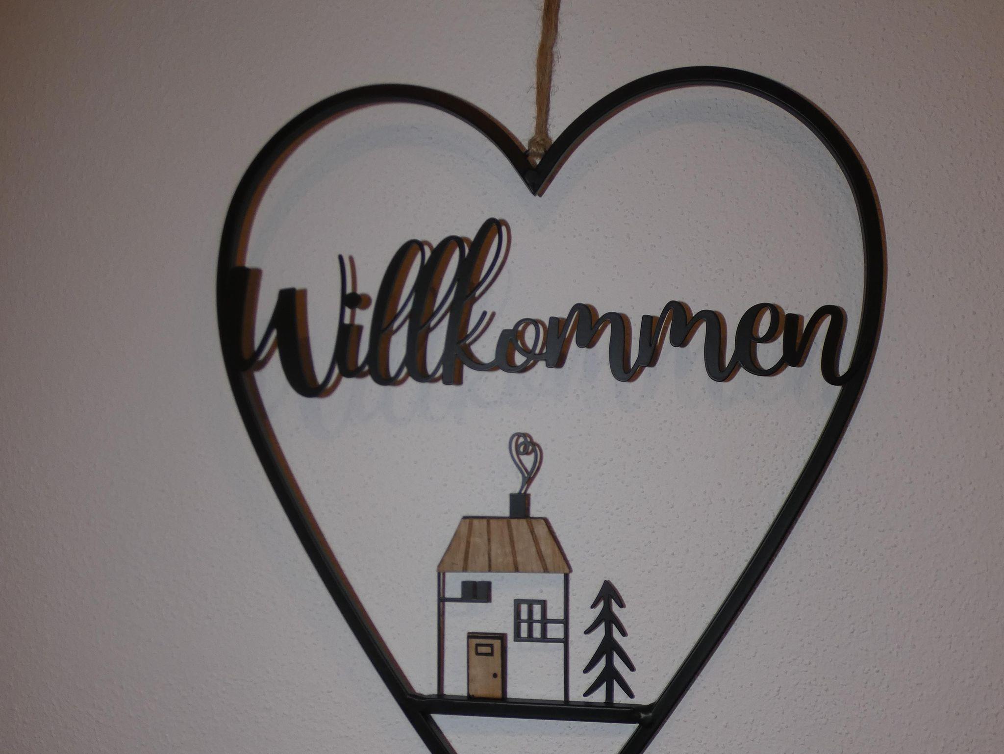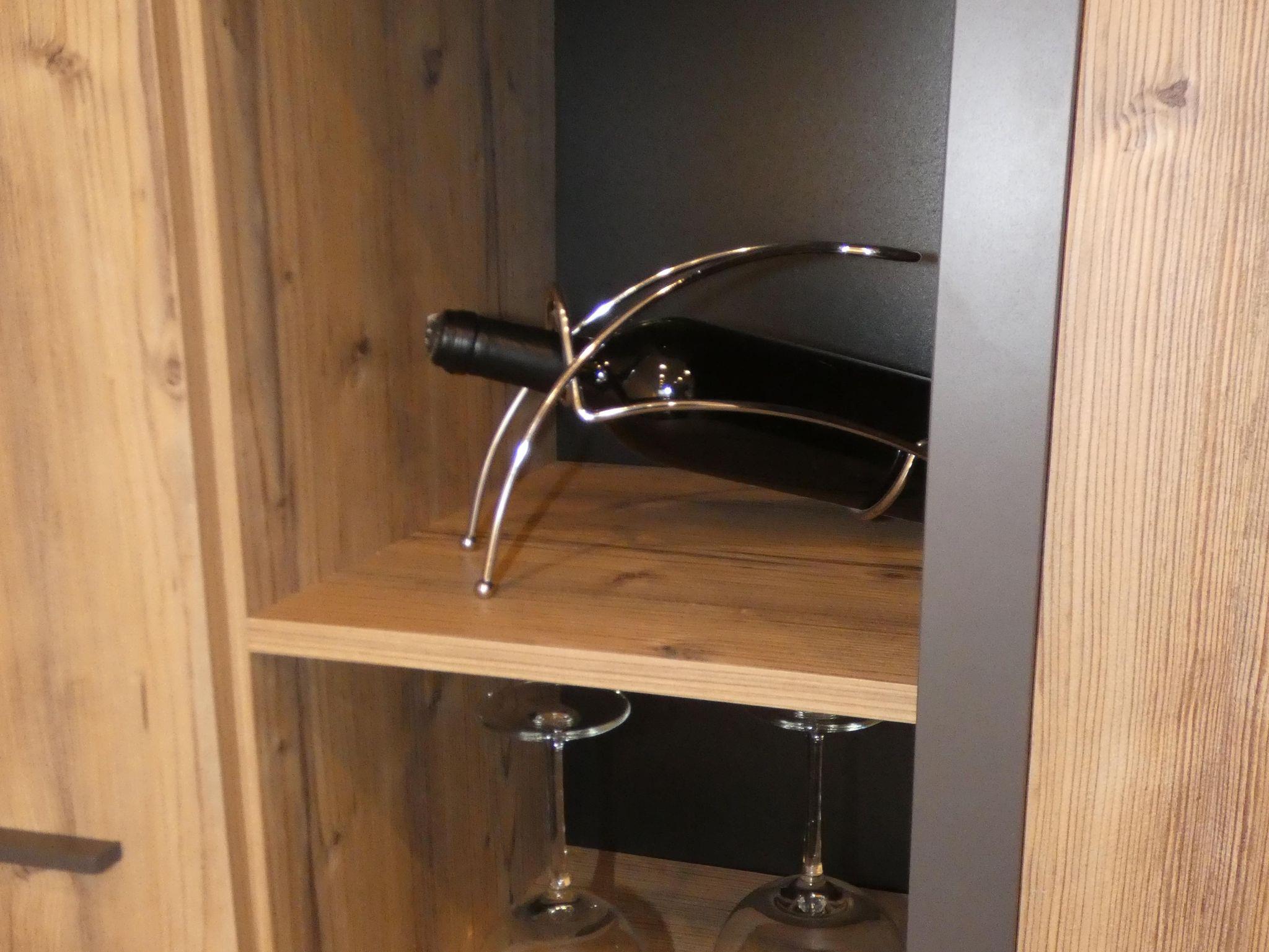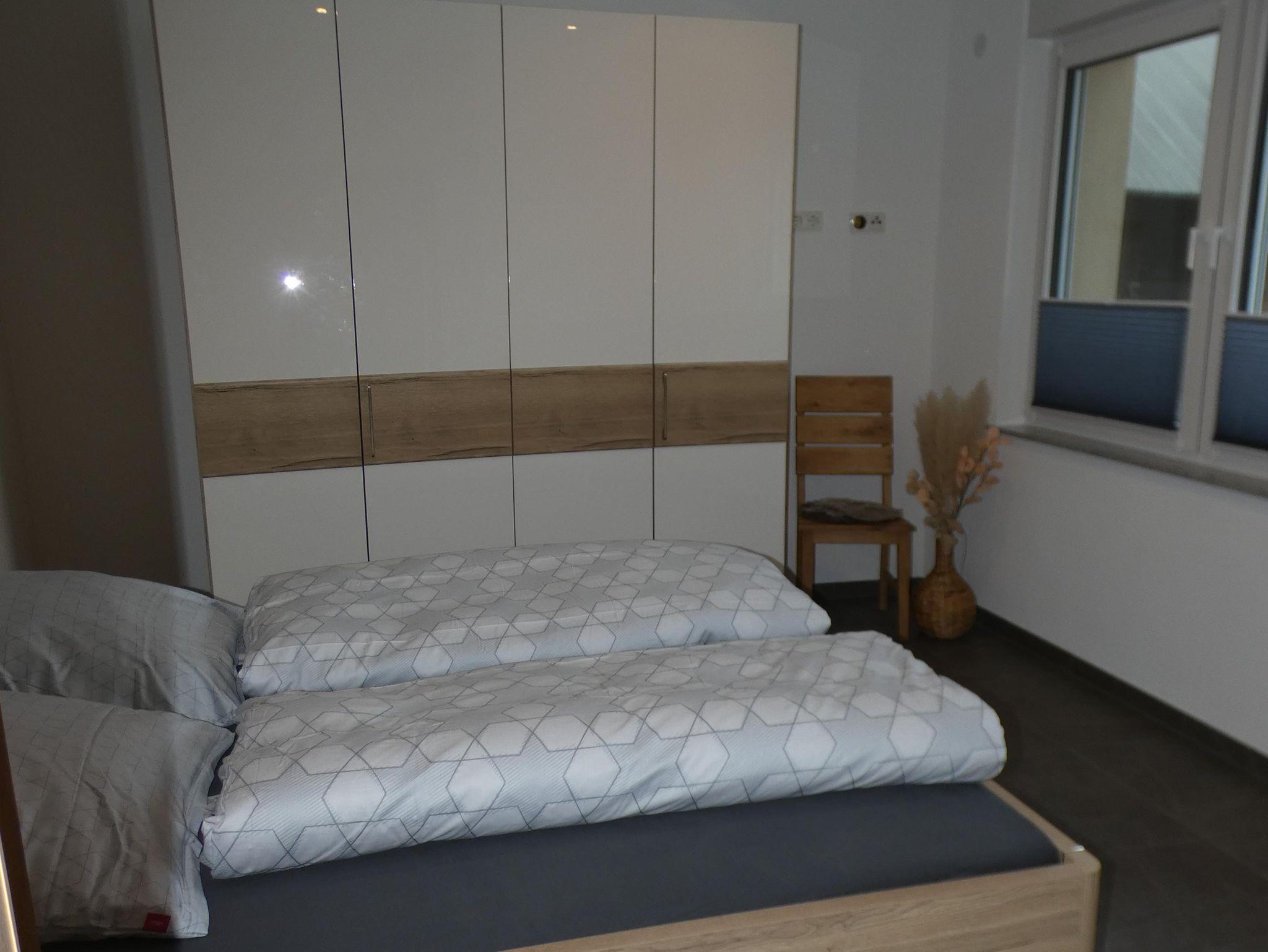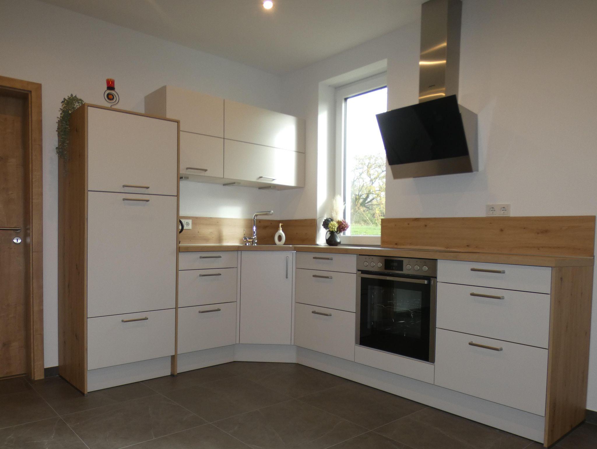 Die Wohnung beginnt mit einem kleinen Flur, mit einer großen Gaderobe. Wenn man die Ferienwohnung betritt, sieht man auf eine schöne schicke Küche und einen Side by Side Kühlschrank.