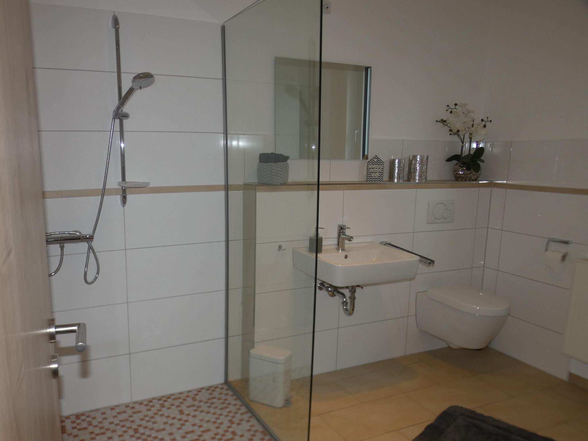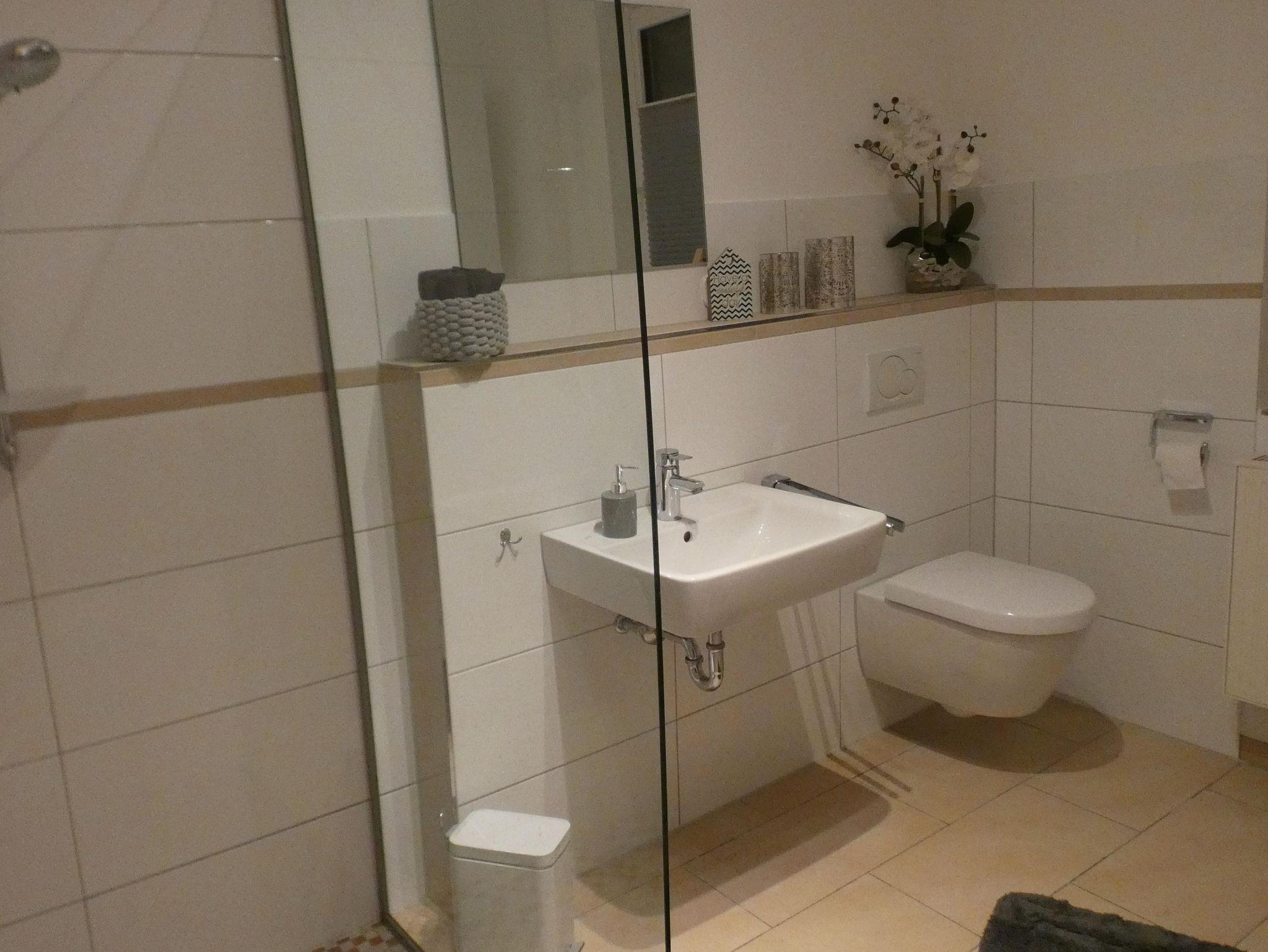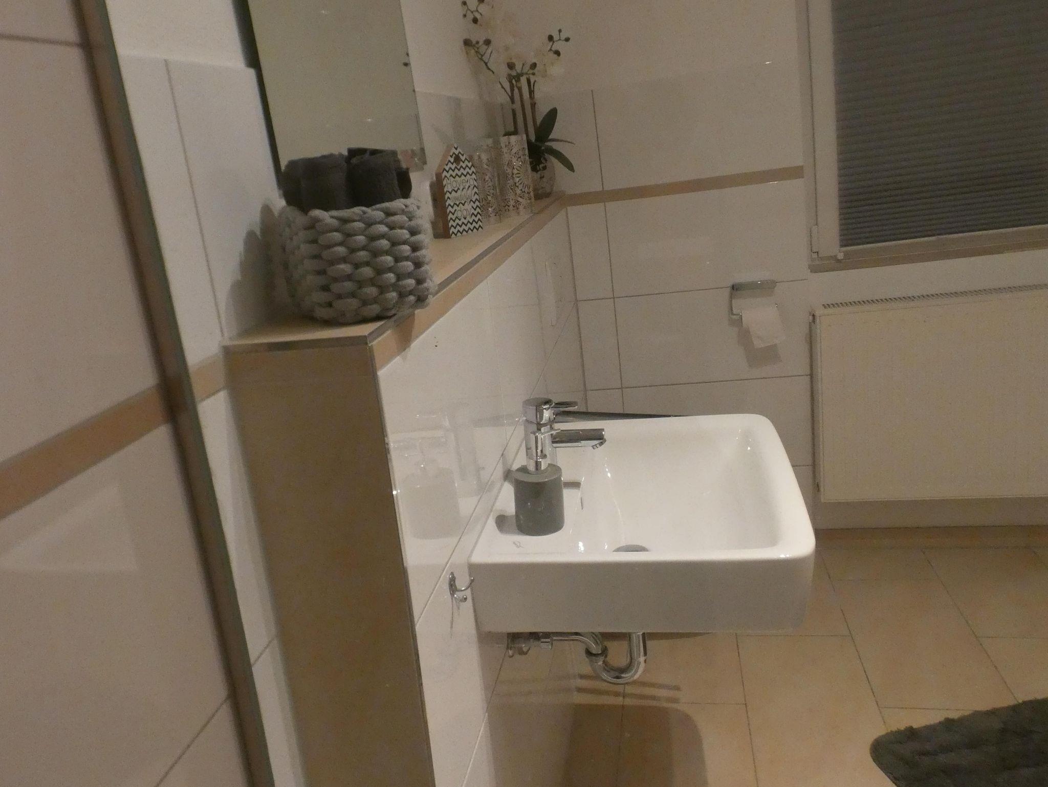 Geradeaus weiter ist das nächste Zimmer, in dem das Bad mit Dusche untergebracht ist.