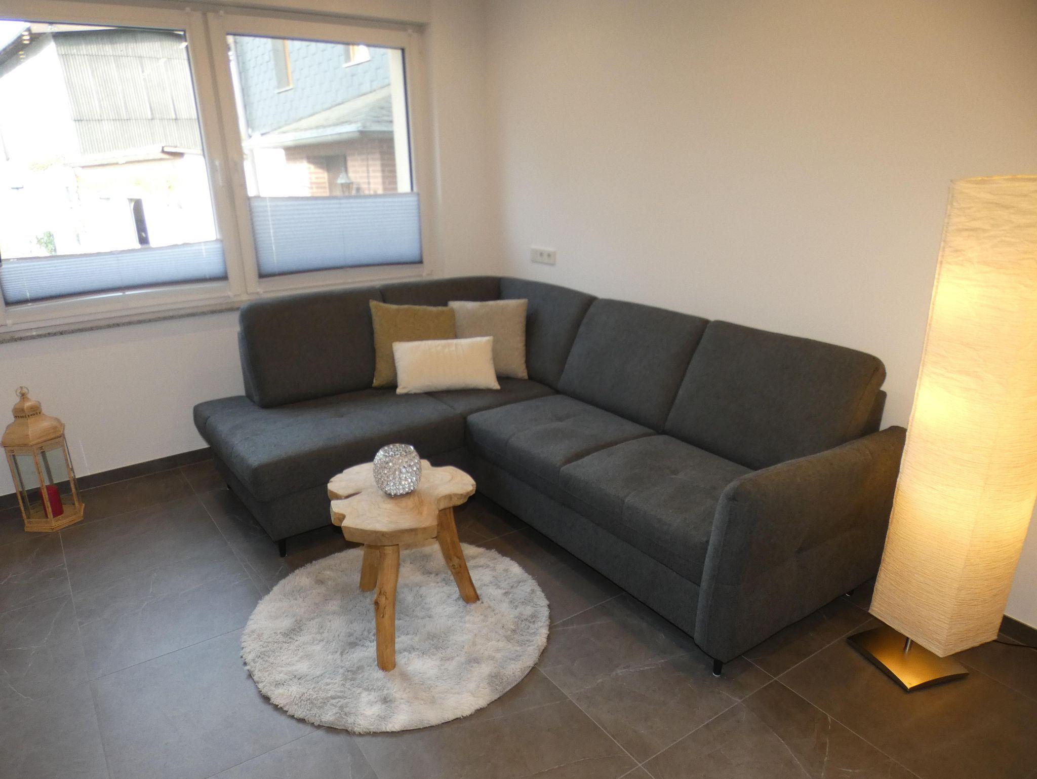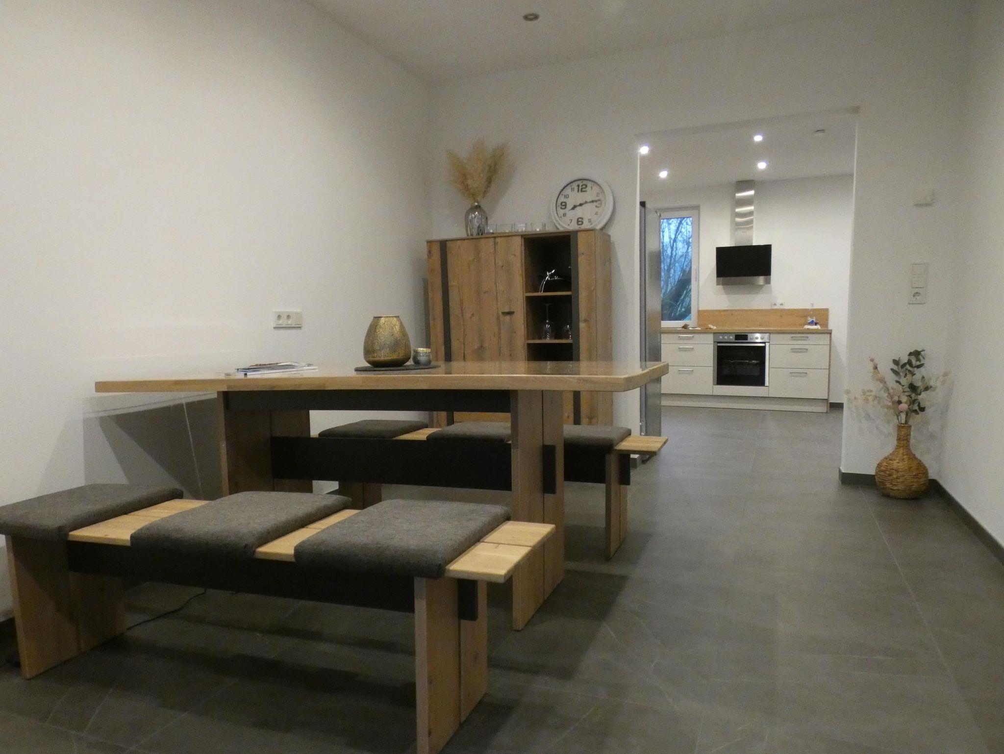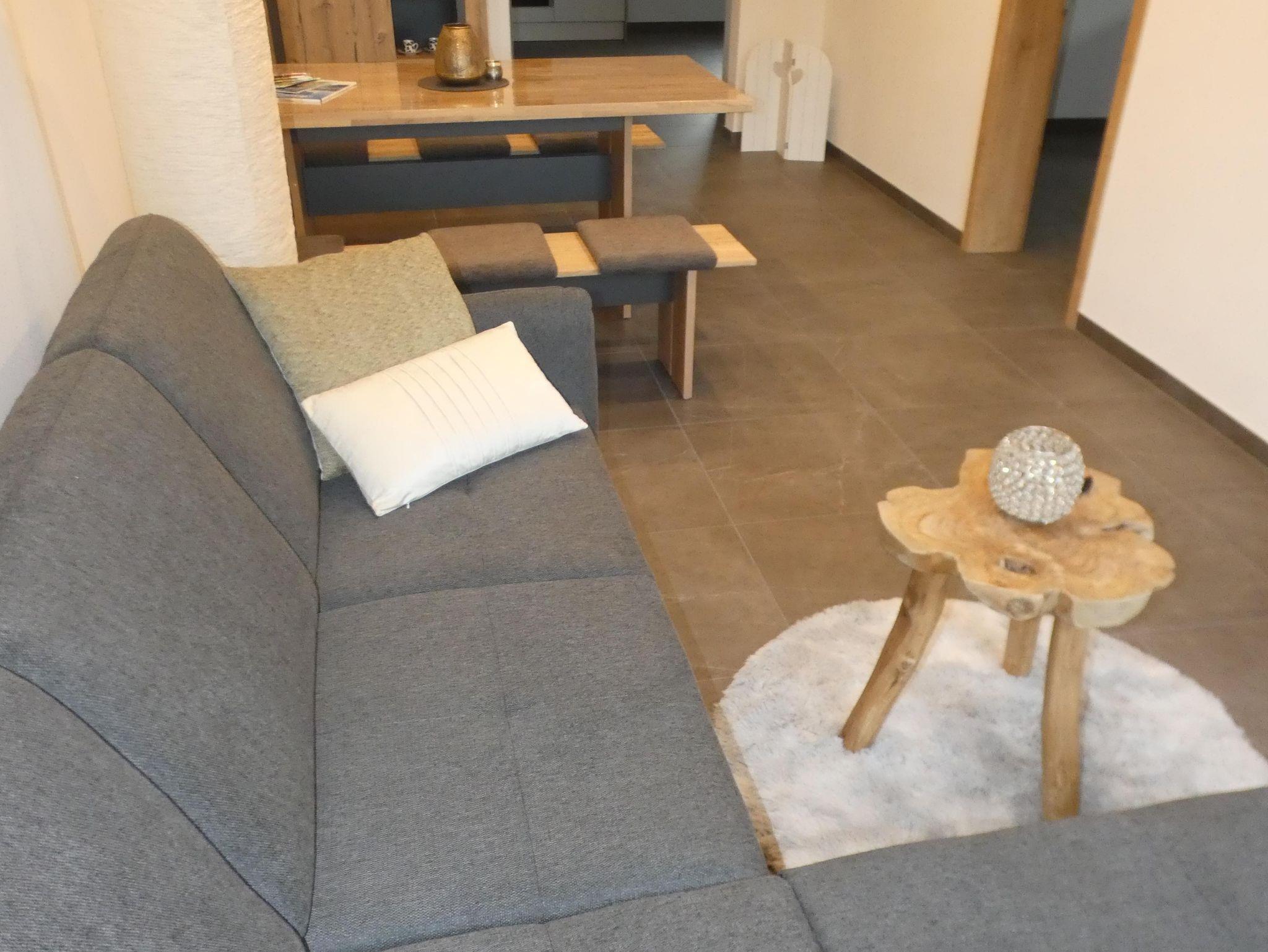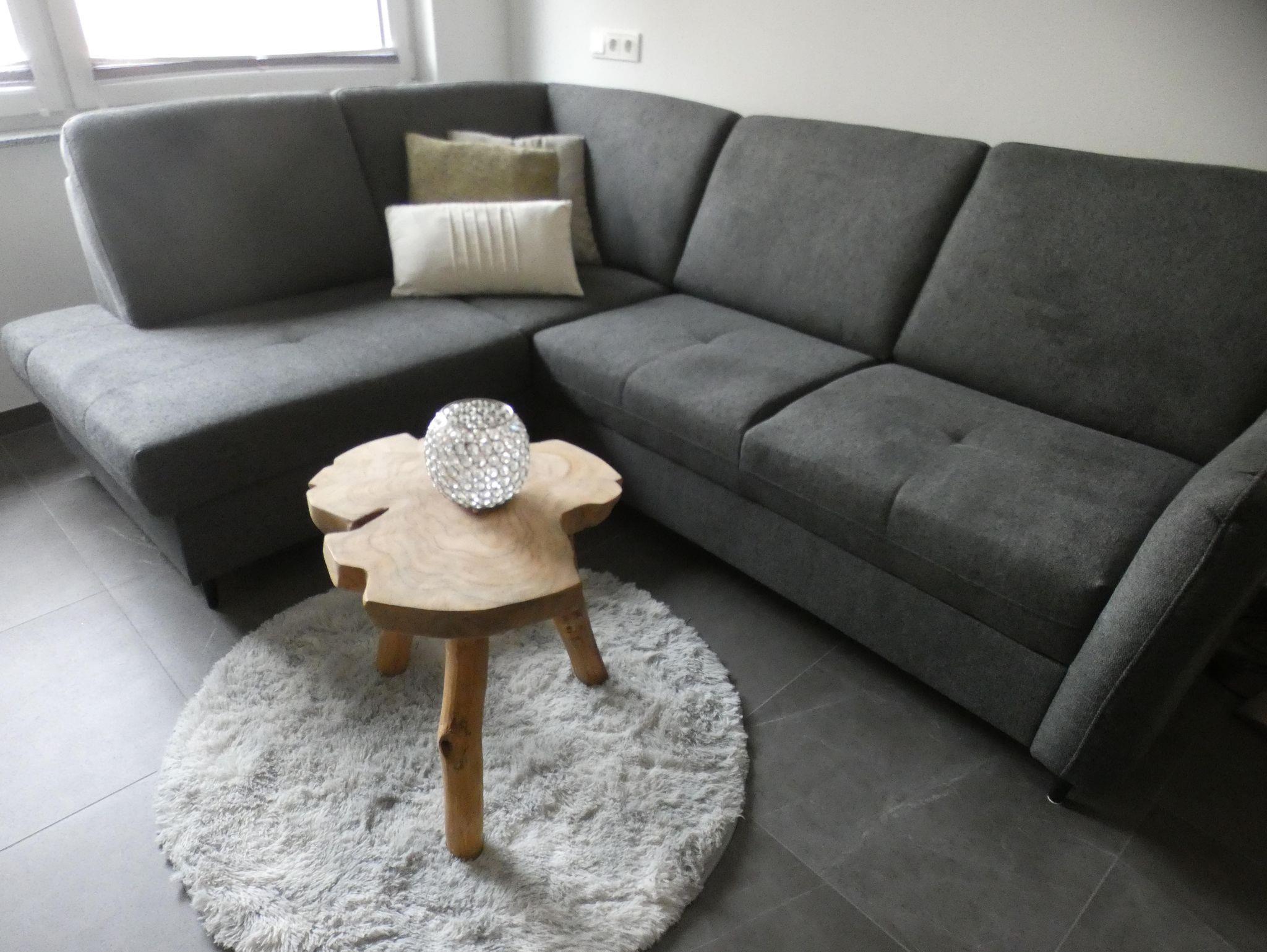 Wenn man in der Küche links abbiegt kommt man in den Wohn- und Esszimmerbereich. In diesem befindet sich ein großer Tisch, an dem mindestens 8 Personen Platz finden. Auch ein schönes Ecksofa ist vorhanden, auf welchen man es sich vor dem hängenden Fernseher gemütlich machen kann. Falls doch mal mehr Kinder mitfahren sollten, kann man das bequeme Sofa auch ausziehen und hat somit nochmals Platz für 2 weitere Kinder.