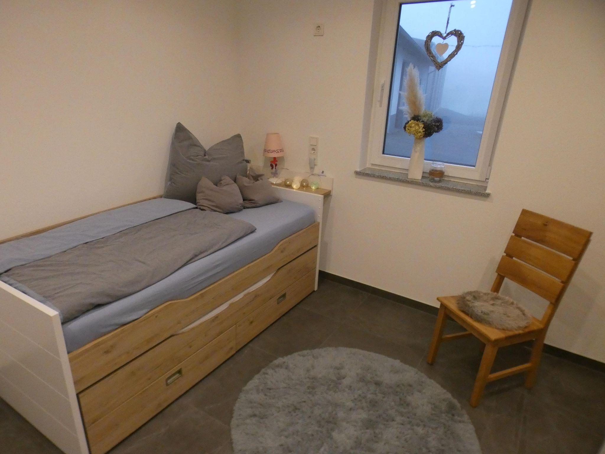 Vom offenen Wohnbereich im Wohnzimmer ist der Zugang zum Elternschlafzimmer und zum Kinderzimmer.