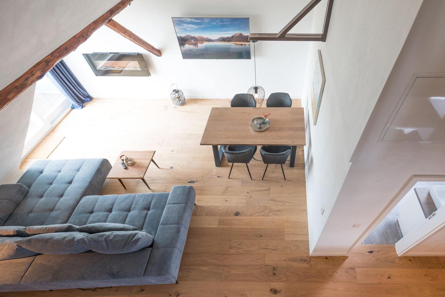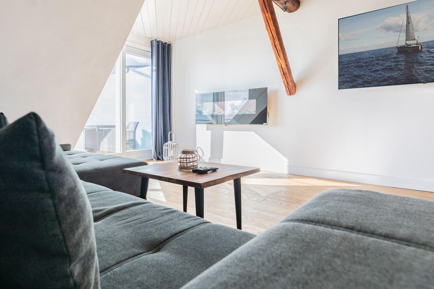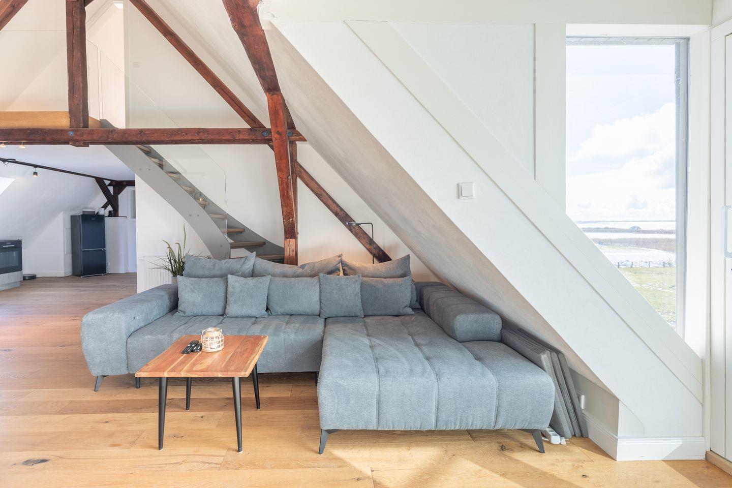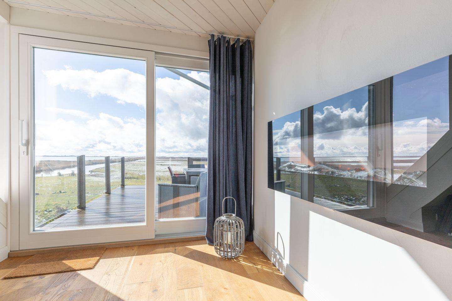 Über ein Treppenhaus (Deich-hoch, geschlossene Stufen) gelangen Sie in die 90 qm große Ferienwohnung. Sie bietet Ihnen einen großzügigen, lichtdurchfluteten Wohn-Essbereich mit großem TV und Musikanlage. Genießen Sie vor dem prasselnden Elektro-Kaminofen ein spannendes Buch und schauen Sie einfach raus in die beeindruckende Landschaft. Die schönen Dielenböden geben Ihnen ein behagliches Wohngefühl.