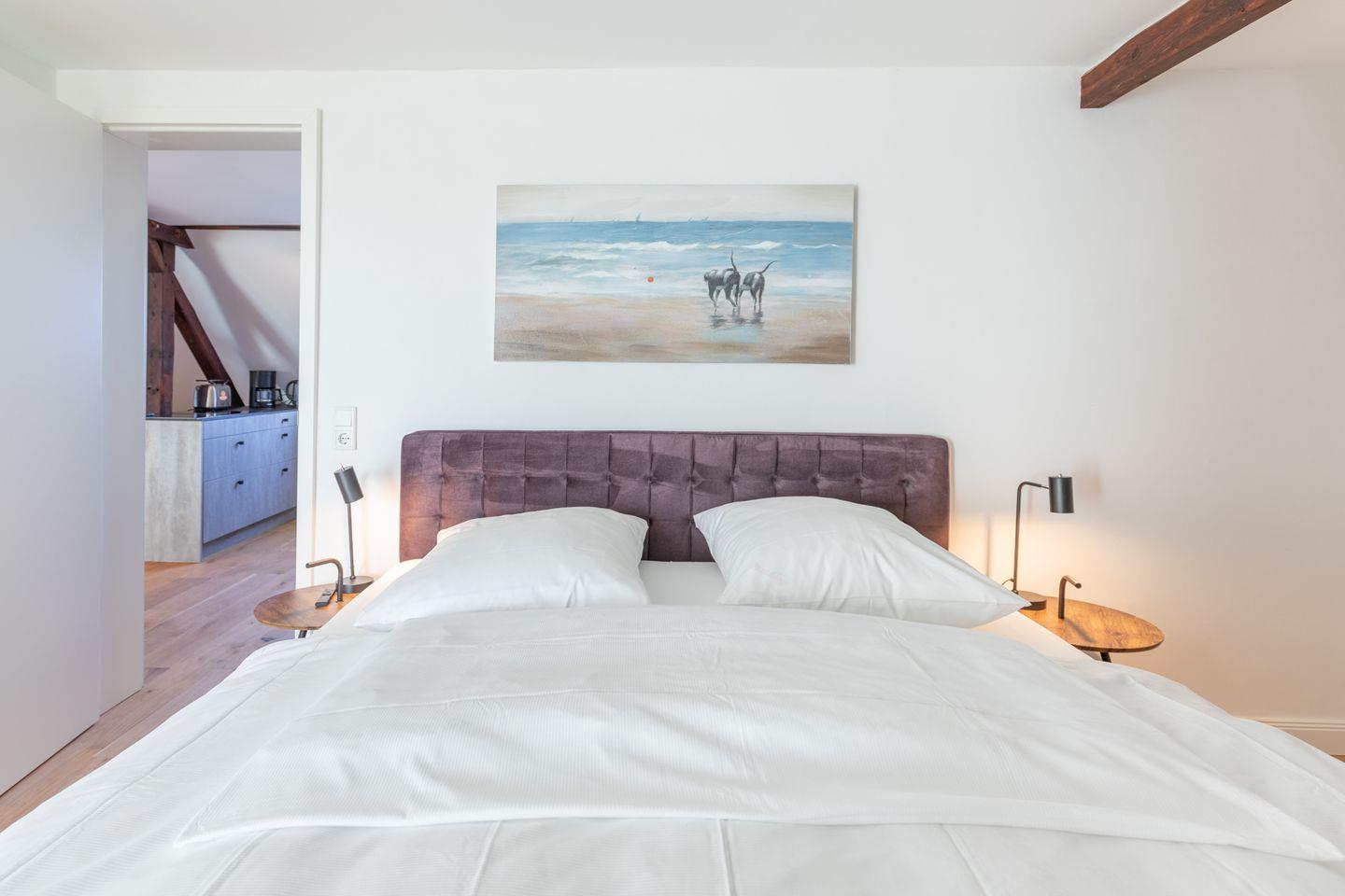 Das Schlafzimmer ist mit einem Boxspringbett (180 x 200) ausgestattet.
