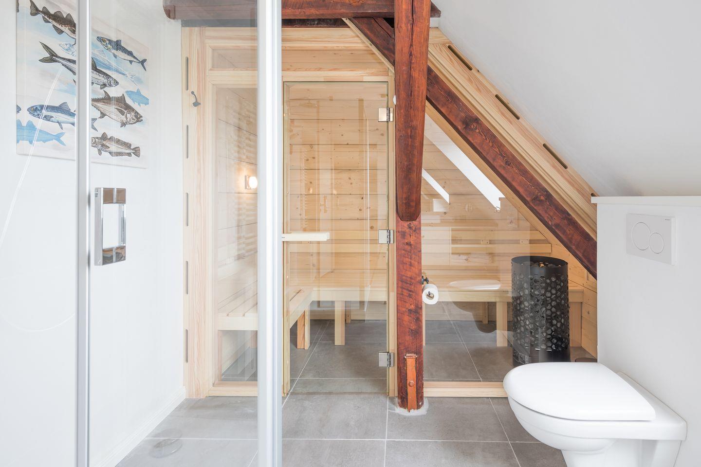 Das moderne Duschbad, von dem Sie ebenfalls einen atemberaubenden Ausblick auf die Arlau haben, wird durch eine geräumige Sauna getoppt.