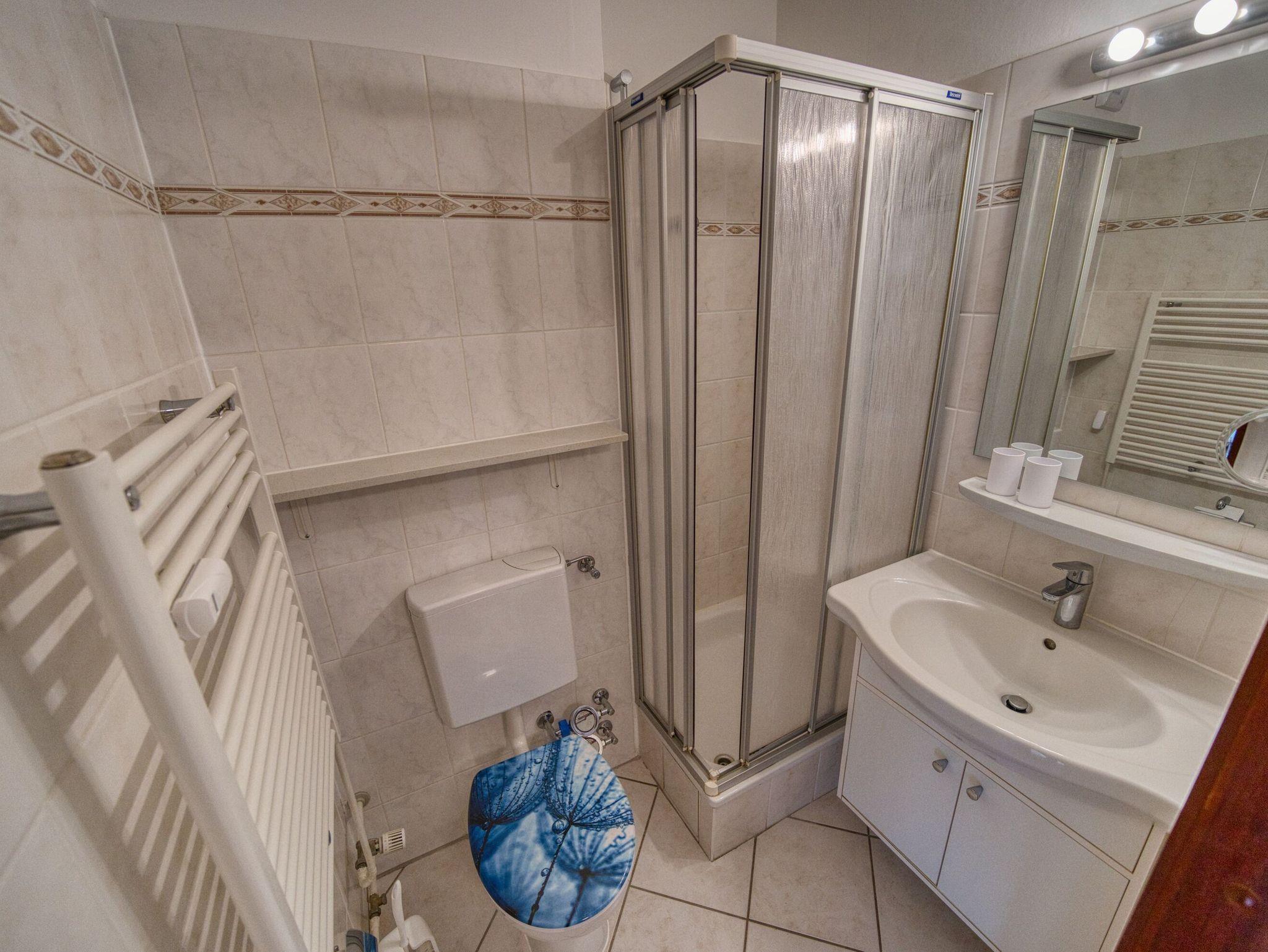 Badezimmer mit Duschkabine, WC und Handtuchtrockner
