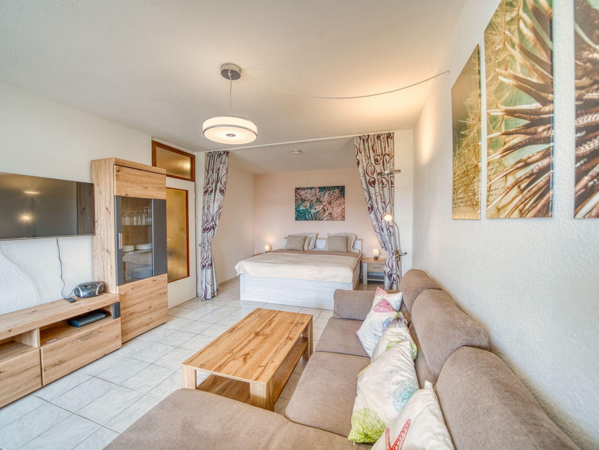 Wohn-Schlafraum mit Doppelbett, Ecksofa, Esstisch vor dem Balkon und Smart-TV